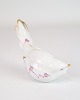 Fugl optimisten fra Royal Copenhagen i klassisk musselmalet porcelæn med håndmalet blomstermotiv. Næb og vingespidser er forgyldt og tilføjer et elegant udtryk til de lyserøde håndmalet blomstermotiver til den hvide porcelæn.