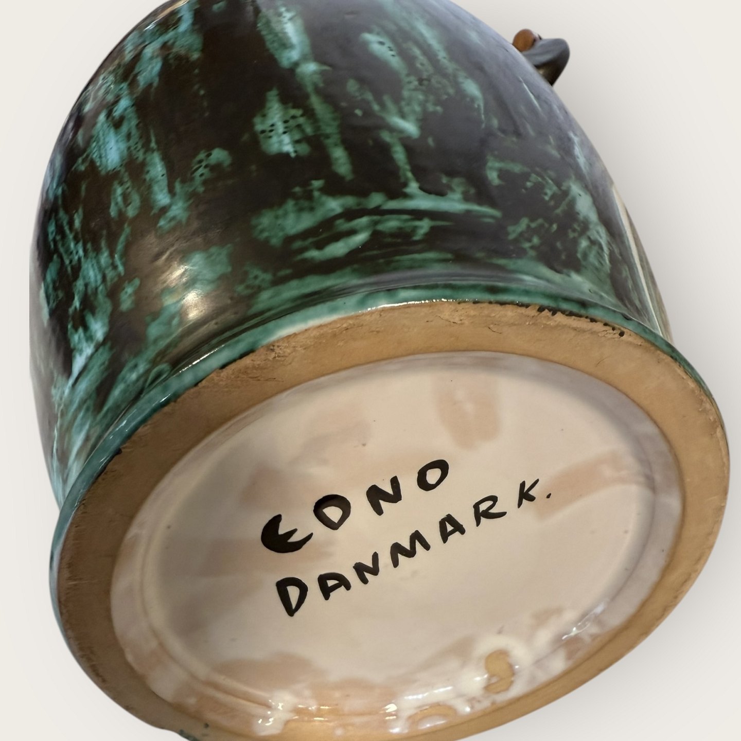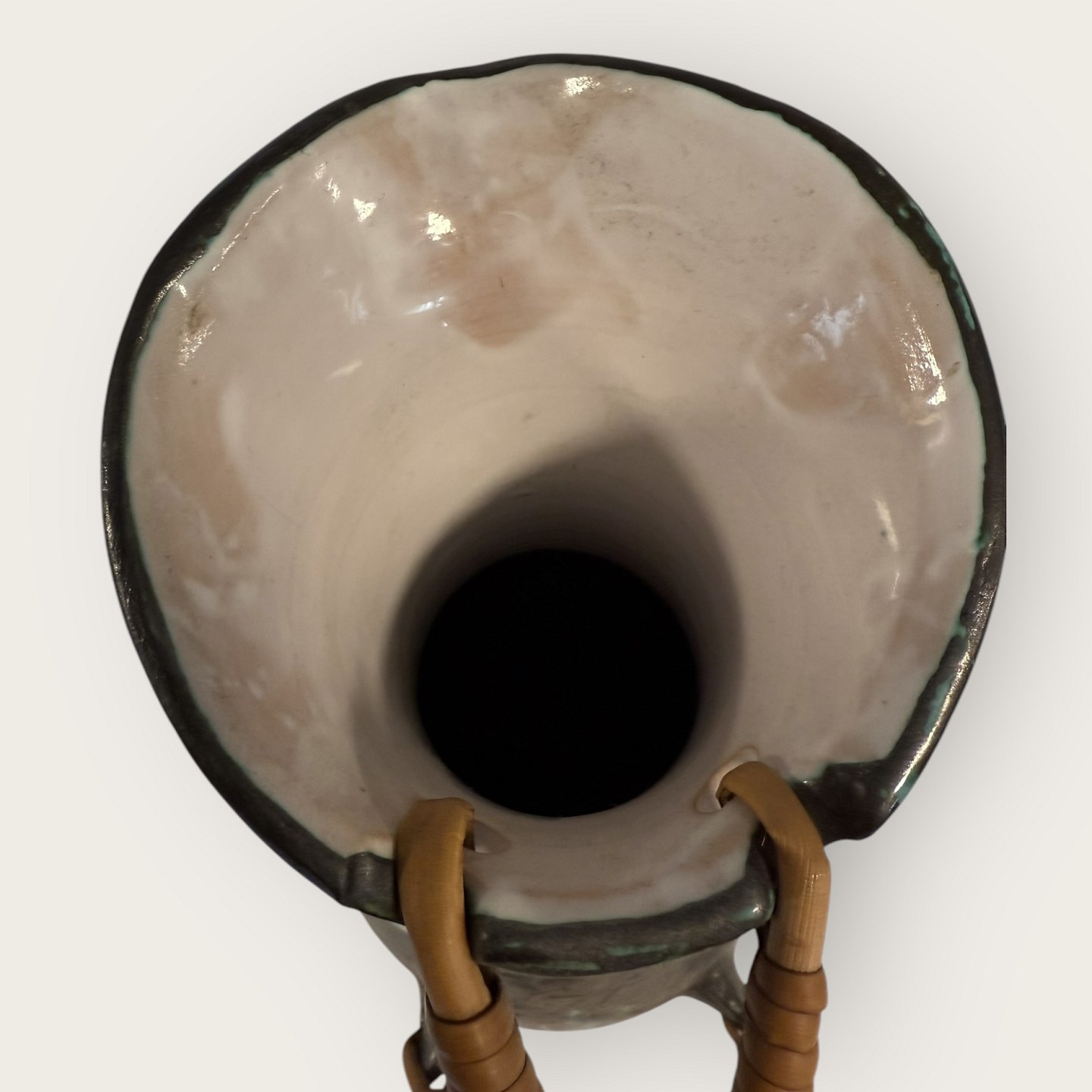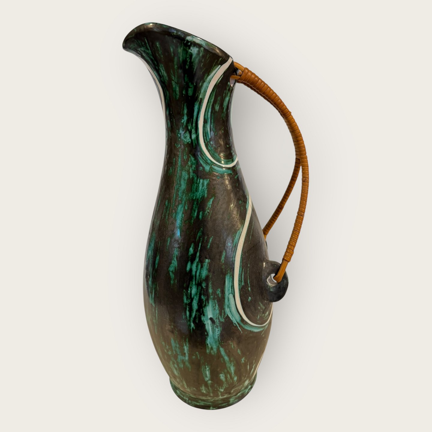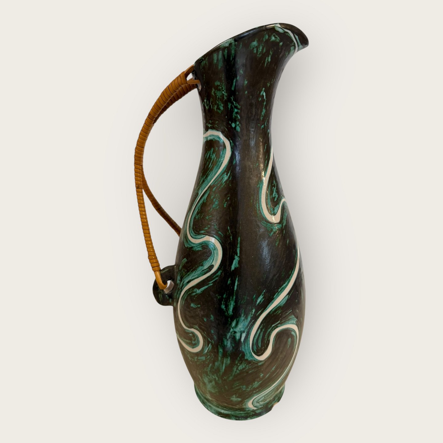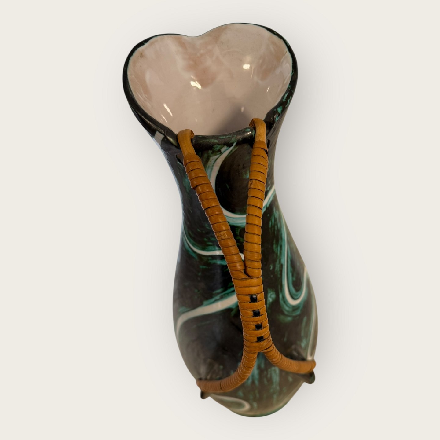 EDNO keramik Danmark, Stor retro gulvvase med basthank, Enkelt lille afslag ved bunden (se foto) ellers rigtig pæn stand, Højde 45 cm