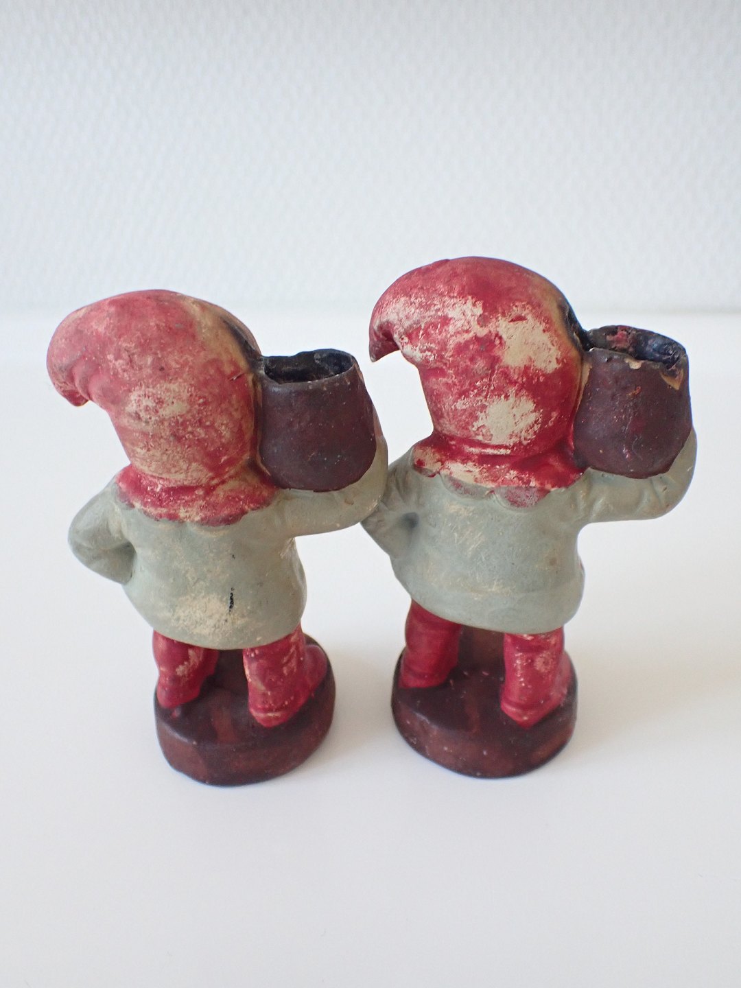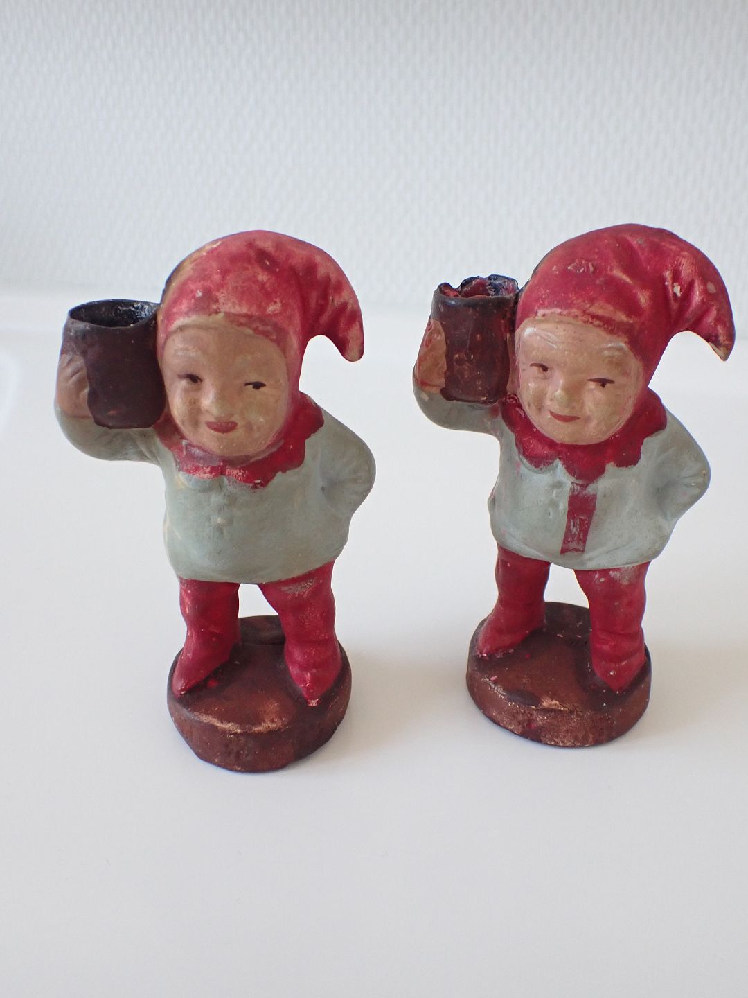 Et par tidlige håndmalede gipsnisser med lyseholdere fra Bornholm i 1920-erne.Højde: 10 cm. I tidstypisk stand med mærker på huerne efter nedbrændte lys. Sælges enkeltvis for 450 kr. Parret koster 800 kr.