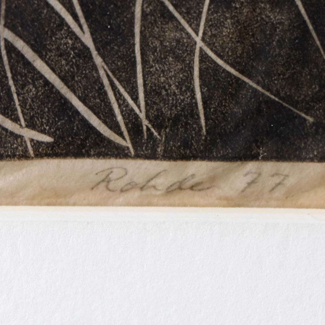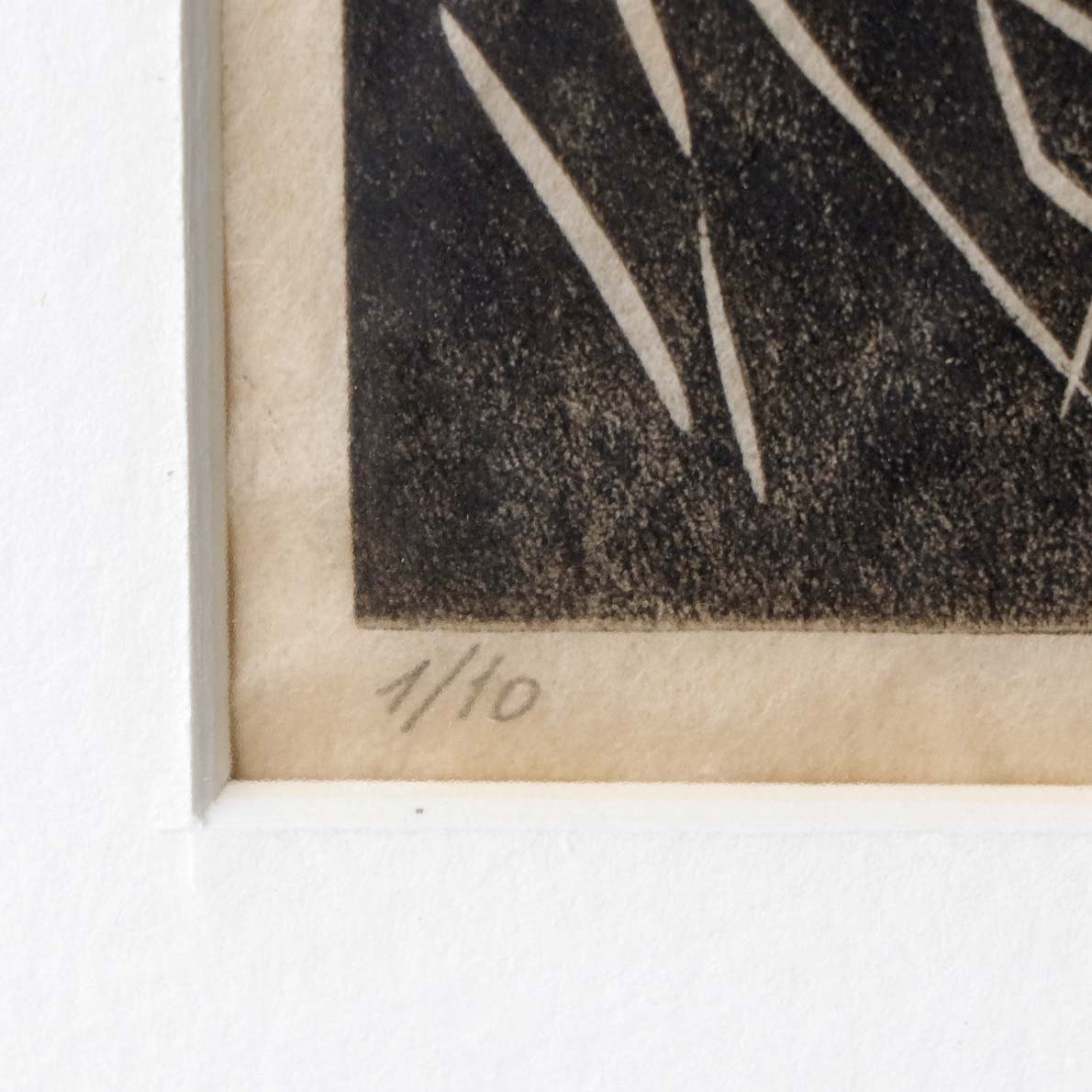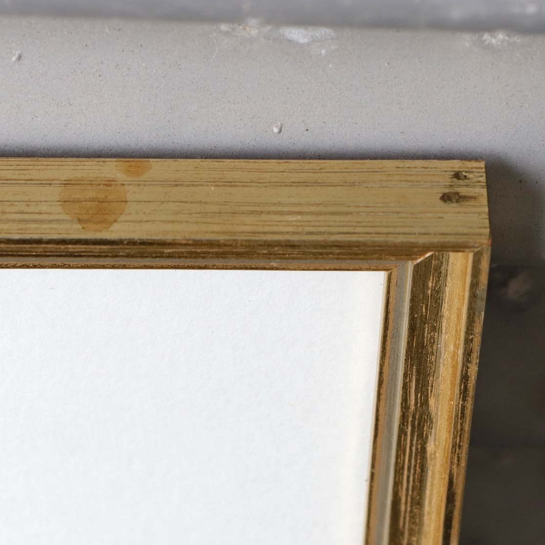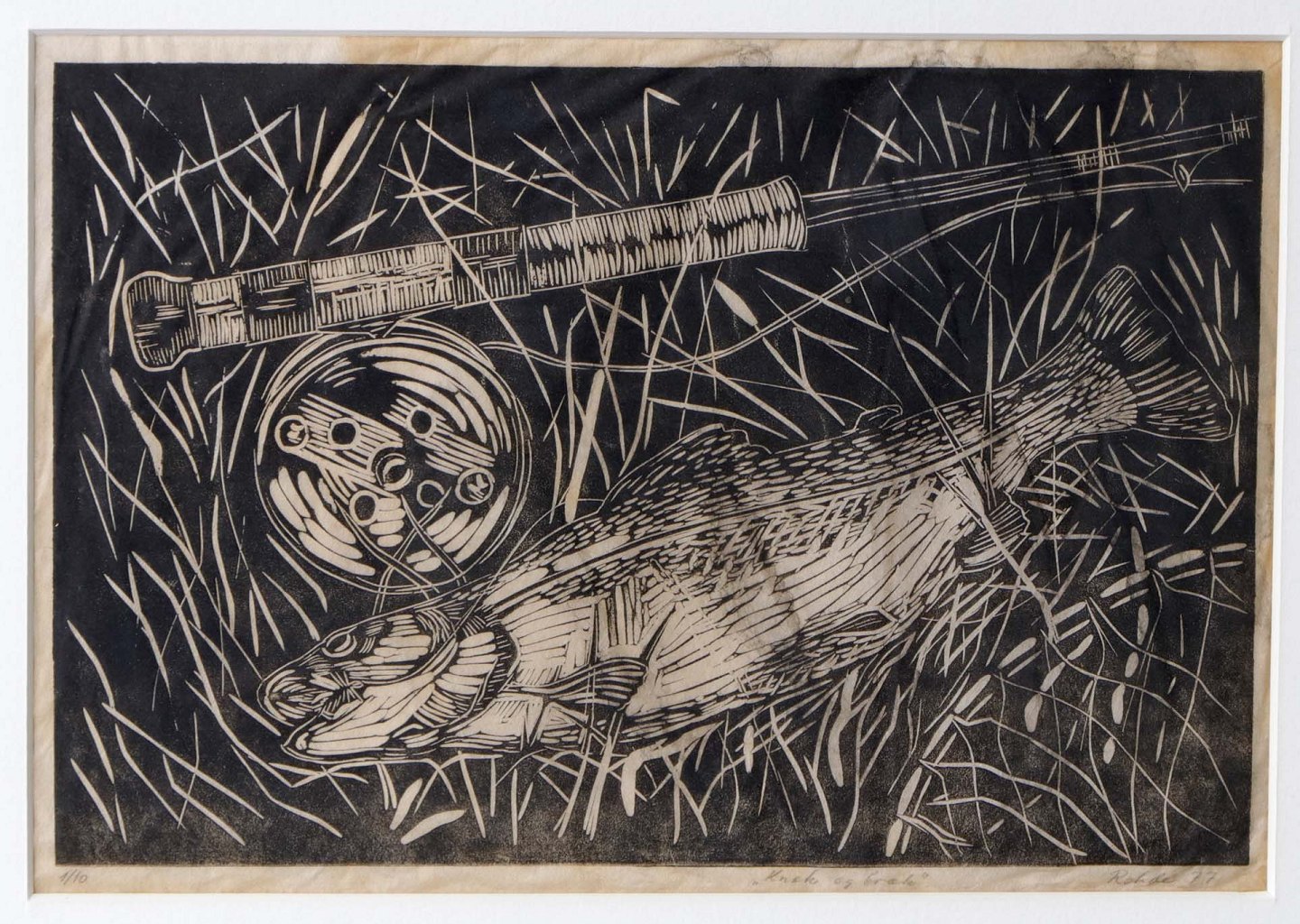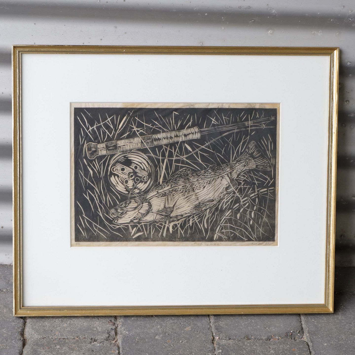 Indrammet grafisk tryk med passpartout i guldmalet træramme med motiv af fisk og fiskestang med titlen Knæk og bræk. Nr. 1 ud af 10 eksemplarer.