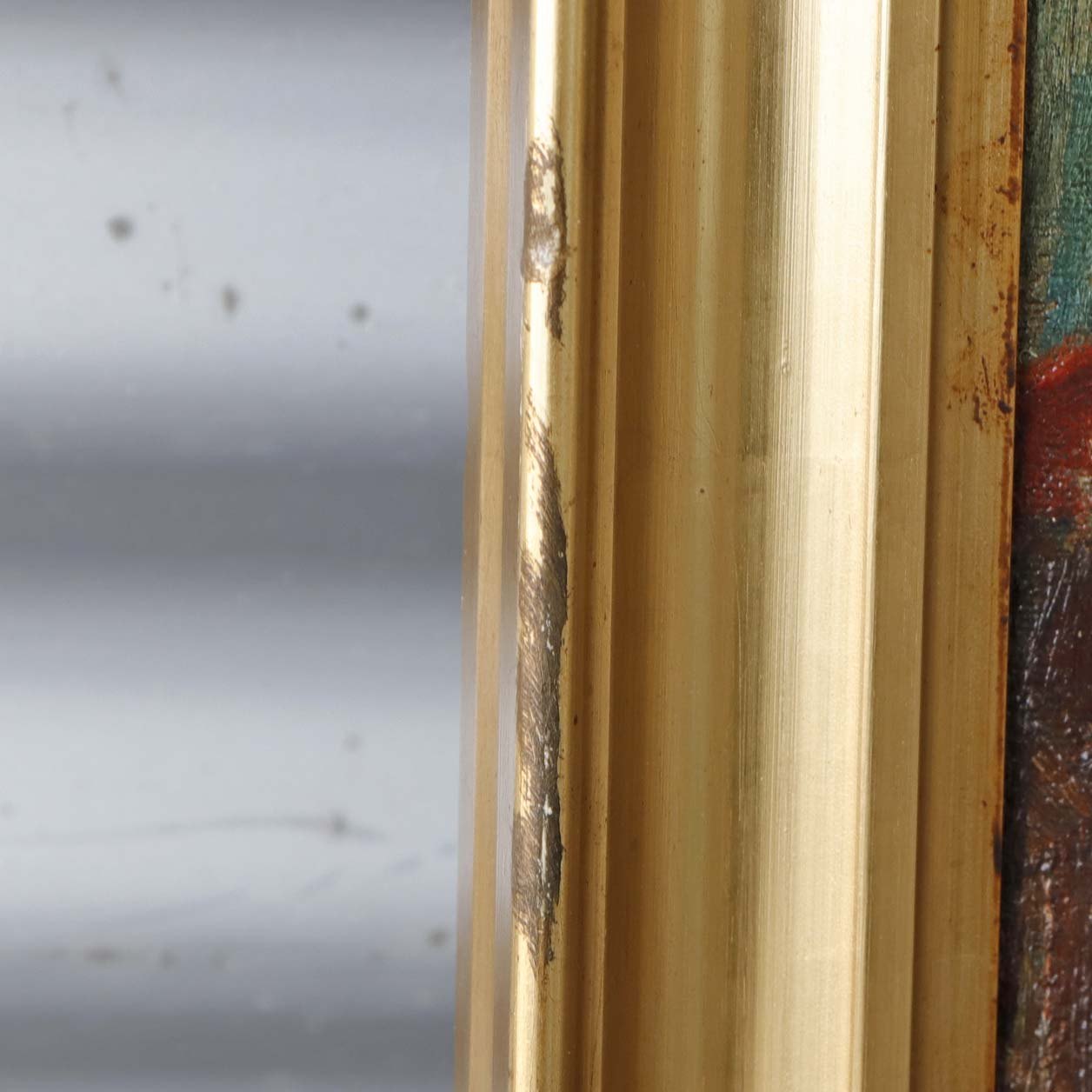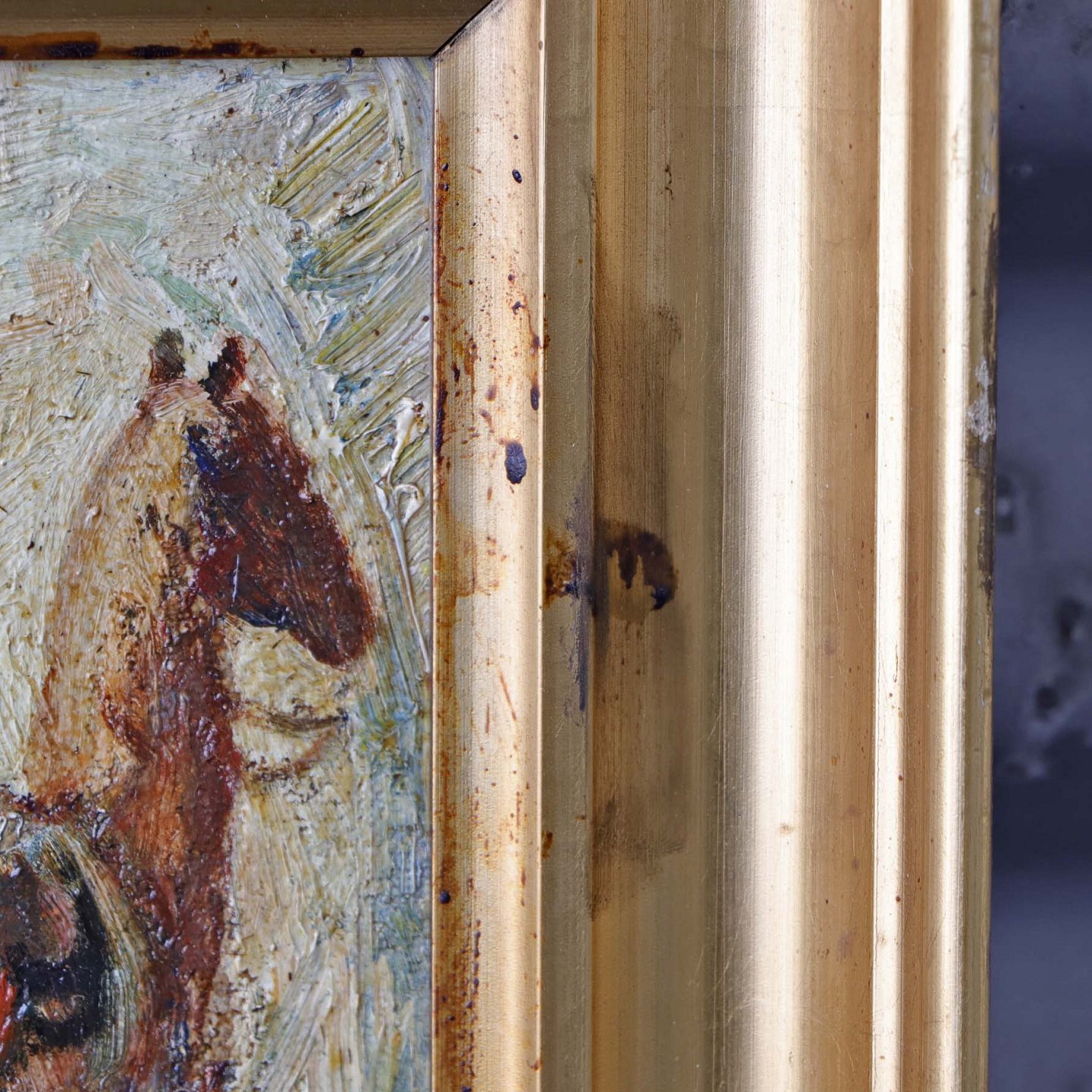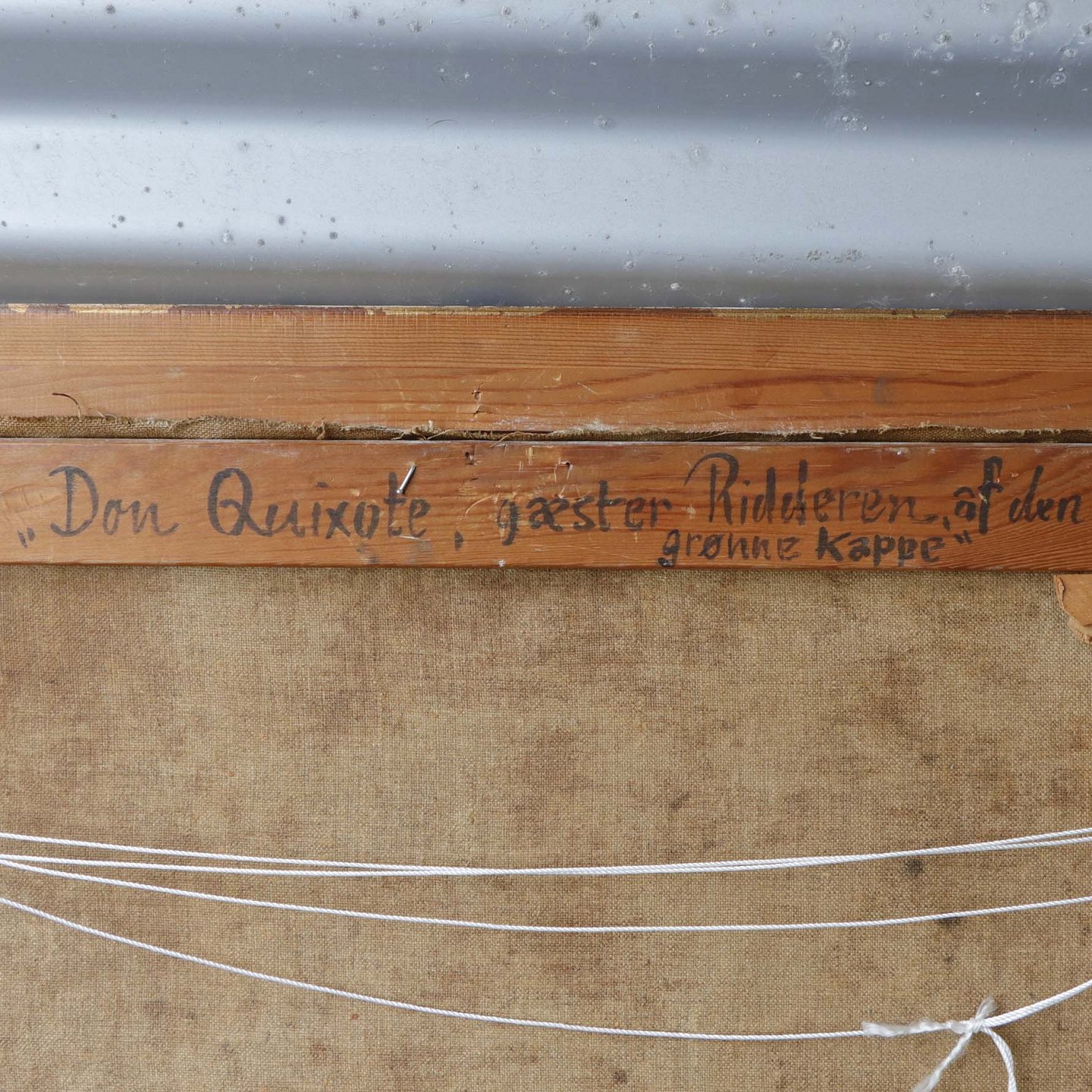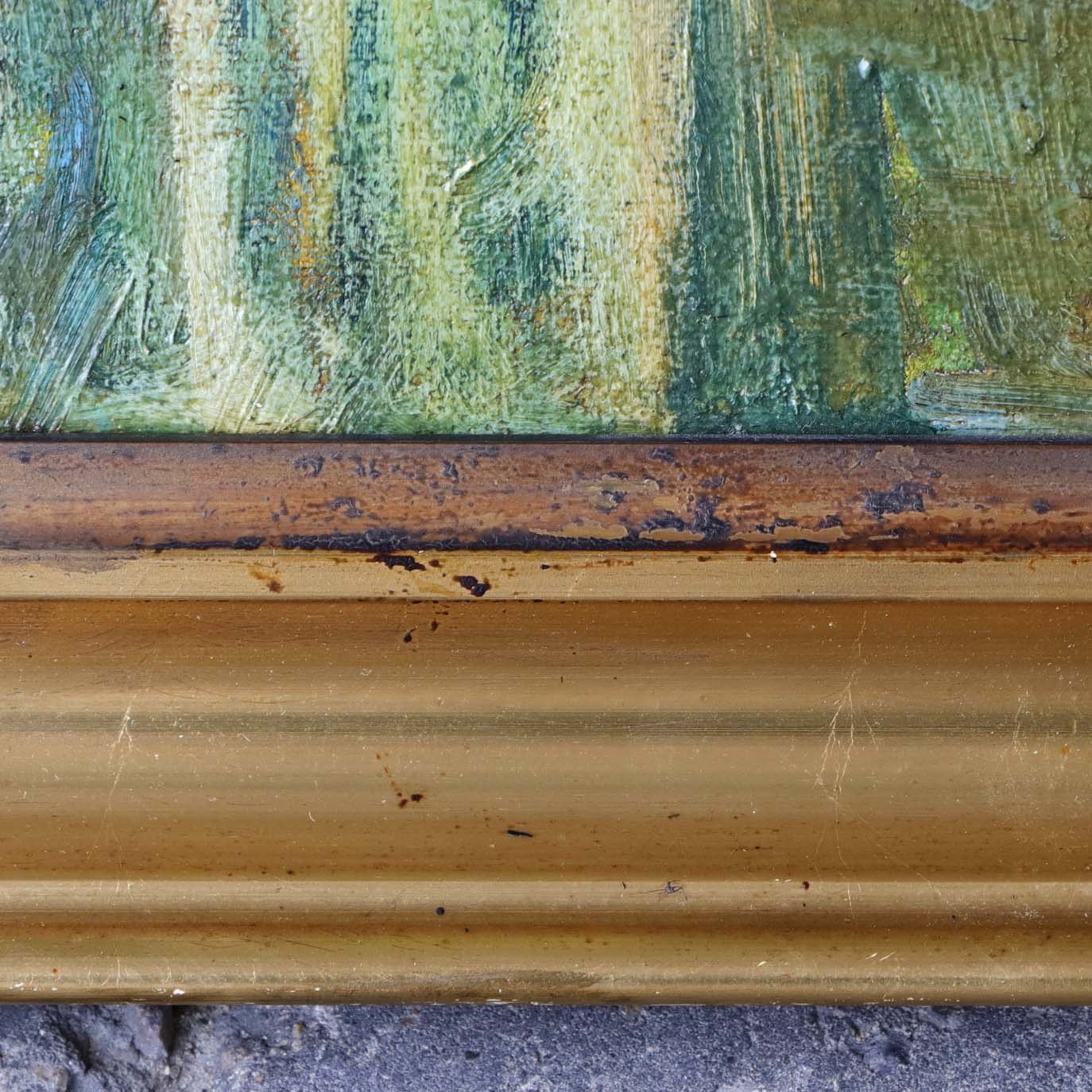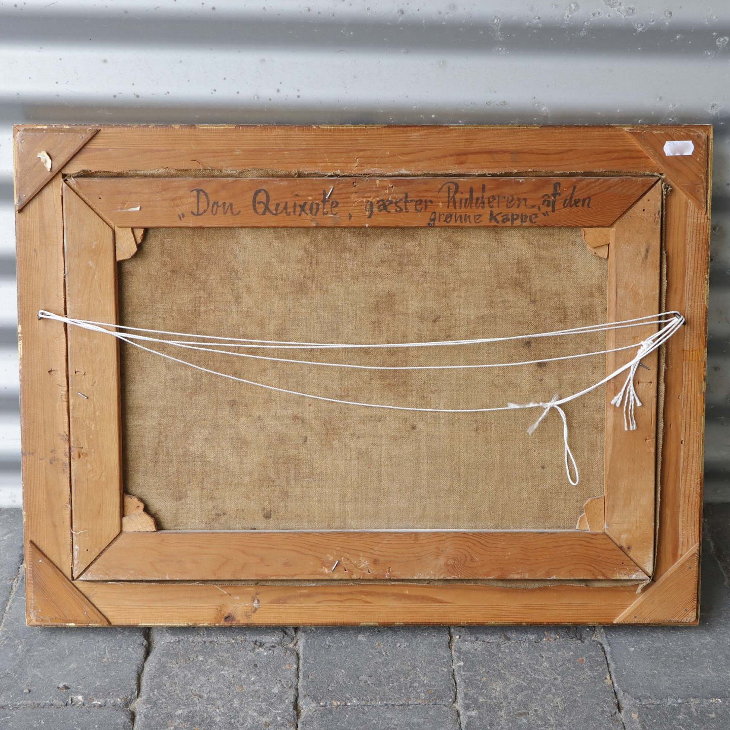 Oliemaleri på lærred i guldmalet træramme med spansk motiv under titlen Don Quixote gæster ridderen af den grønne kappe.