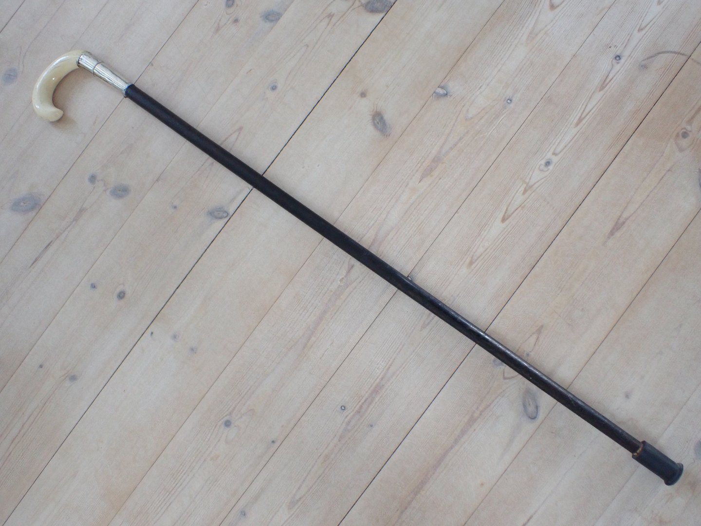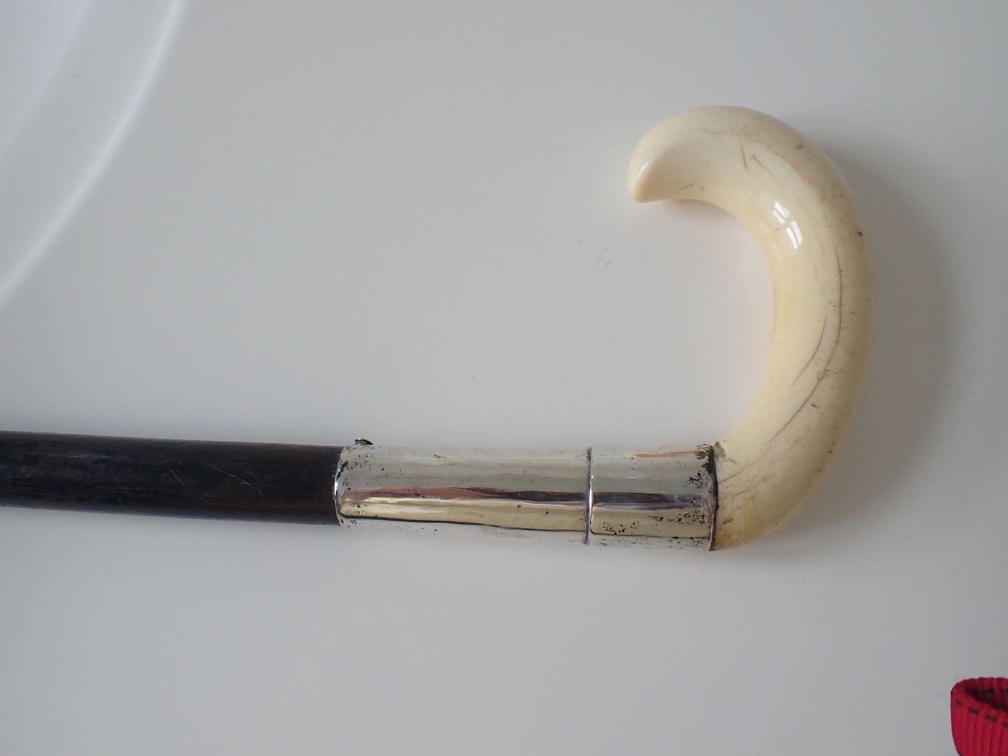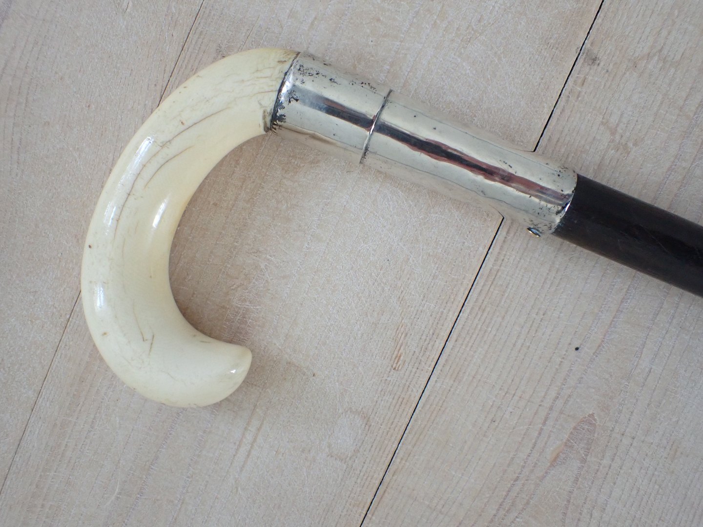 Stok med greb af elfenben isat en bred samling af 830 sølv til en lakeret stok af mahogni og med dupsko af gummi. Dansk? Ca.1900. Længde:92,5 cm. Sælges med CITES-certifikat. I pæn stand med tidstypisk slid.