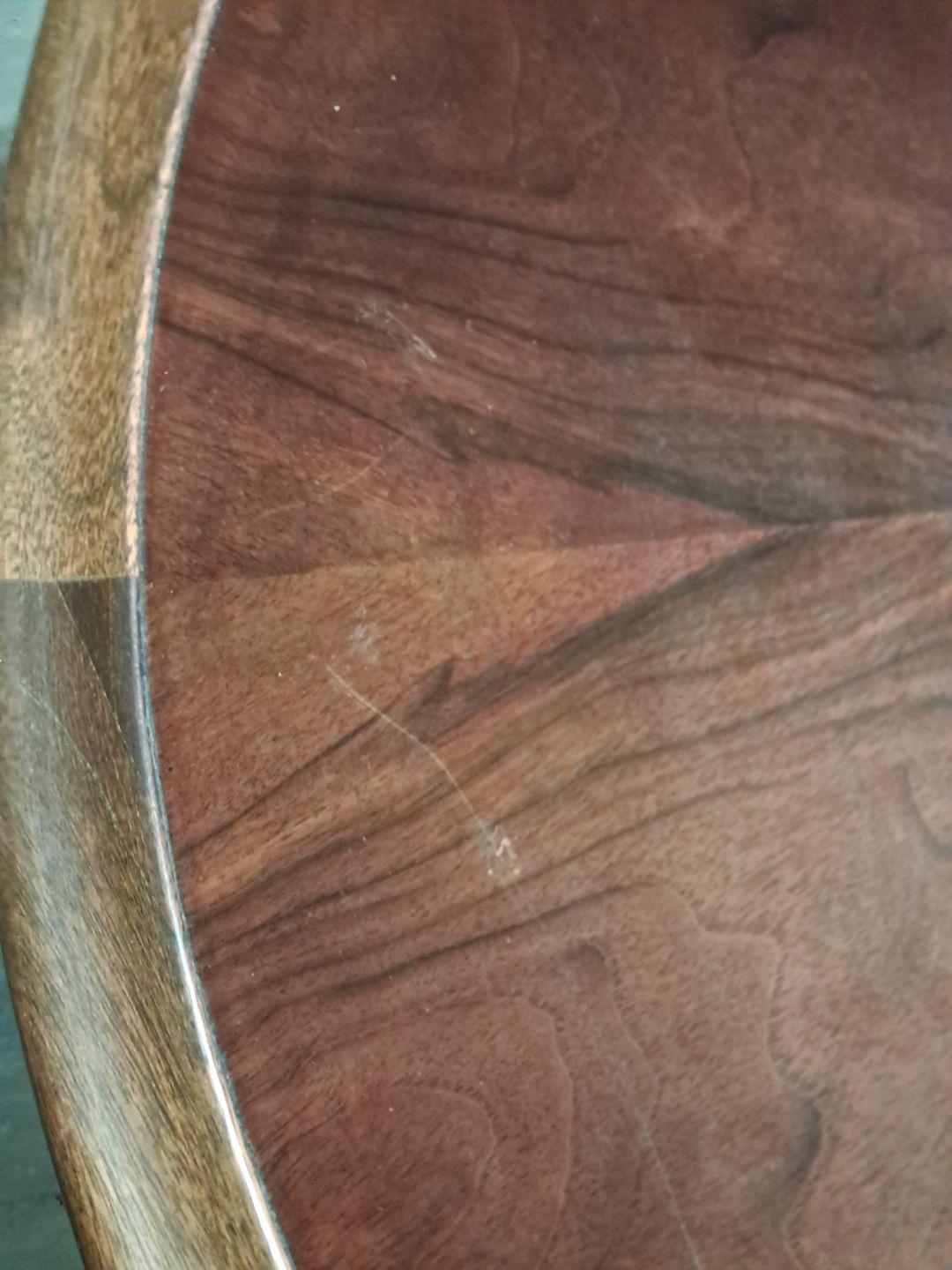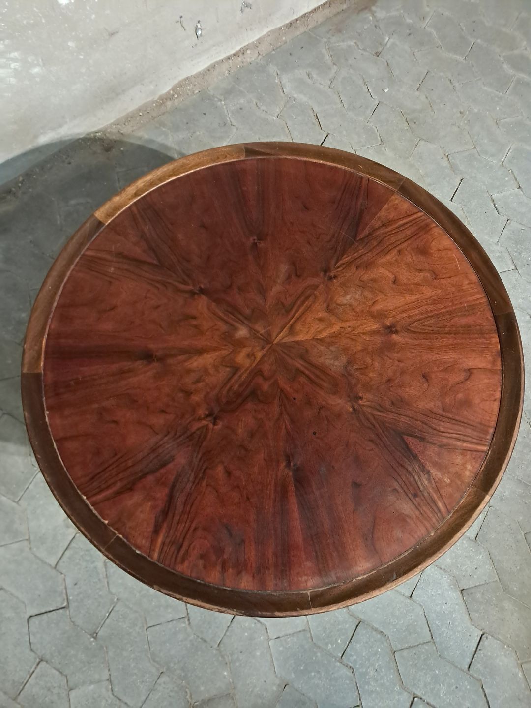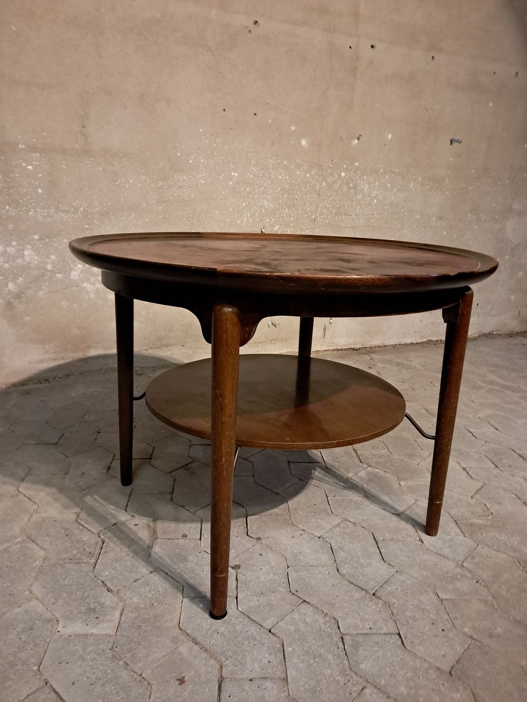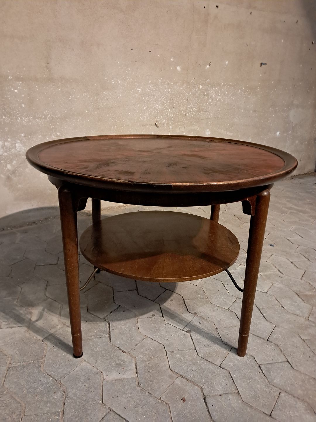 Rundt sofabord i fineret nødetræ, fra 1950erne.