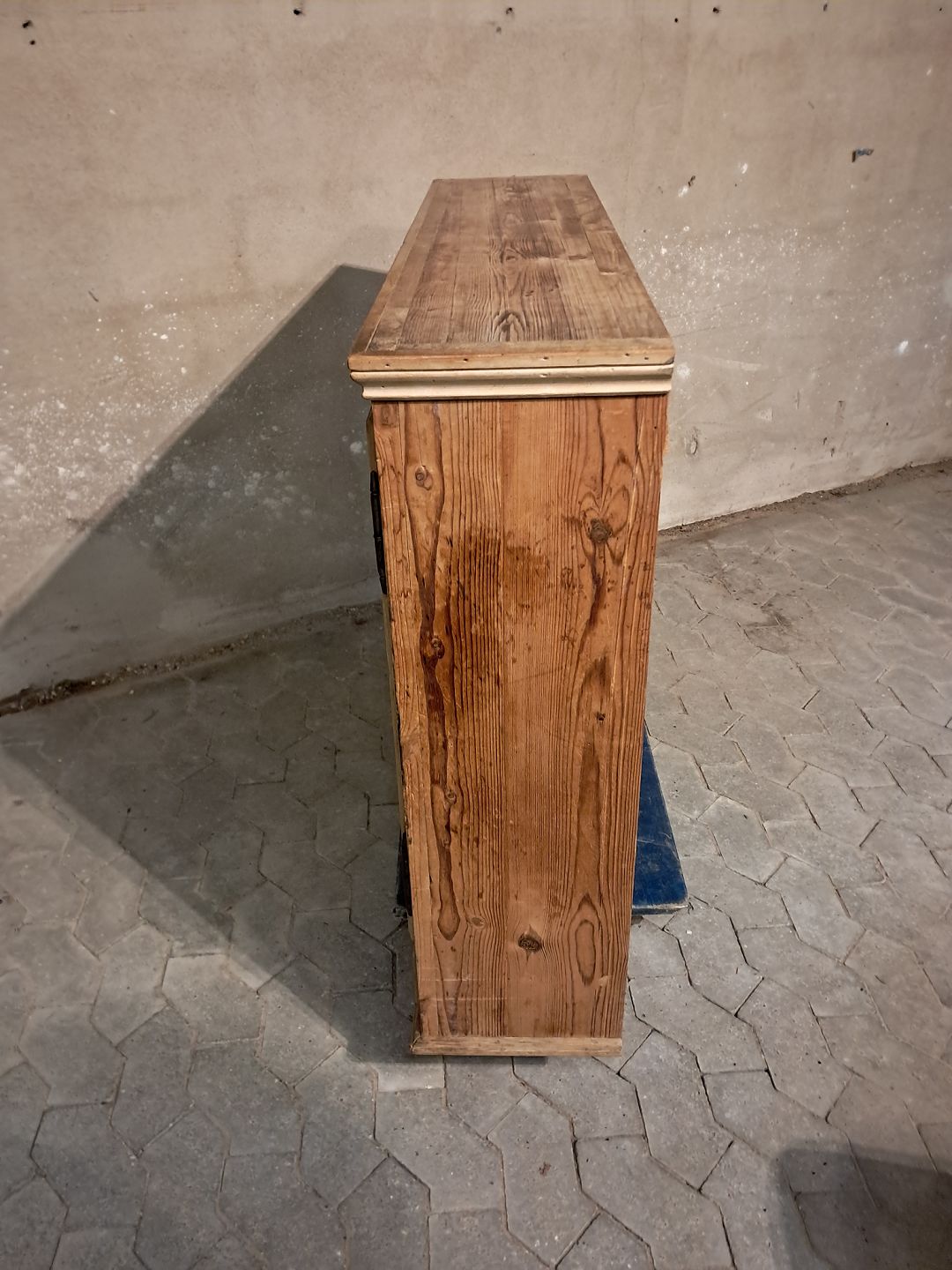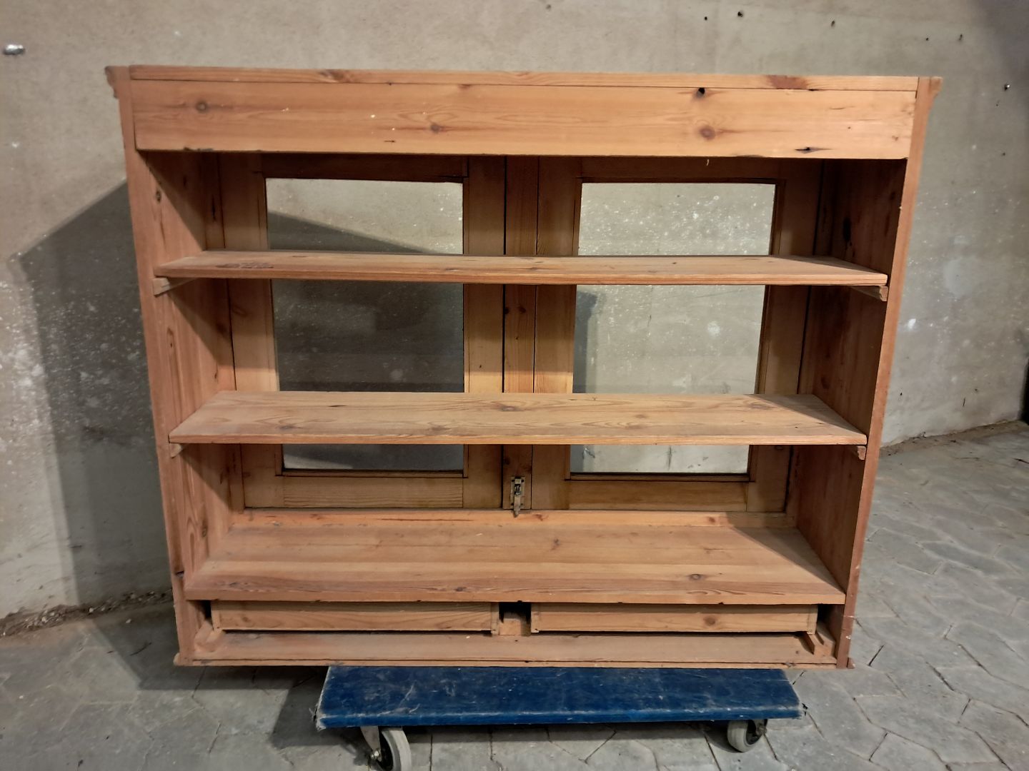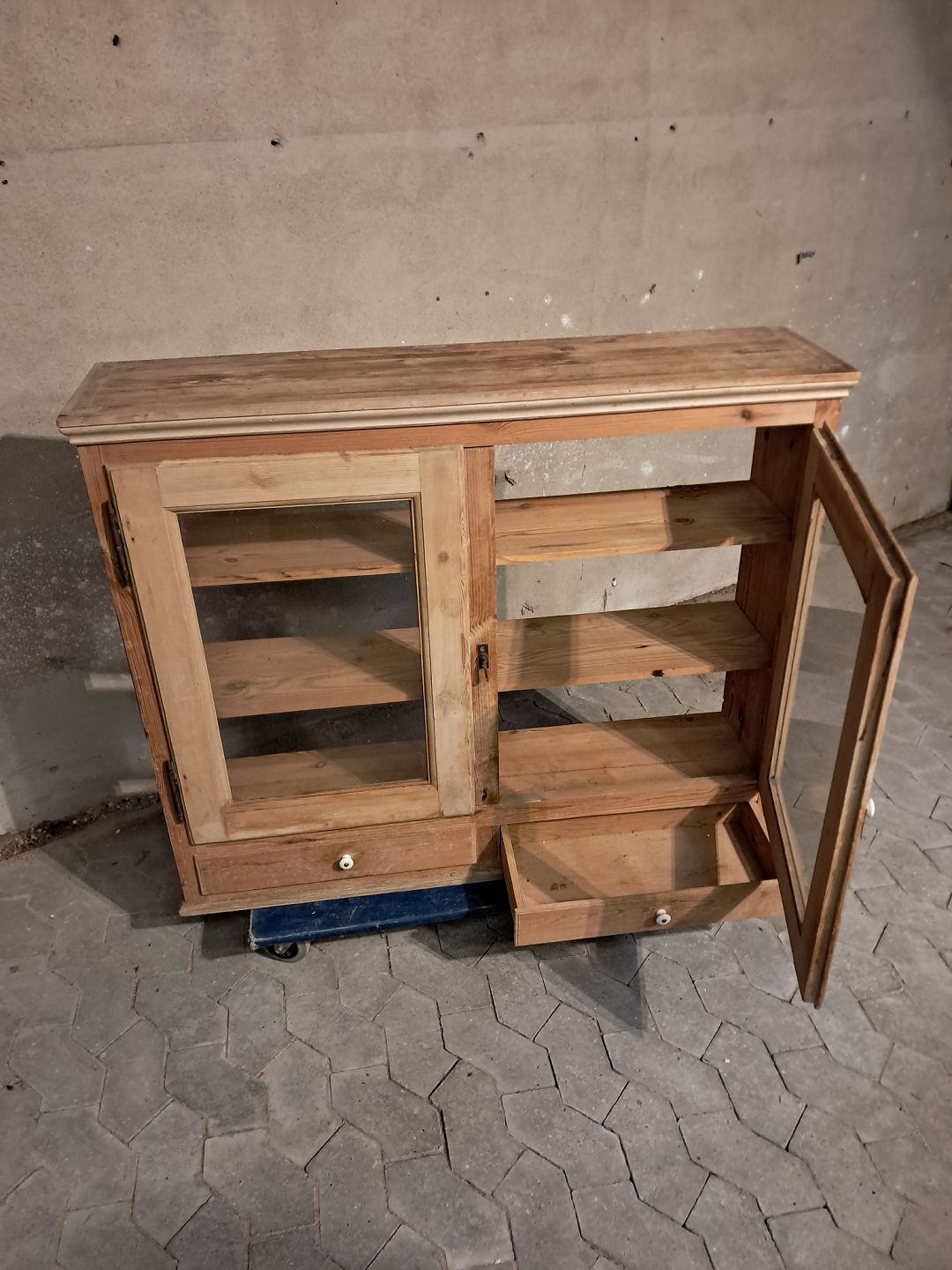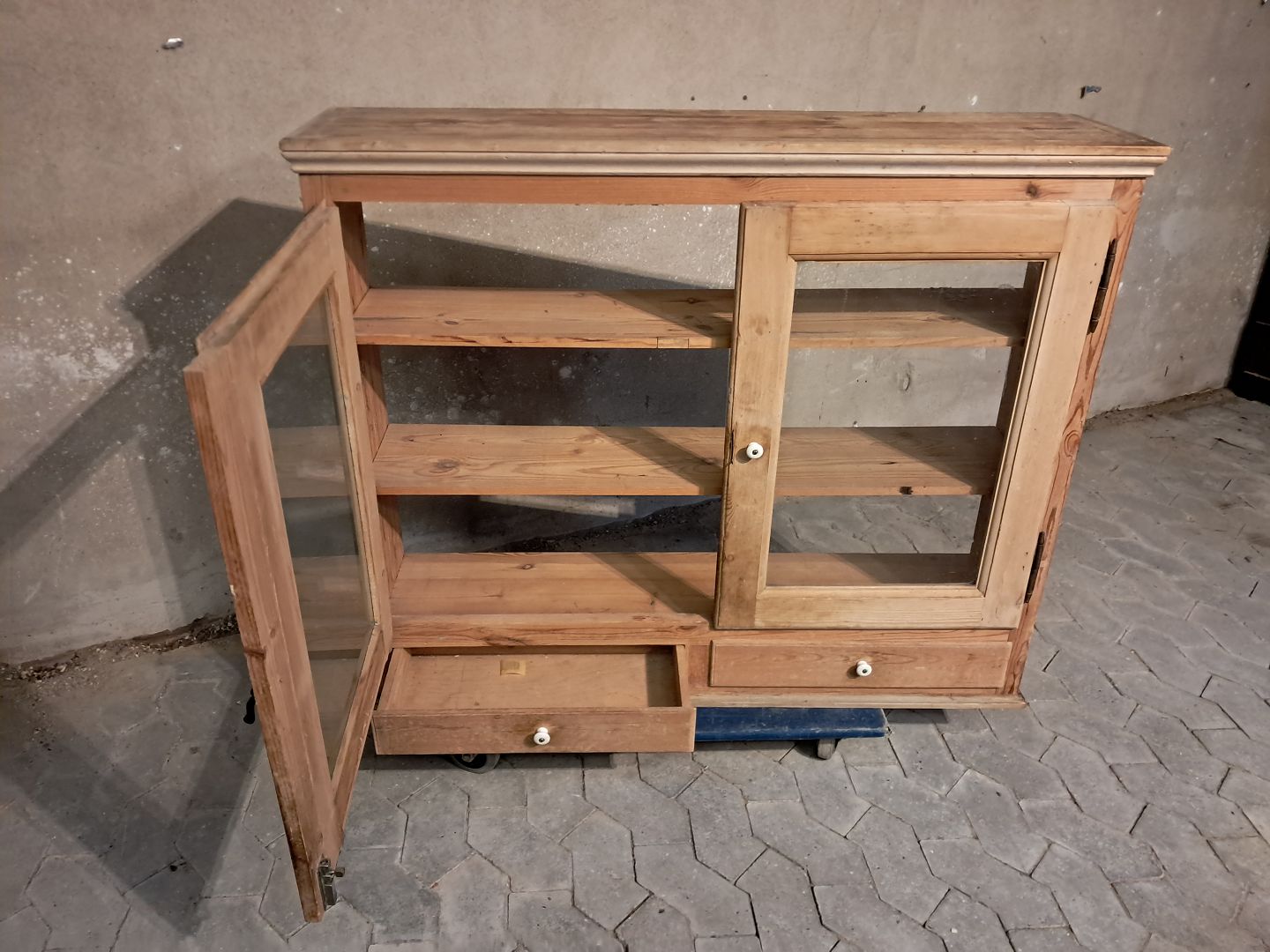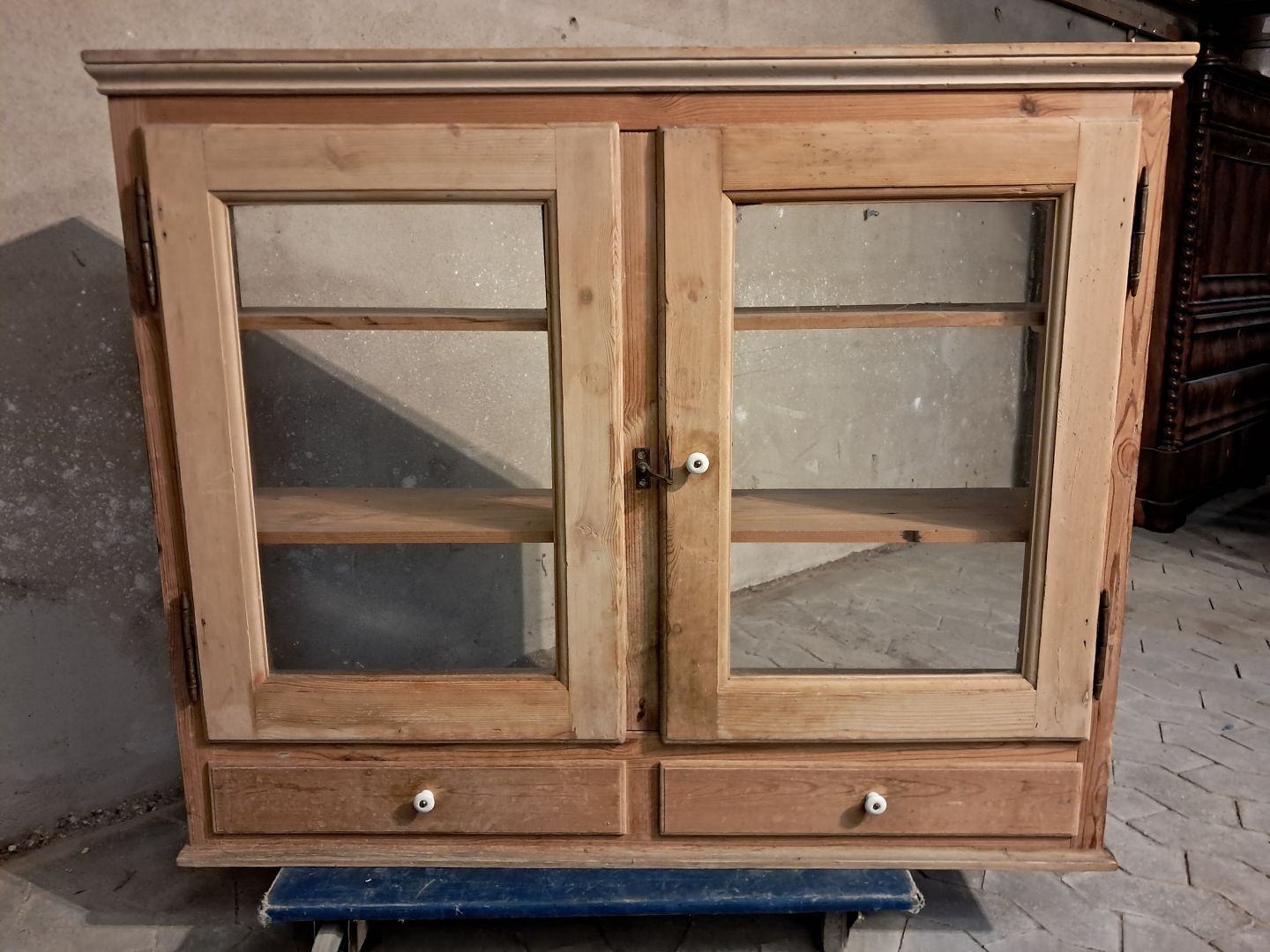 Vitrineskab i massivt fyrretræ, fra 1920erne.