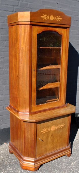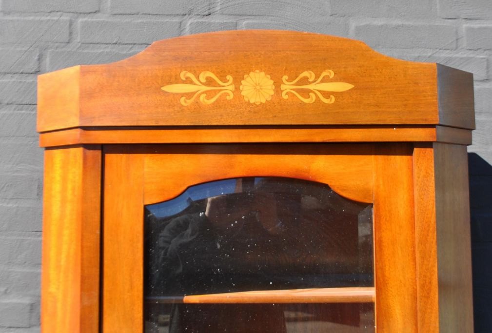 Dansk mahogni bogskab med intarsia, 1910 - 1920. Underskab med en hylde og intarsia. Øverske del med facetteret glas og tre indvendige hylder. H.: 177 cm. B.: 78 cm. D.: 53 cm.