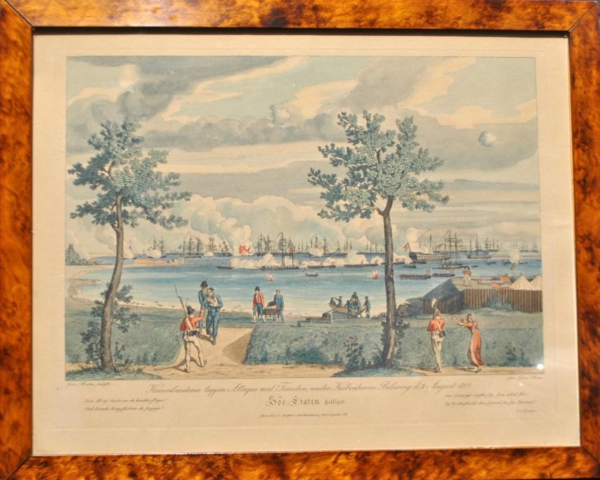 Kanonbaadens tappre Attaque mod Fienden under Kiöbenhavns Beleiring, d. 31 August 1807. Kobberstik efter Johs. Senn, 19. årh. Danmark. Håndkoloreret. Signeret. Ramme af poleret birketræ. H: 31,5 cm. B: 46,5 cm.