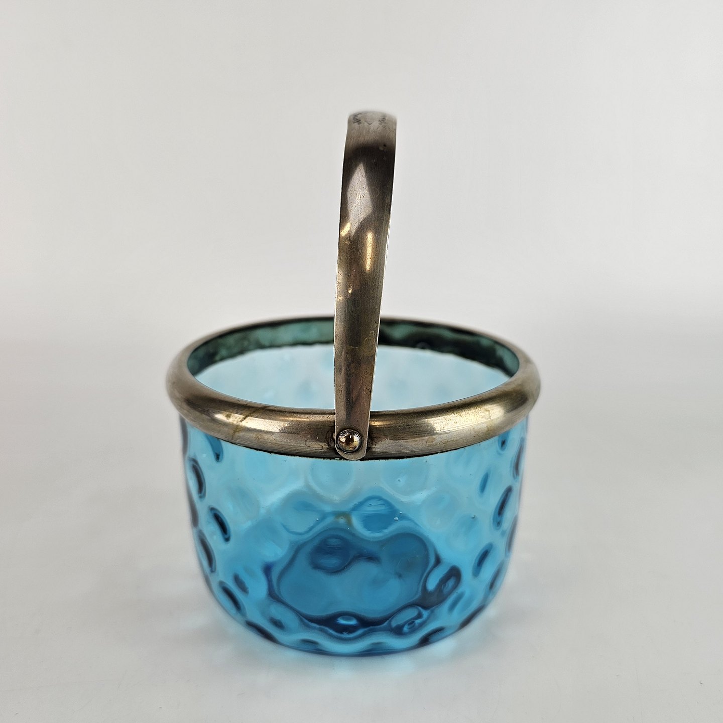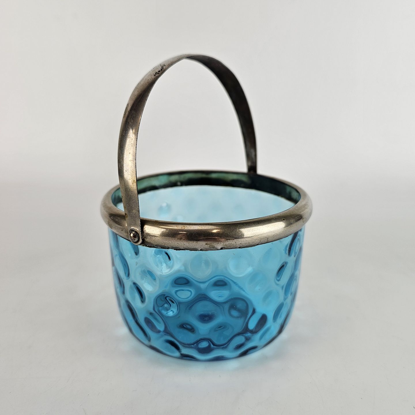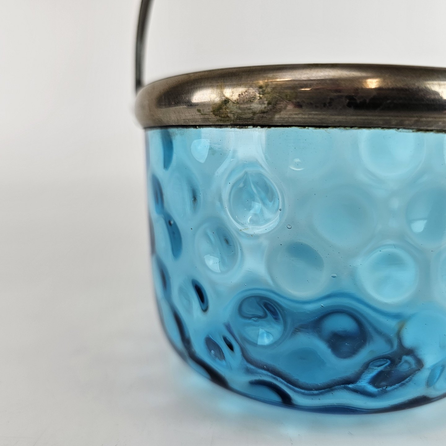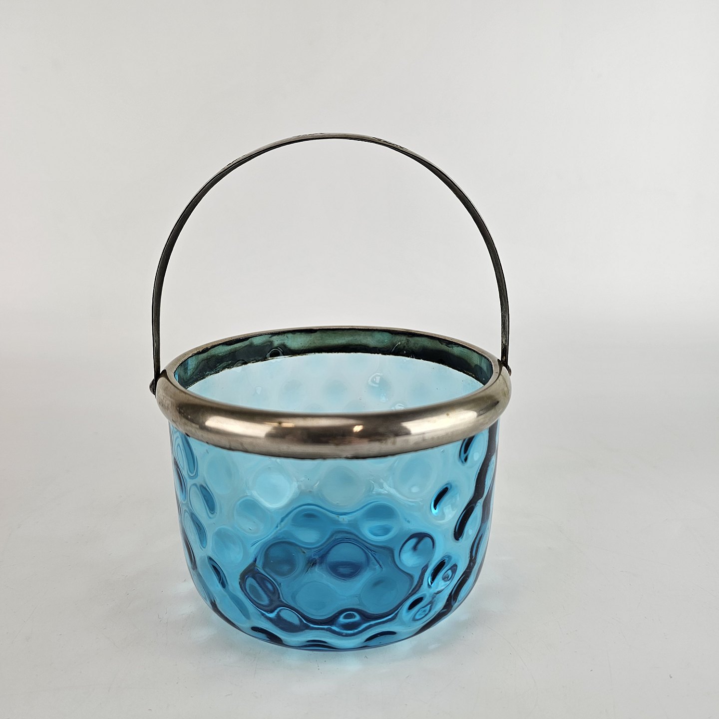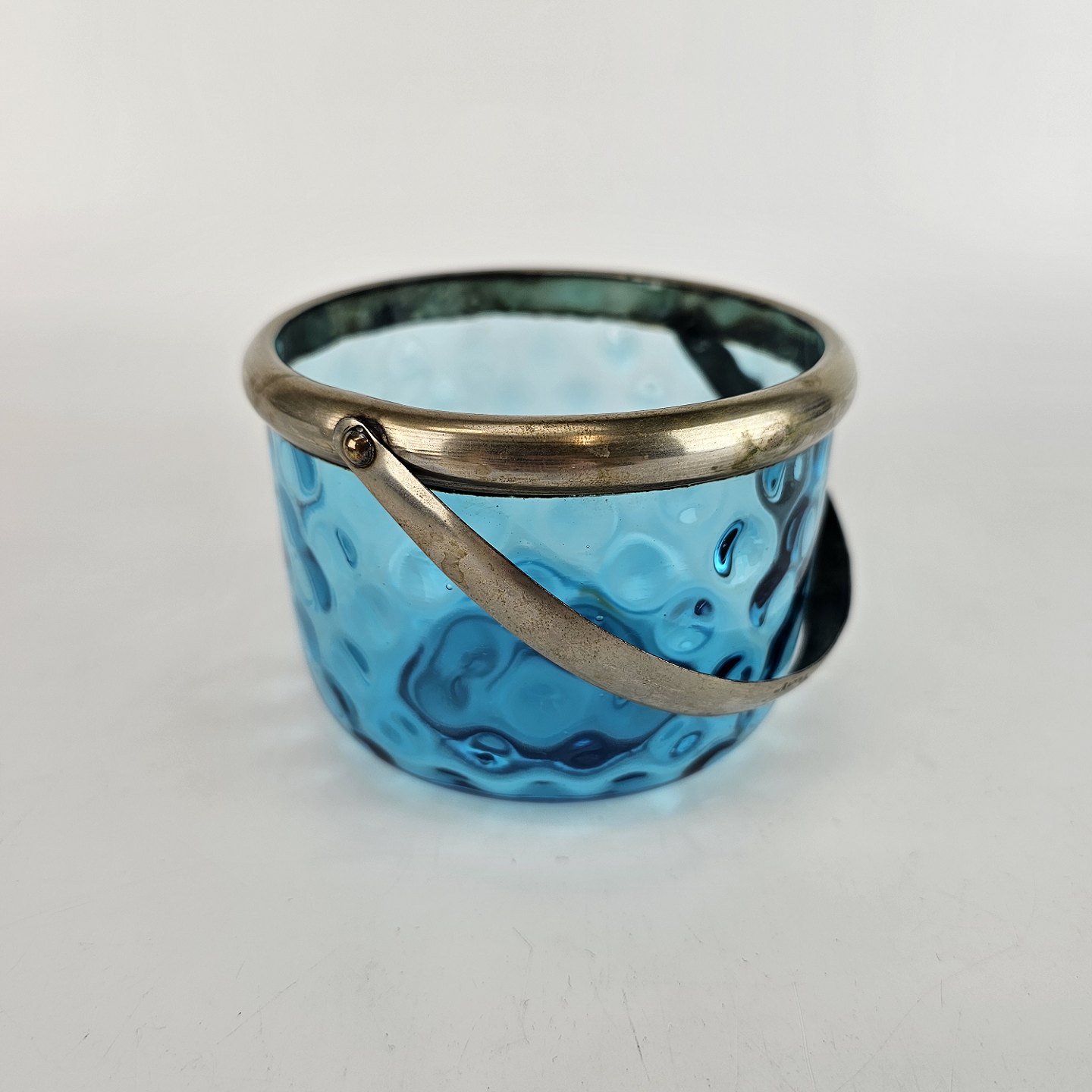 Sukkerskål i blåt øjnet glas, med hank af nikkel.