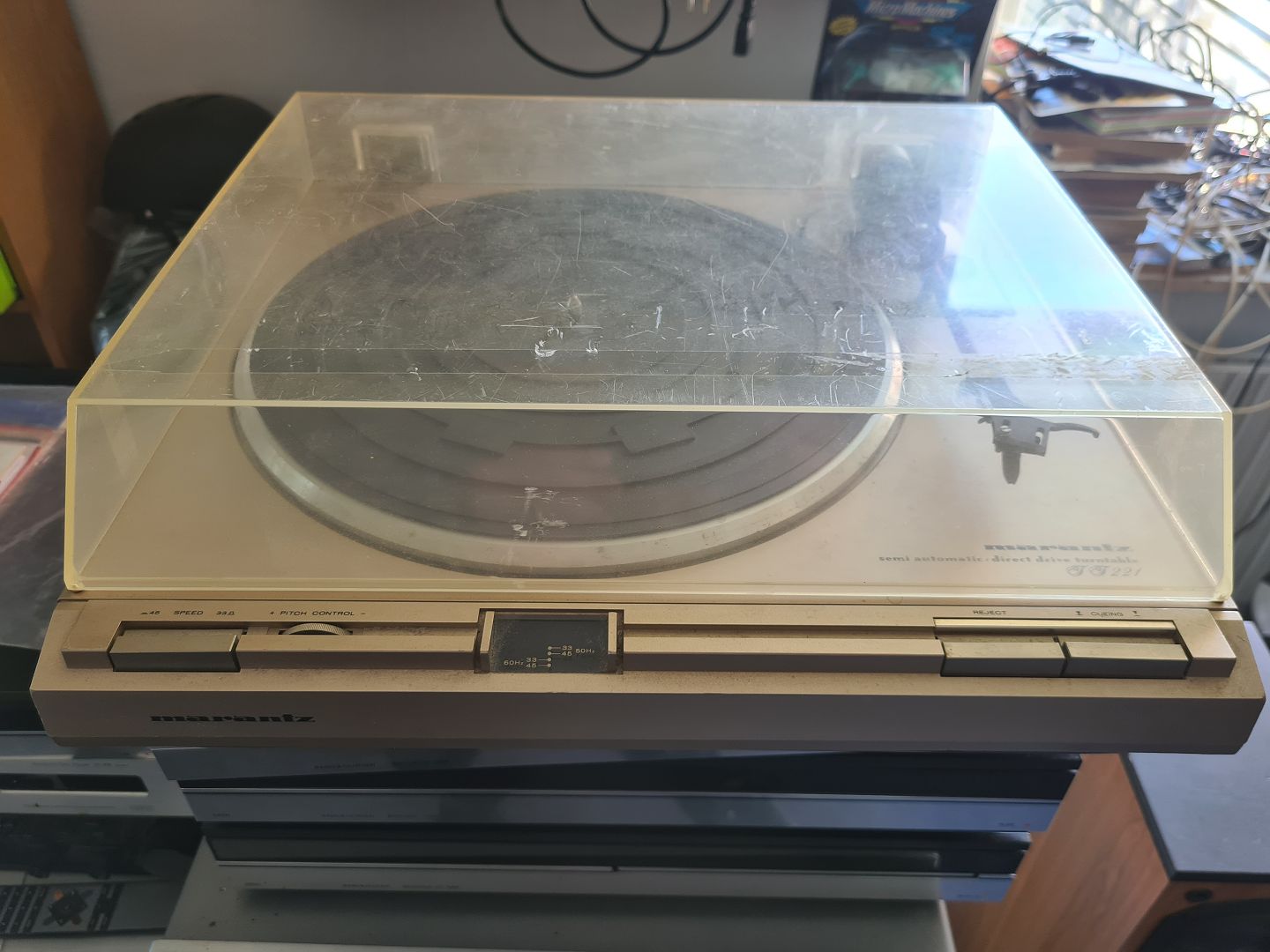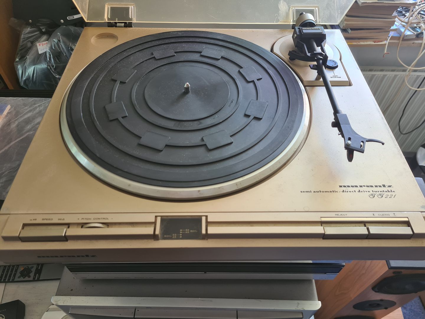 Pladespiller fra Marantz model TT 221. Nok mest til reservedele eller restaurering. Motoren kører og skiven drejer. Armen mangler modvægt. Fremstår med brugsspor. (Billede)