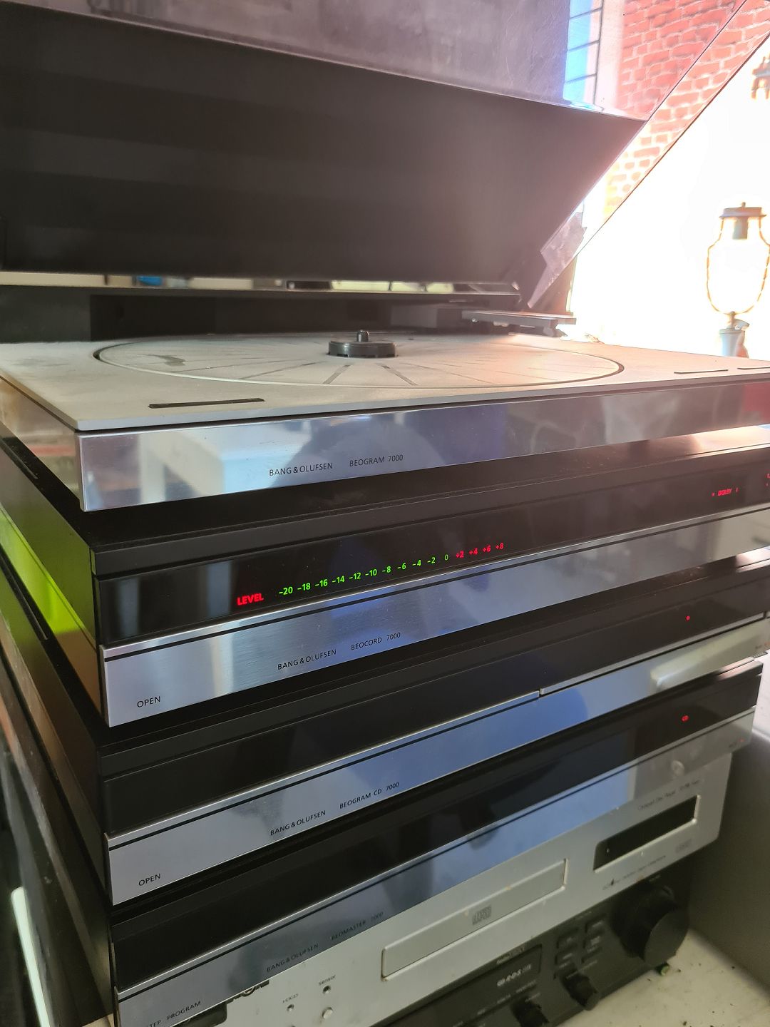 B&O anlæg fra 7000 serien i sølv/sort. Delvist til restaurering/reservedele. Beomaster 7000 virker fint. Beomaster CD virker fint. Beocord lyser og skuffen virker, men ikke funktionerne vedrørende afspilning af kasettebånd. Beogram pick-up armen flytter sig ikke, og skiven drejer heller ikke. Ældre fjernbetjening medfølger.