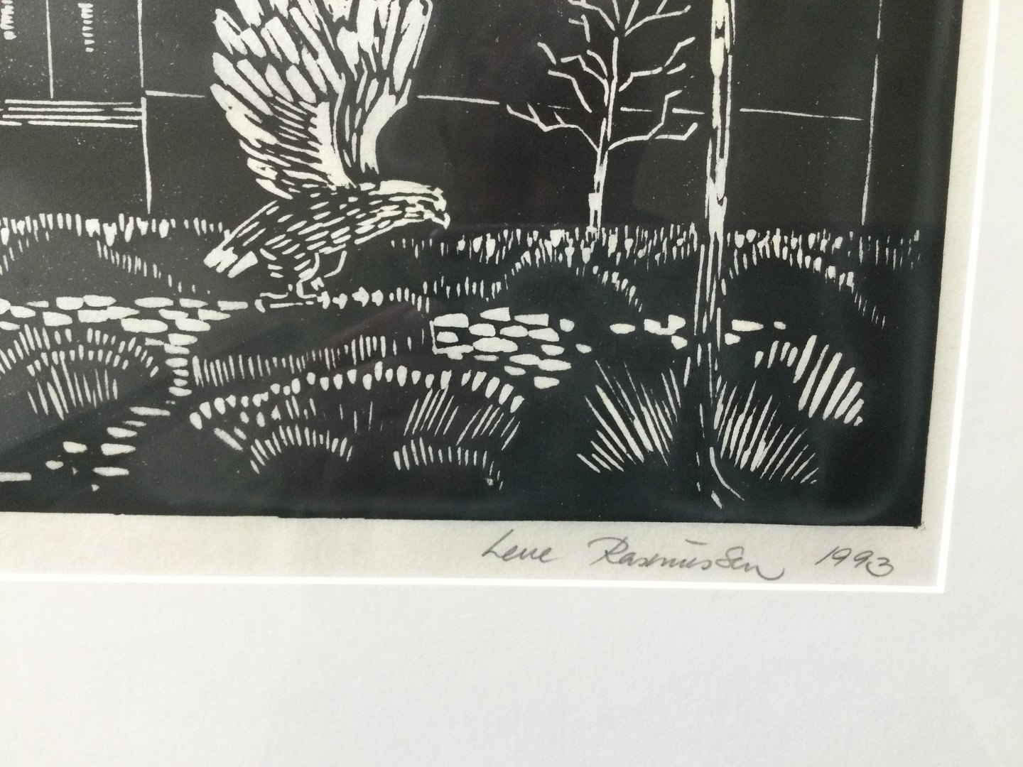 Litografi af Lene Rasmussen - Bygninger og fugle 1993.