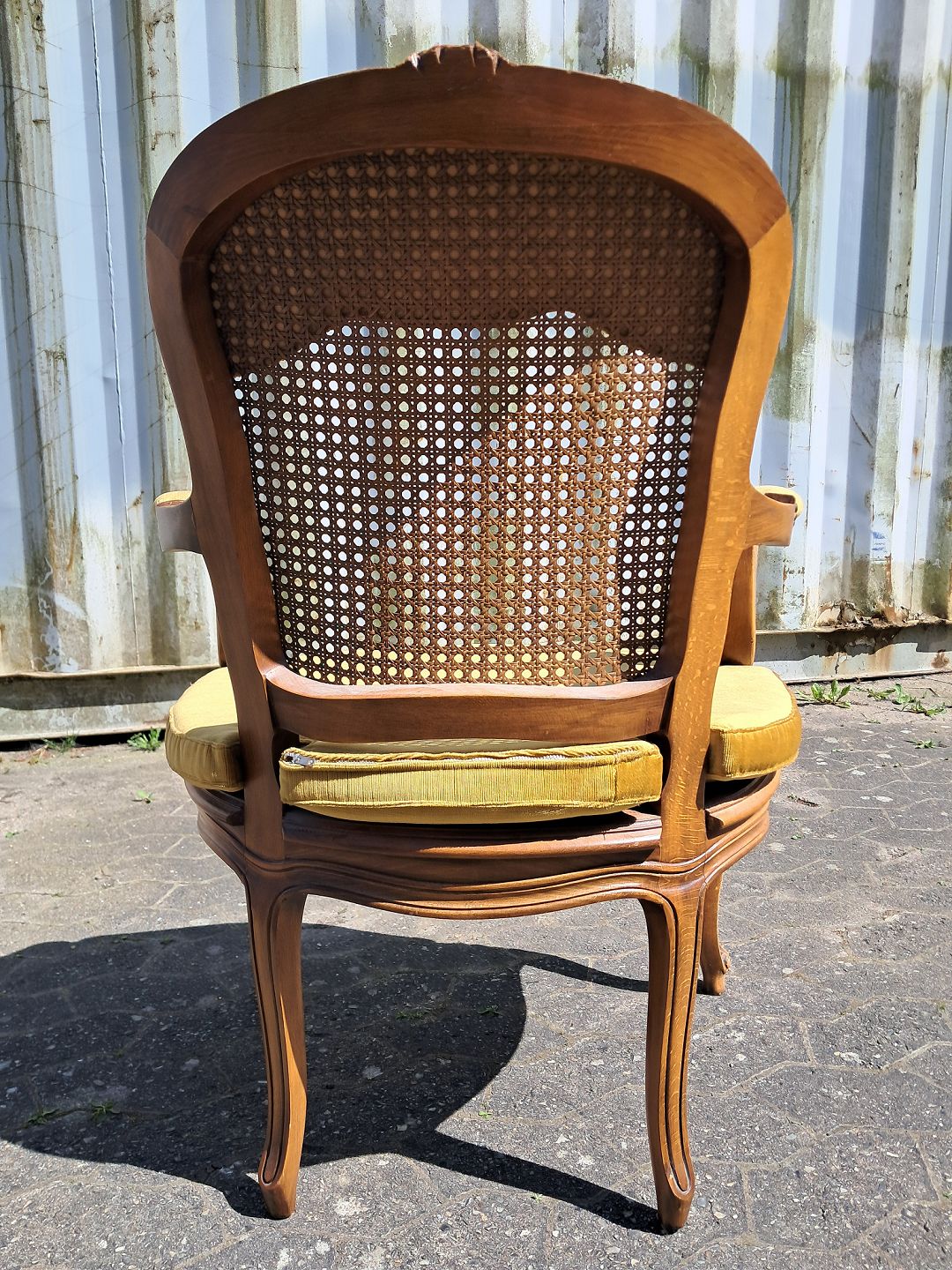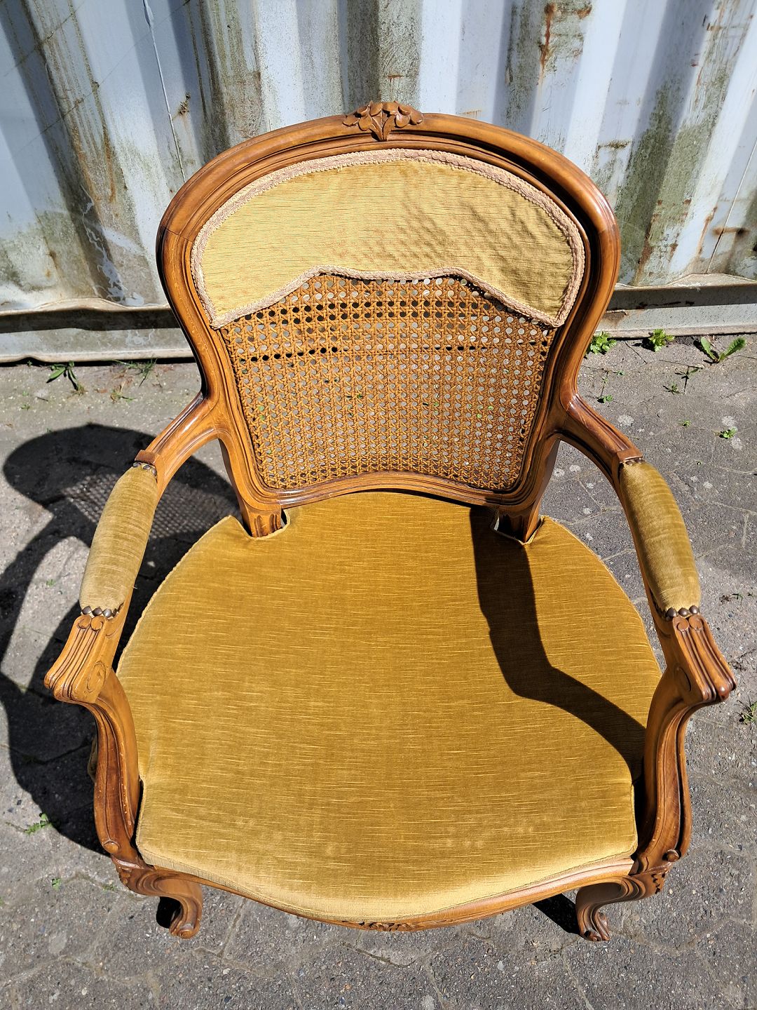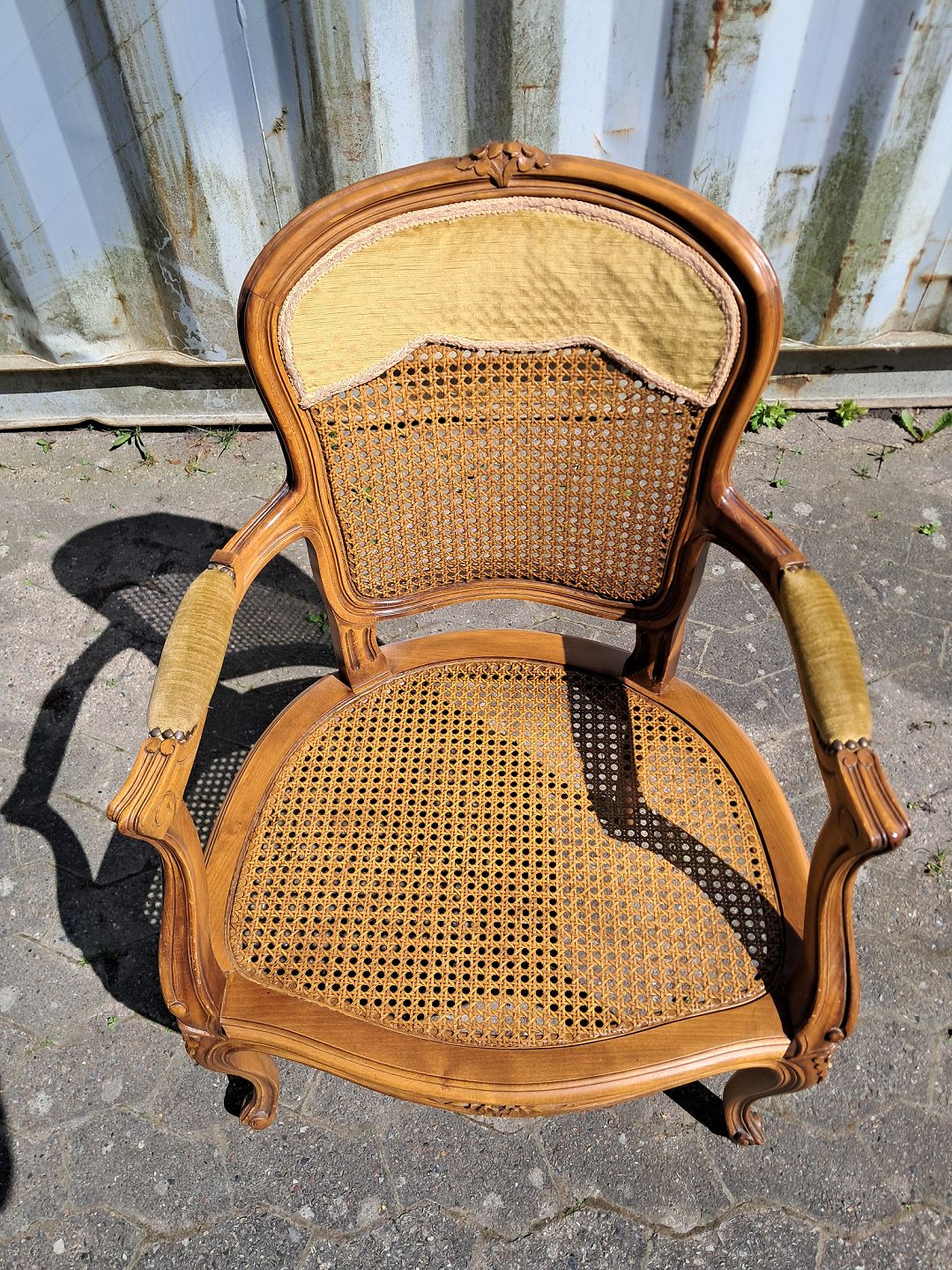 Armstol i massivt bøgetræ med rørflet og velourhynde, fra 1980erne.