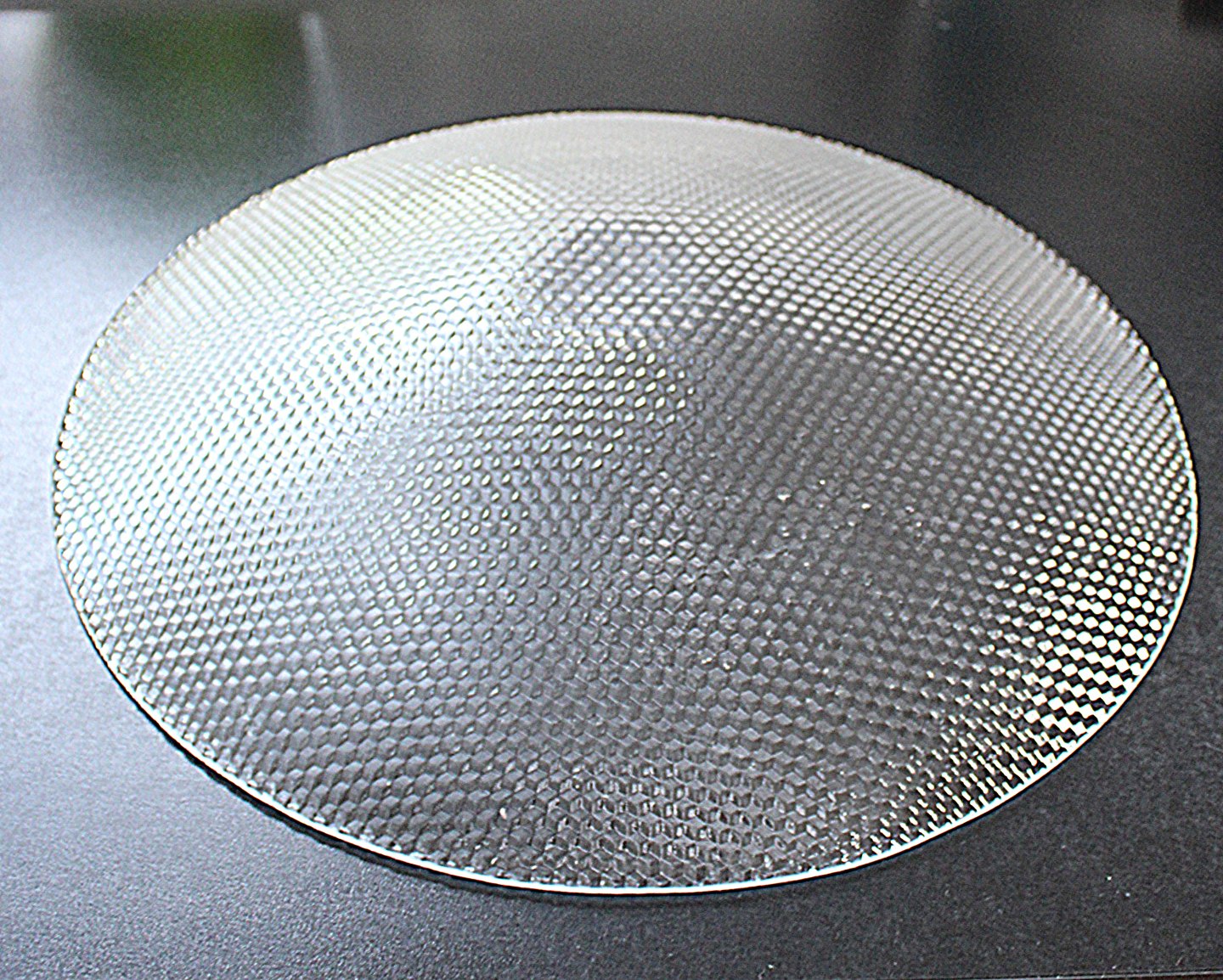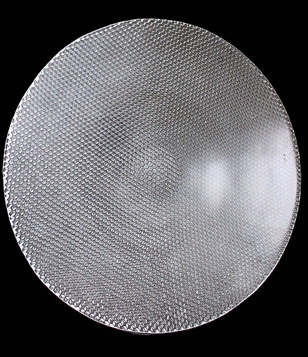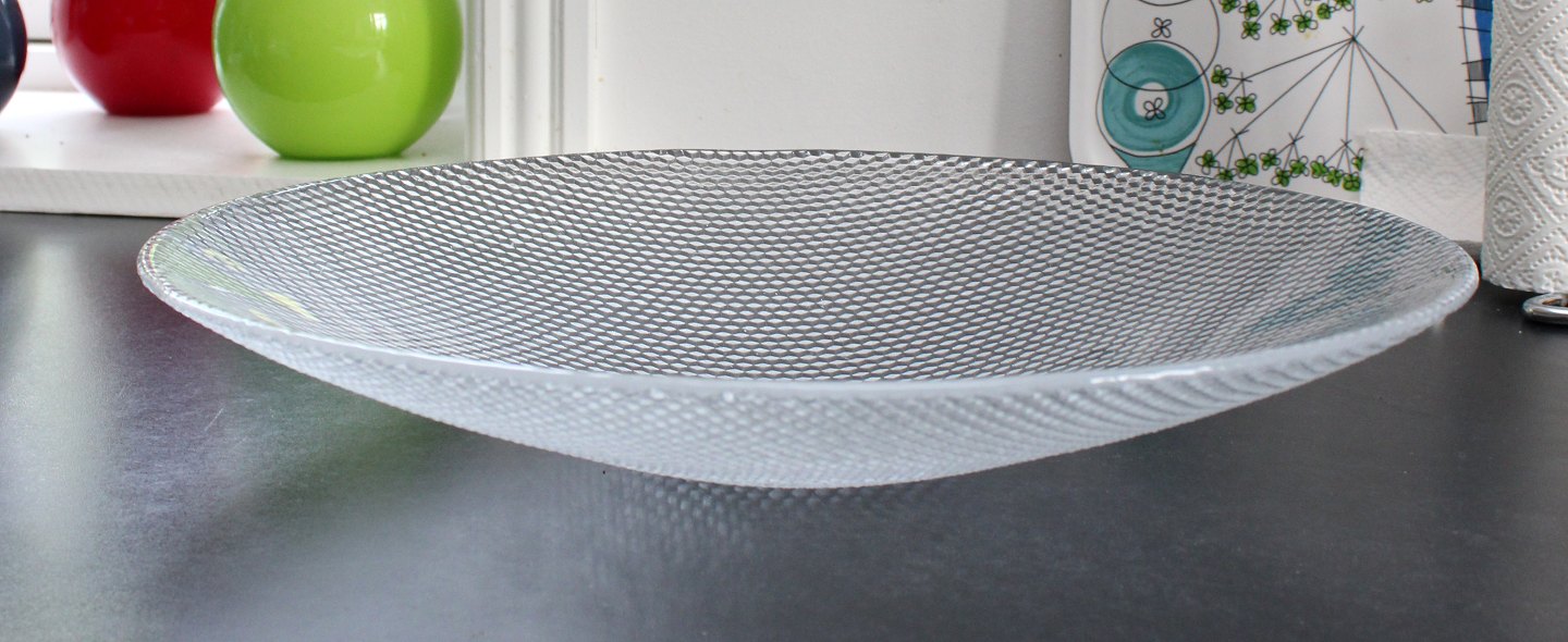 Holmegaard, Trigona, Kæmpestort fad. Designet af Torben Jørgensen i 1988 for Royal Copenhagen. Centrifugeret serie, glat indre og kube mønstret yderside. Findes i klar, blå, olivengrøn og lilla glas. Fin stand med enkelte luftbobler. Diameter 40 cm. Højde 7 cm. Pris: 275 kr. stk. Lager: 1