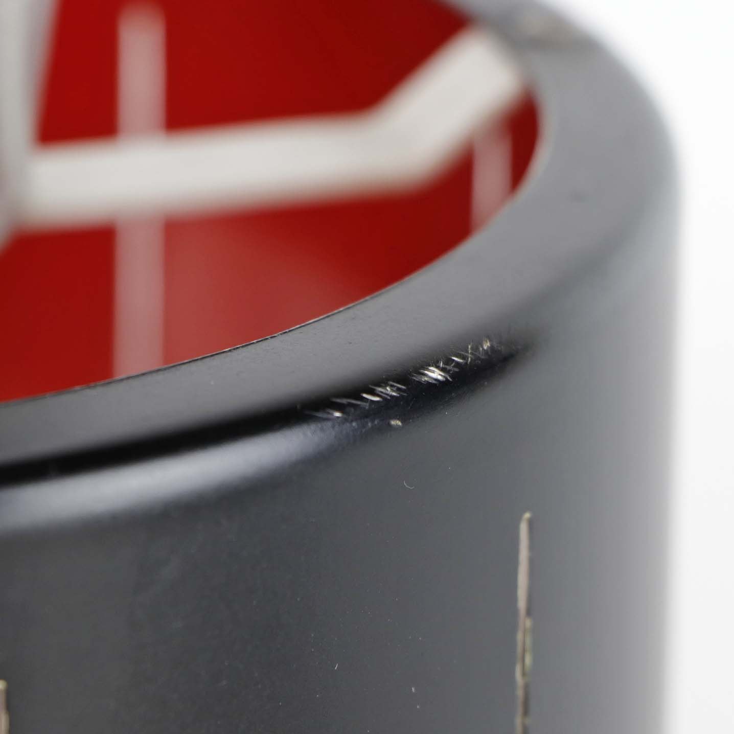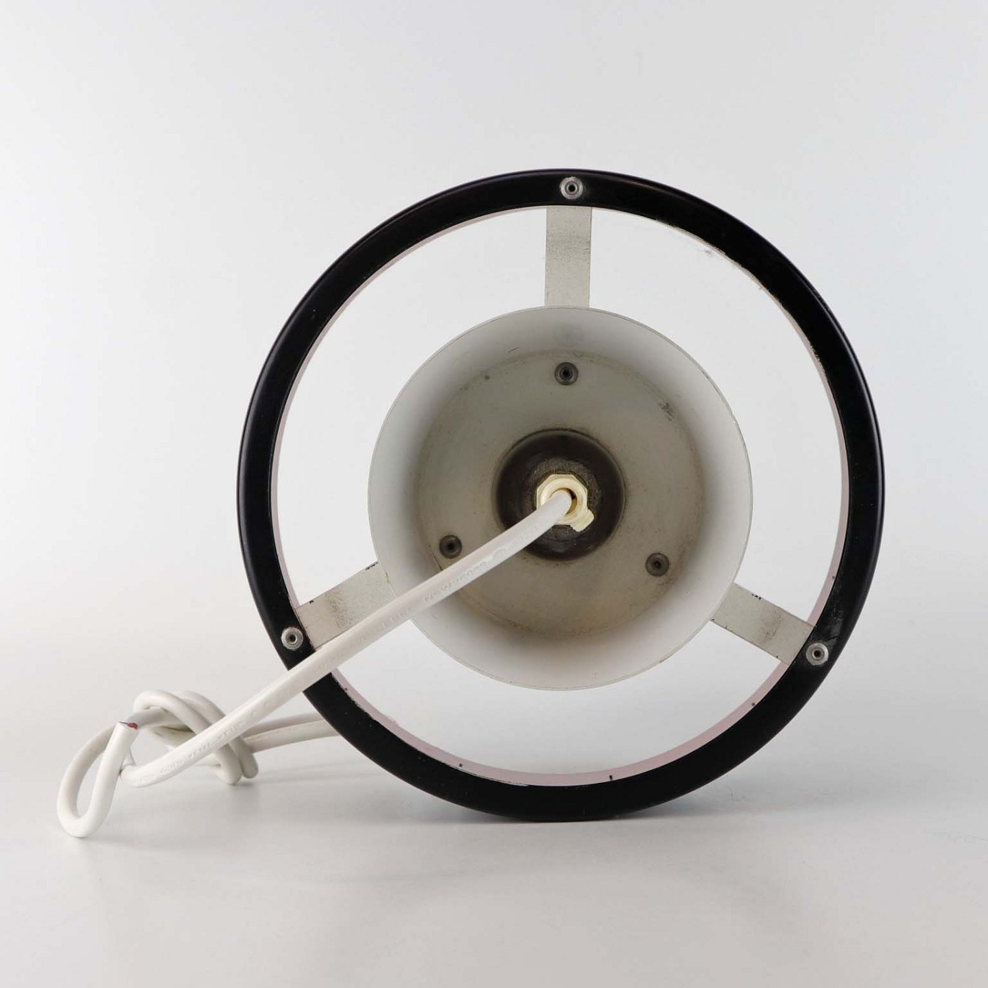 Loftslampe i børstet grå aluminium og sort lakeret skærm med rød inderside lakering. Model Saturn.