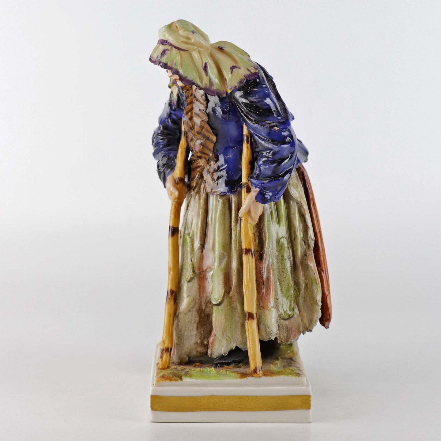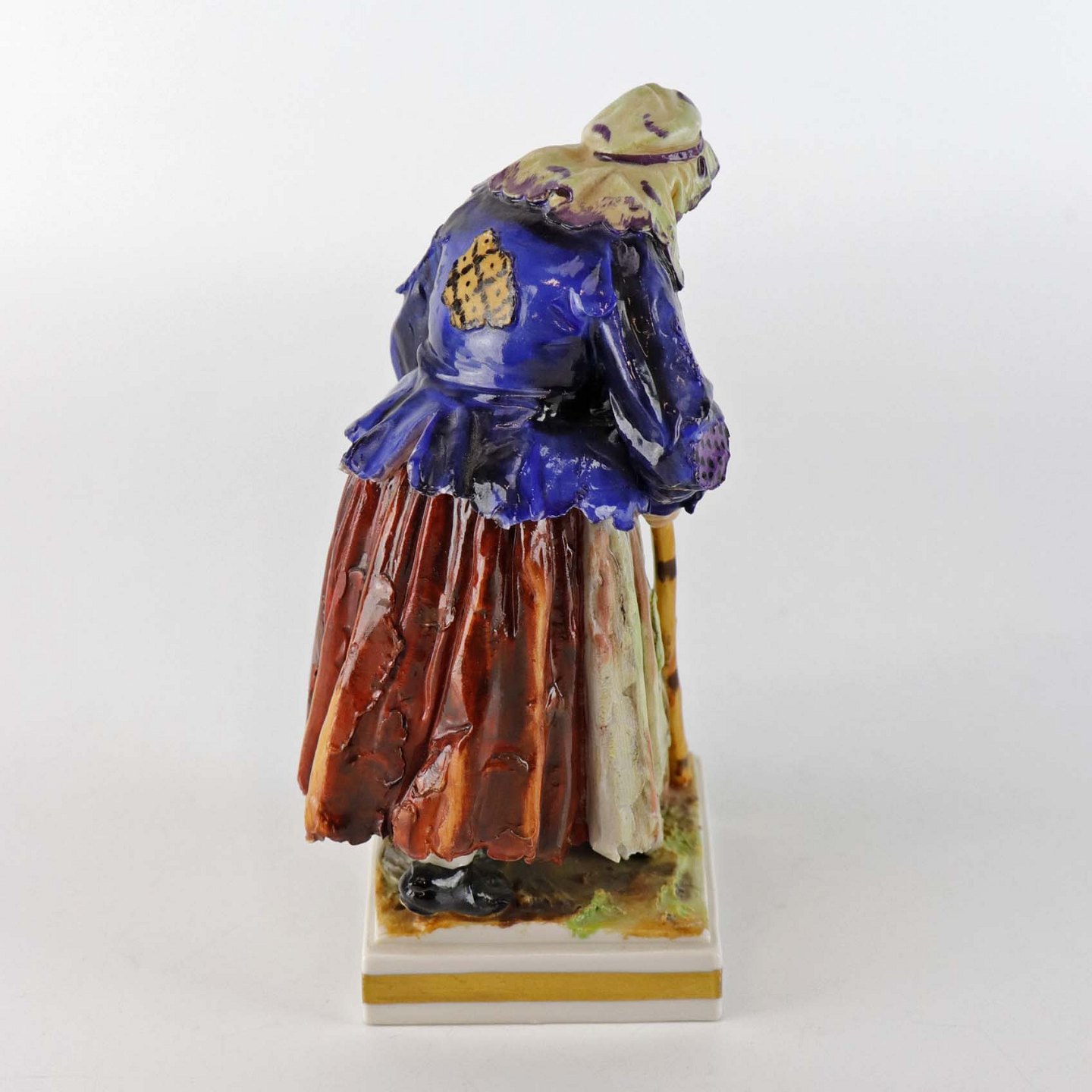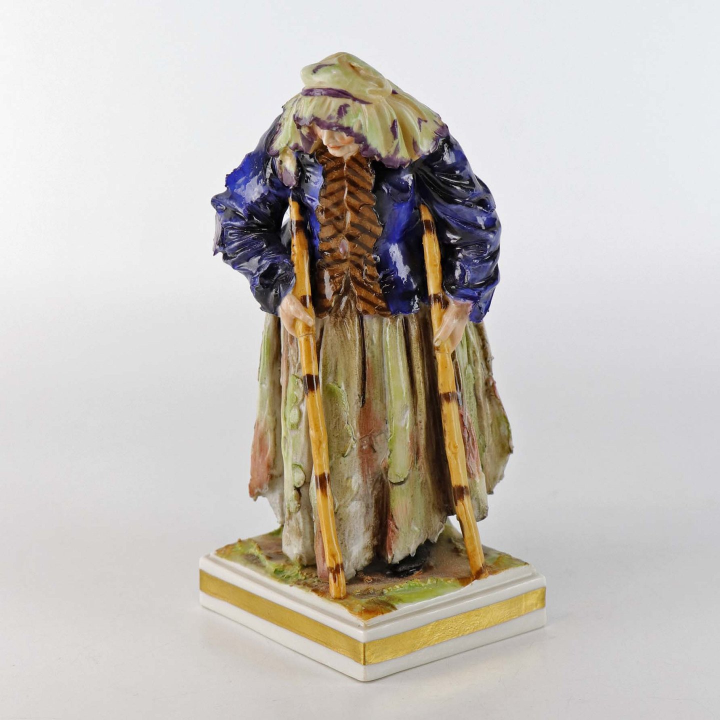 Tysk figur i porcelæn med motiv af fattig kvinde med krykker