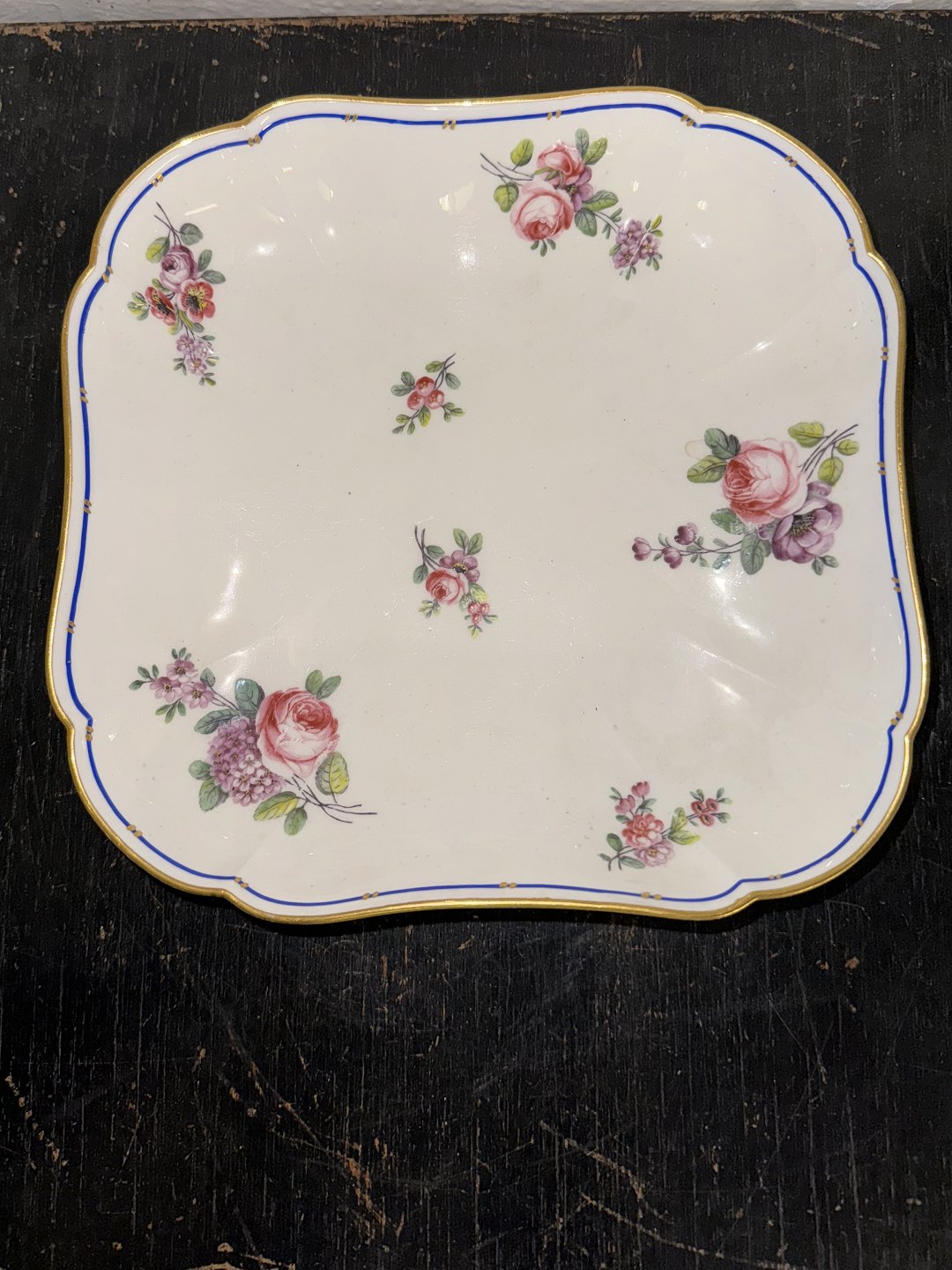 Firkantet fad i porcelæn fra Sèvres, Frankrig. Dekoreret med delikate blomster. Fra slutningen af 18. århundrede. Fremstår i god stand uden skader eller reparationer. Mål:H. 3,5 cm samt 20,7 x 21,3 cm