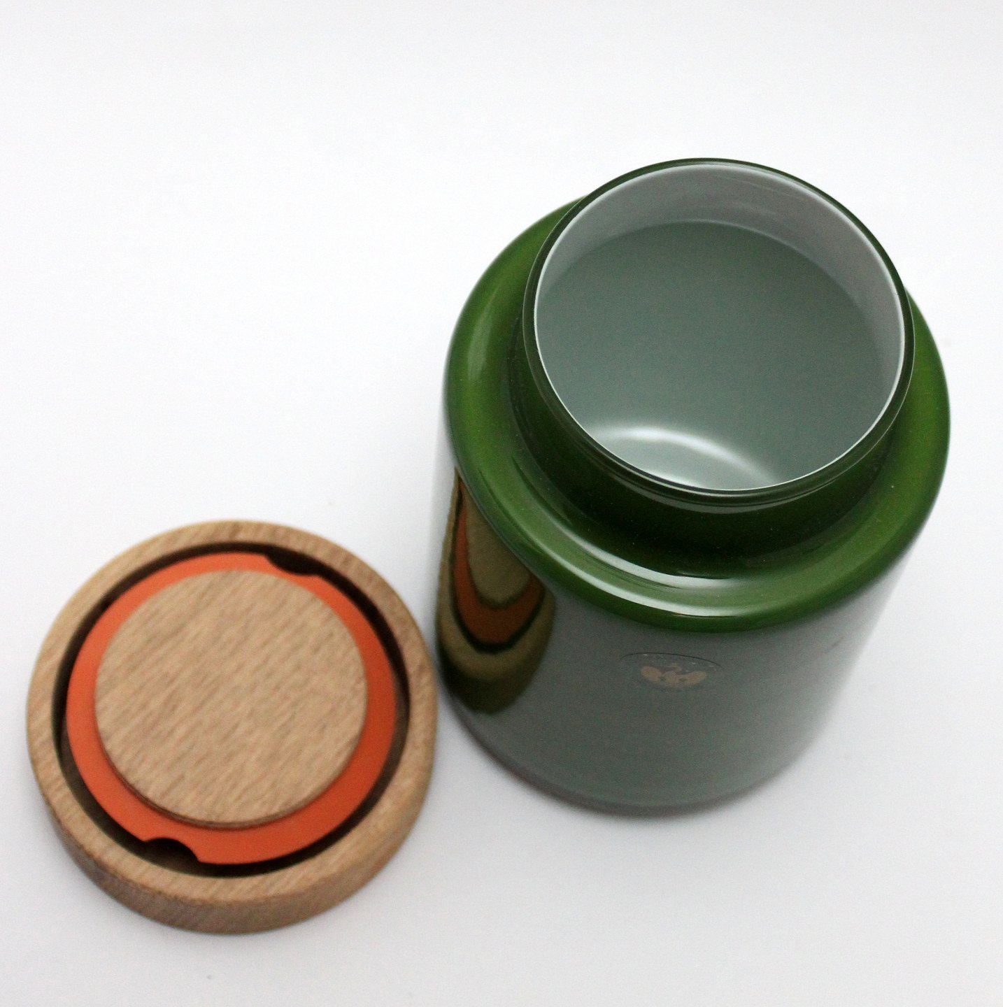 Holmegaard, Palet, Grøn opbevaringskrukke med massivt egetrælåg. Designet af Michael Bang. Holmegaard kollektion 2016/2017. Højde 14,5 cm. Diameter 9 cm. Flot stand. Pris: 650 kr.