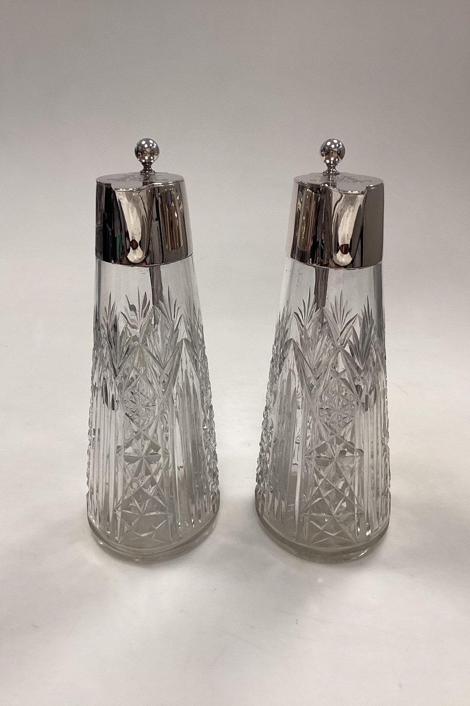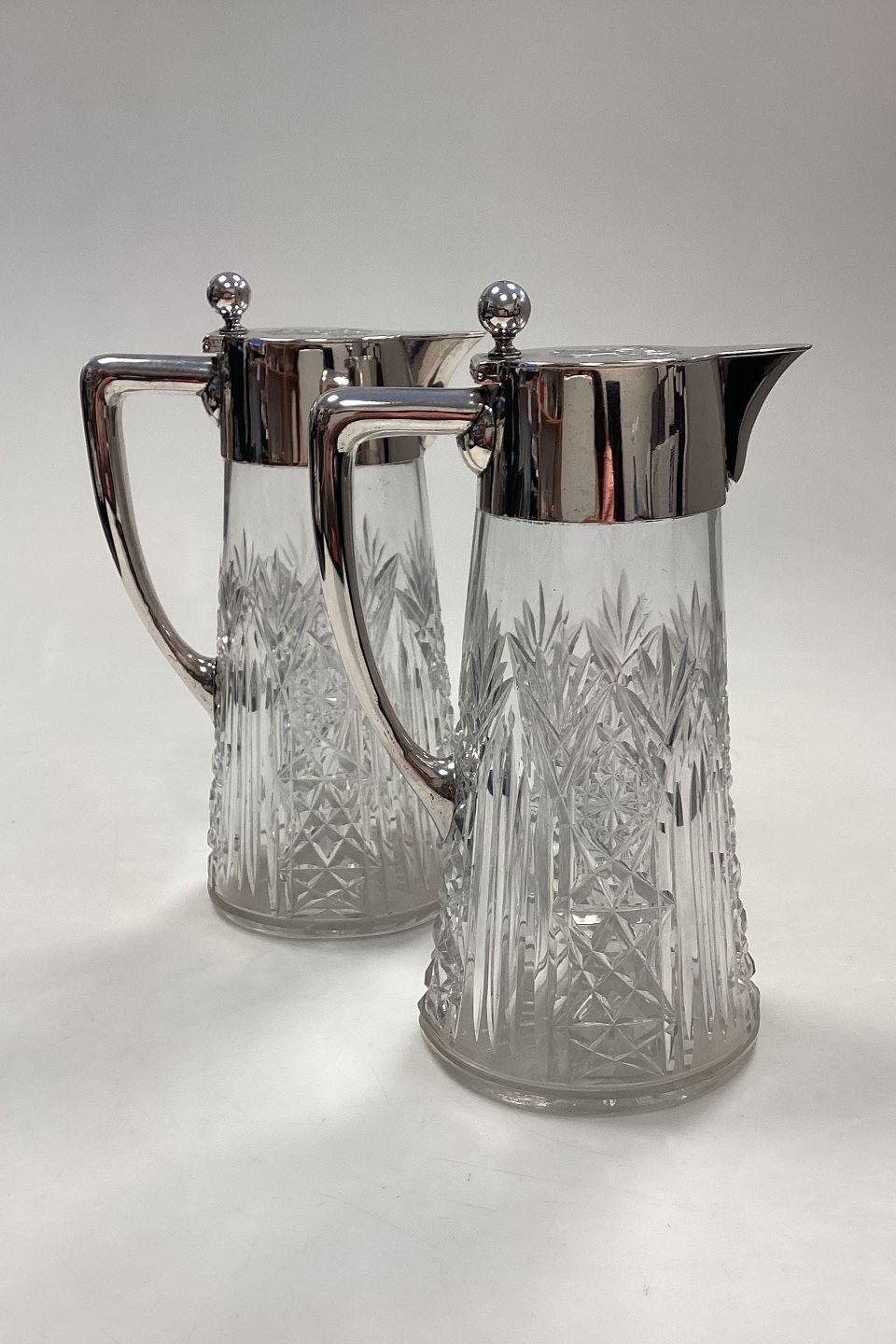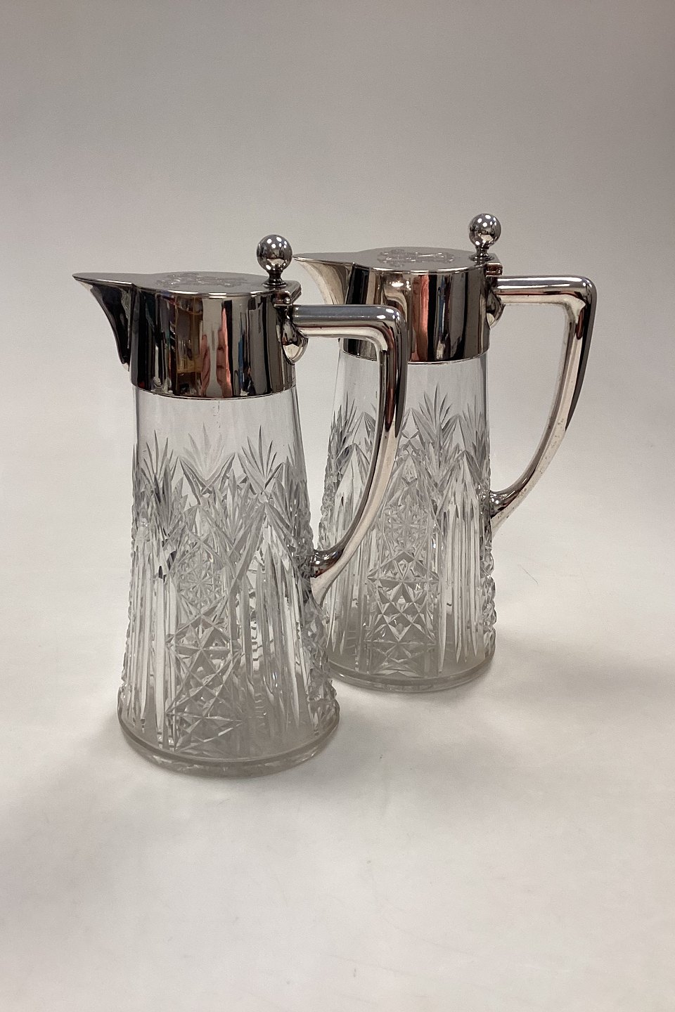 Ét par Hespe glaskarafler med sølvmontering. Monogram på låget: MI. Facetslebet glas med oval bund. Lettere brugsspor, små afslag på facetter.