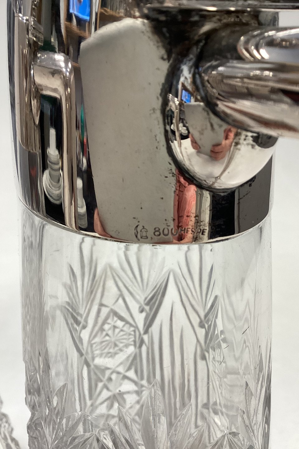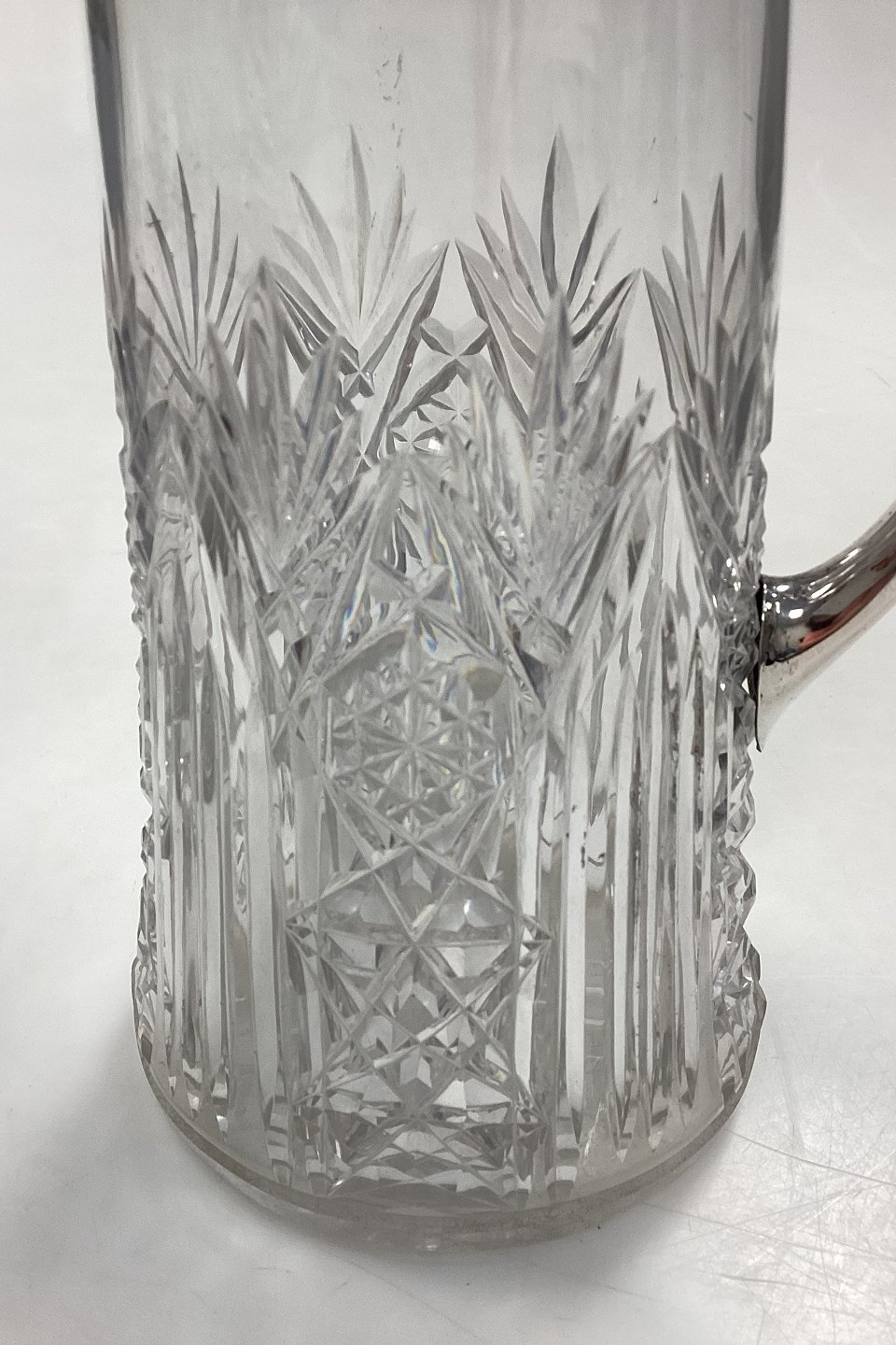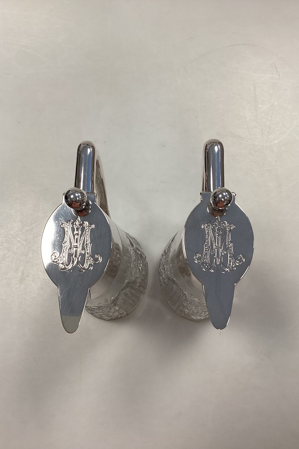 Ét par Hespe glaskarafler med sølvmontering. Monogram på låget: MI. Facetslebet glas med oval bund. Lettere brugsspor, små afslag på facetter.