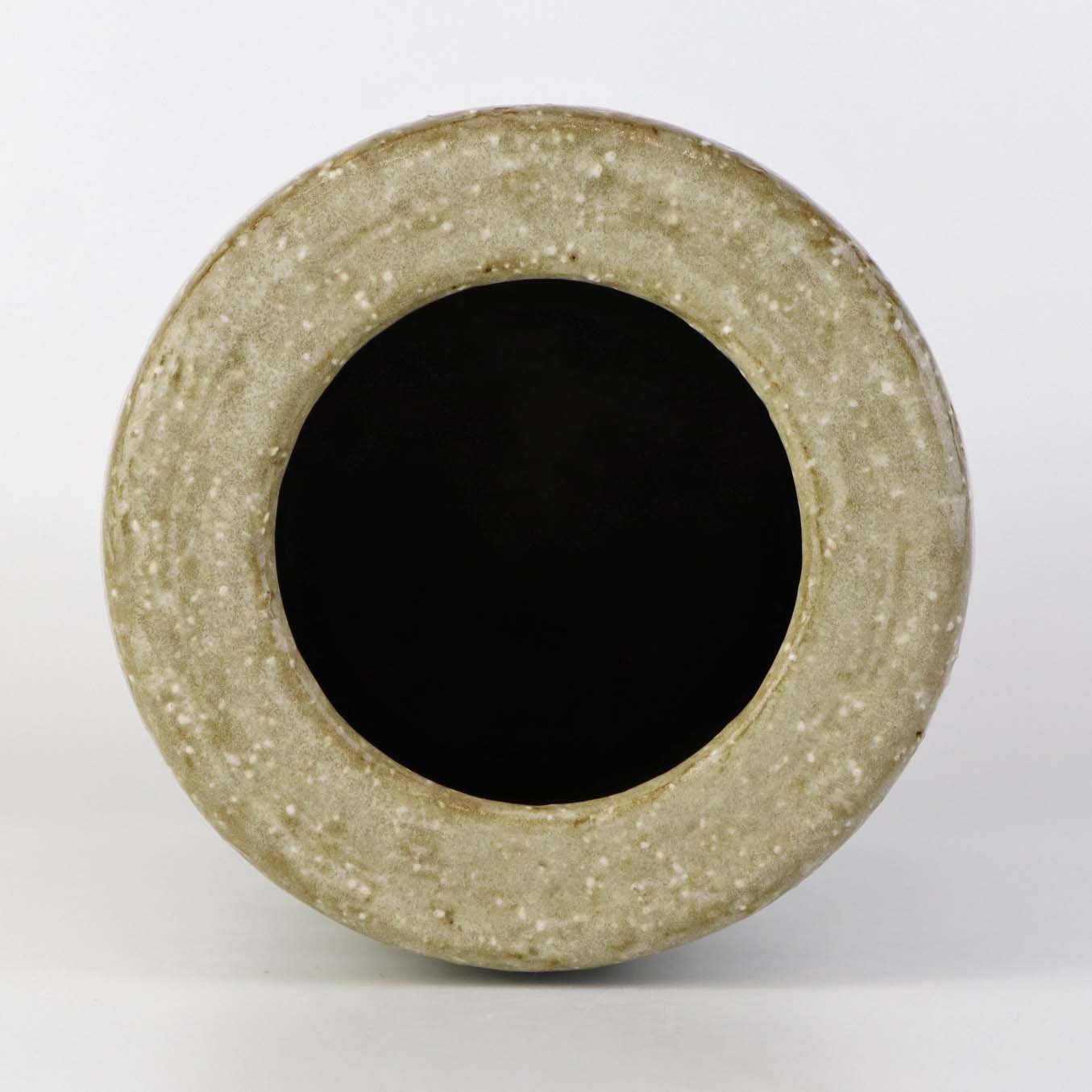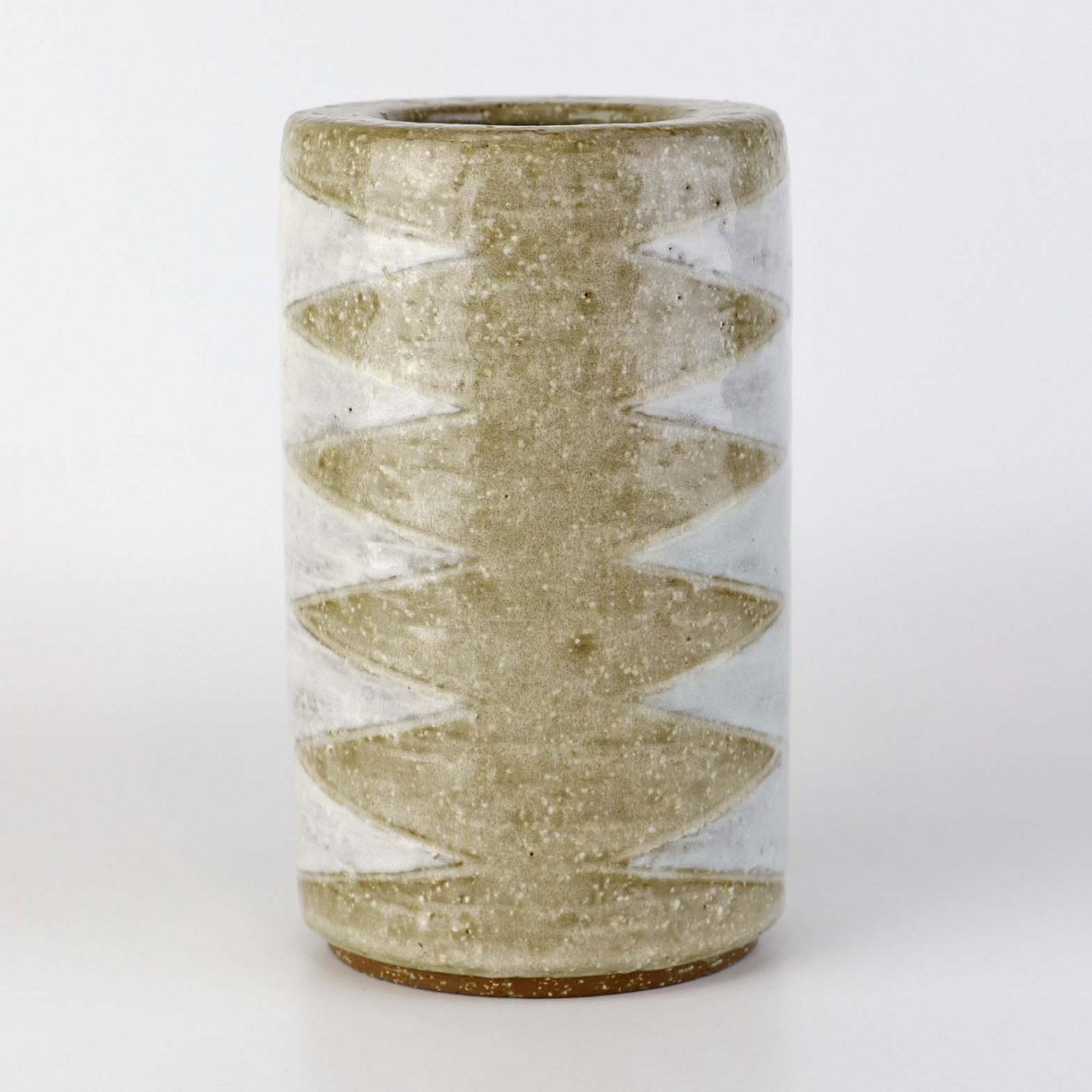 Cylinderformet vase i glaseret stentøj med kantet hvidt geometrisk mønster. Nr. 264