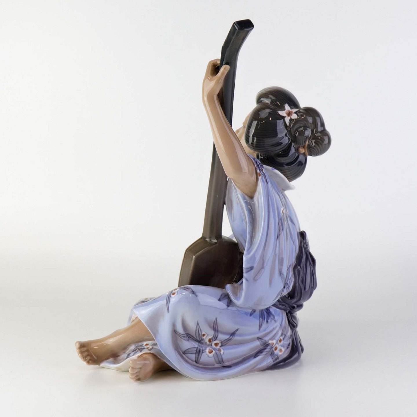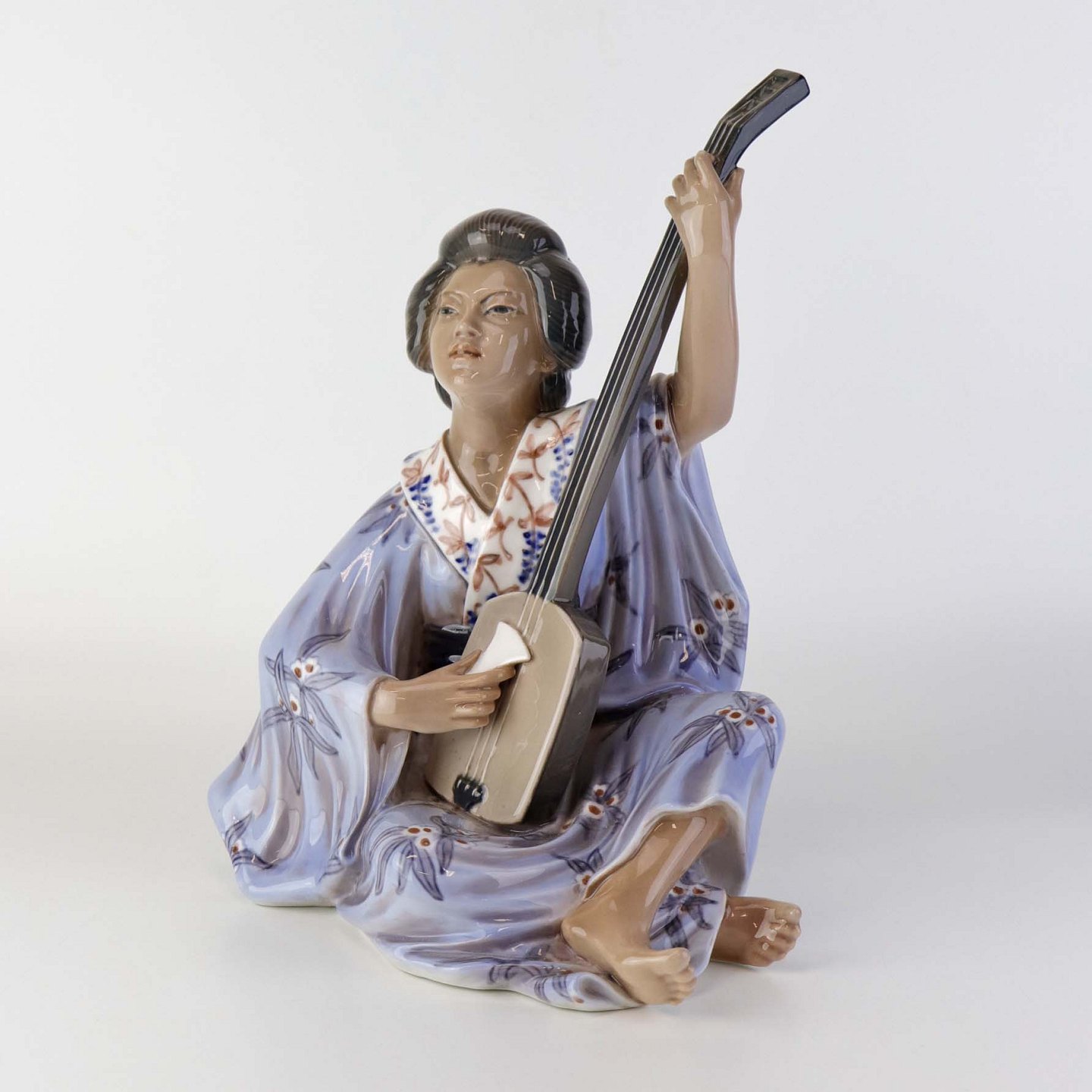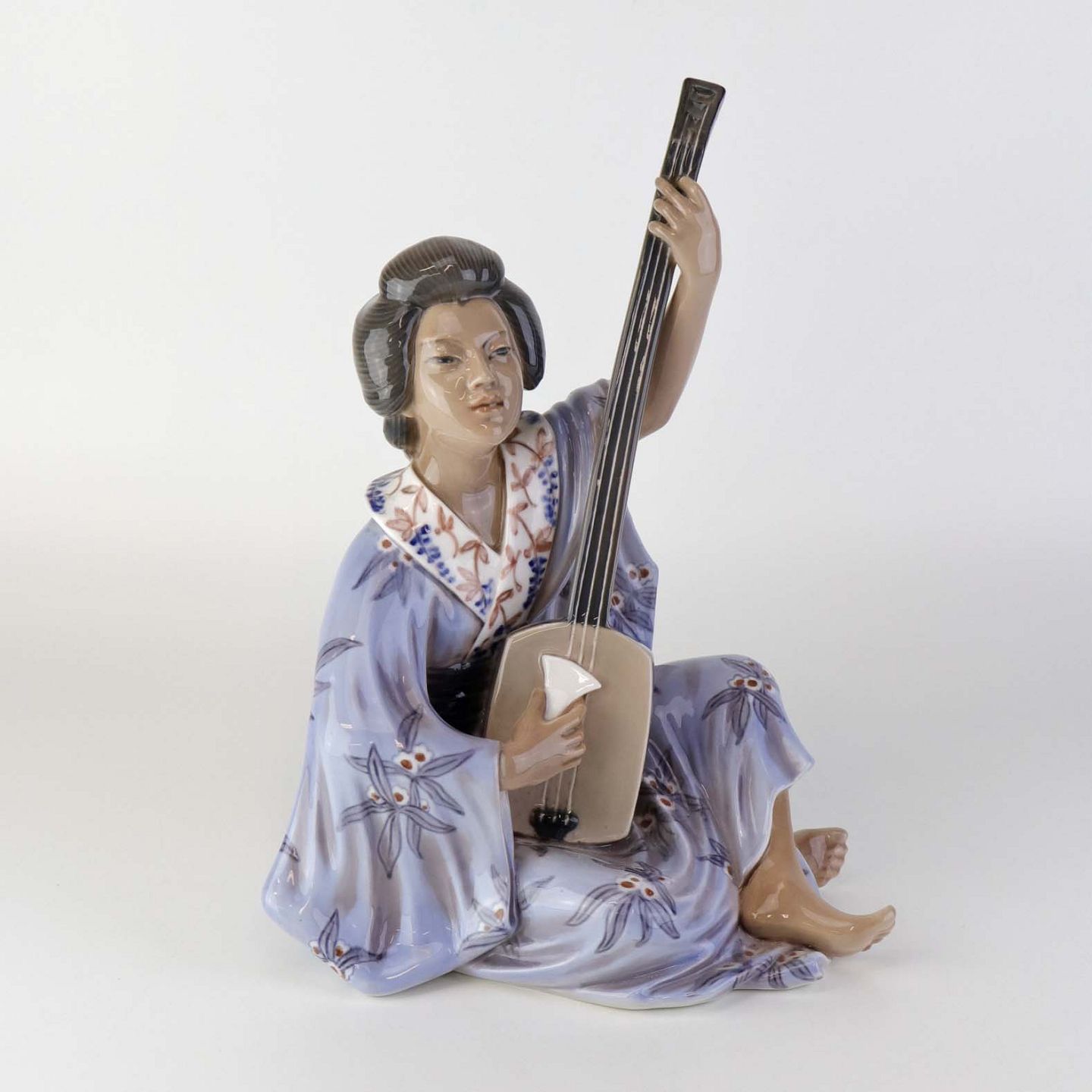 Figur i porcelæn med motiv af siddende japansk Geisha som spiller lut. Nr. 1155