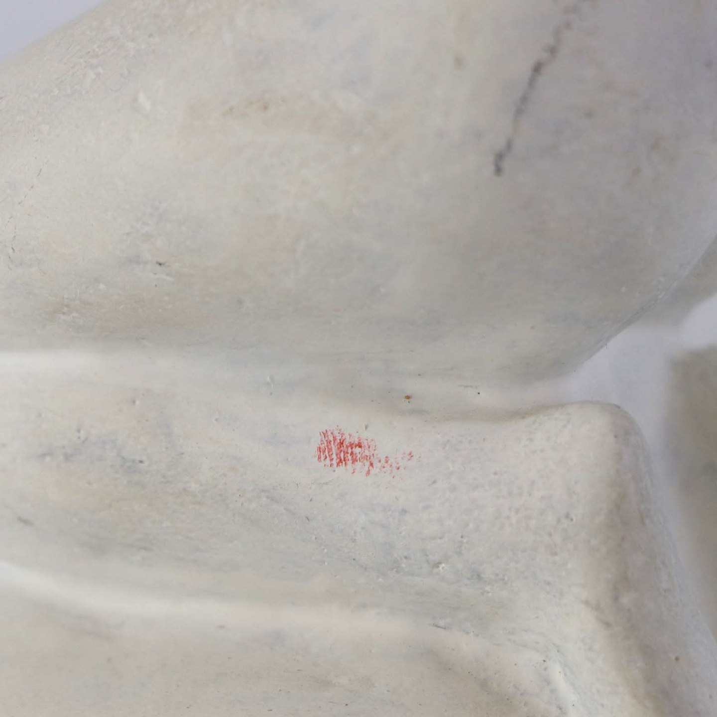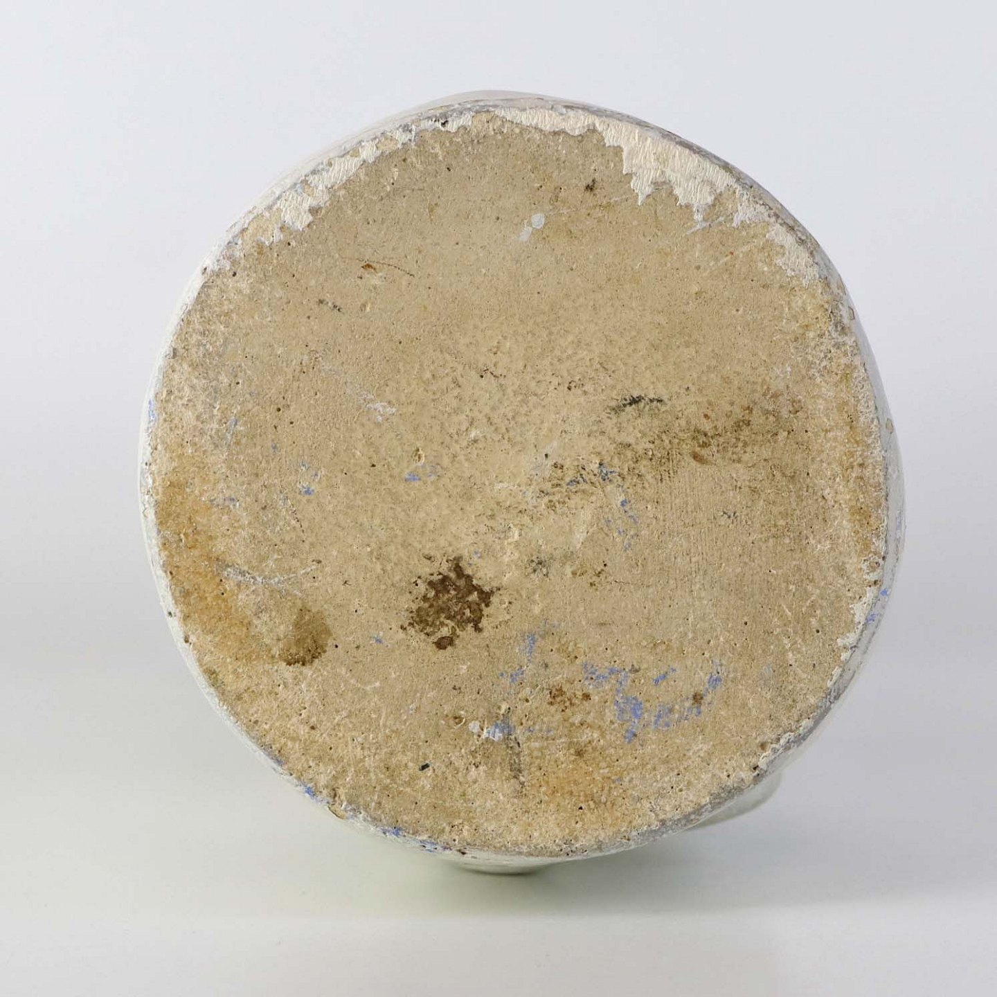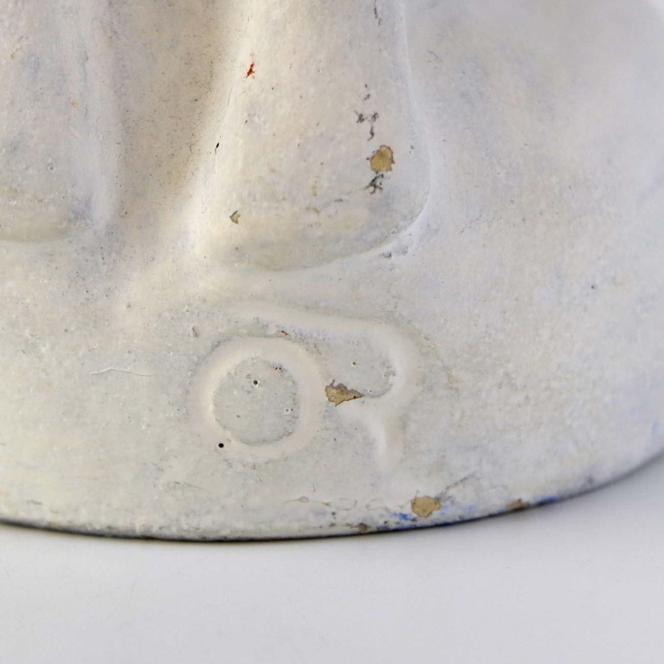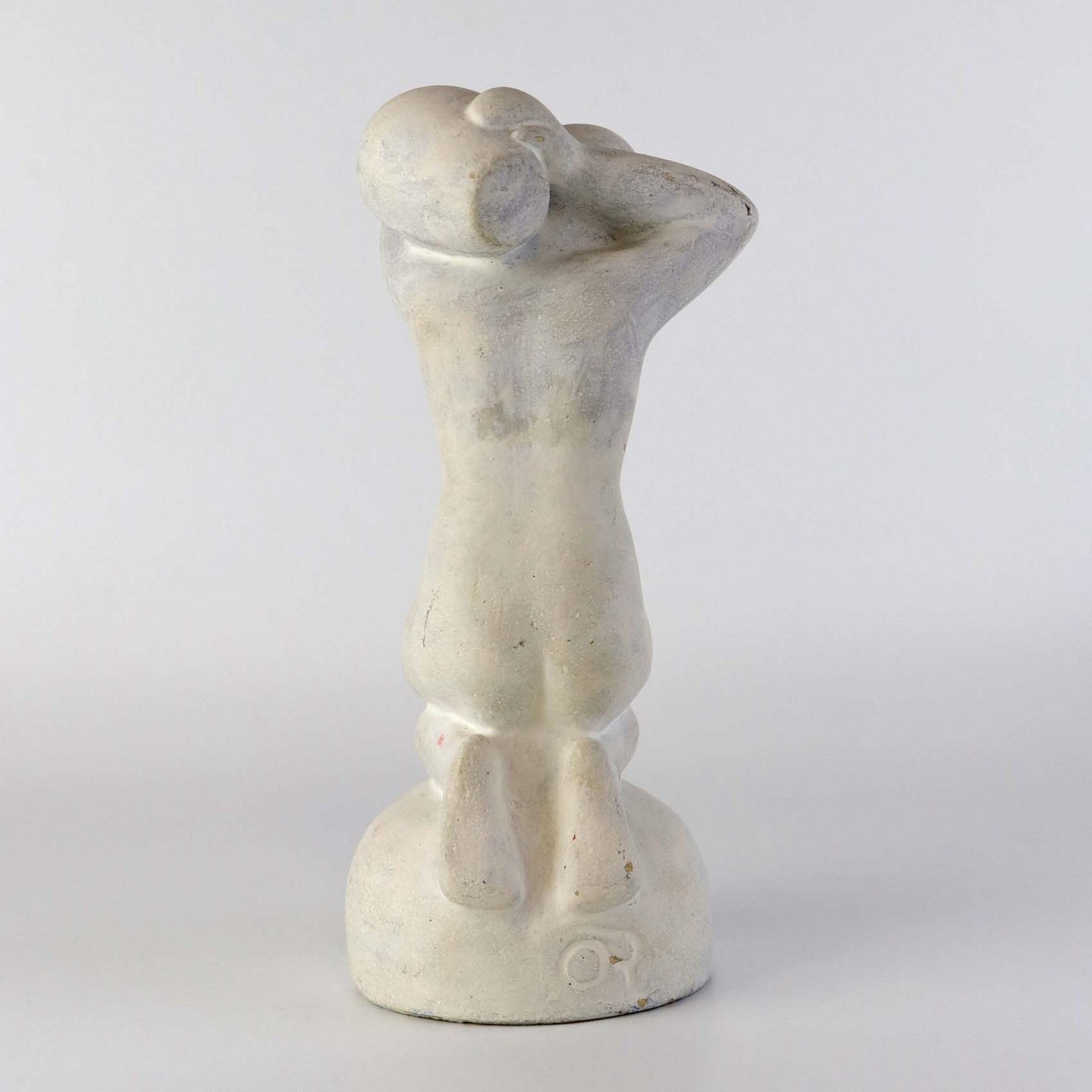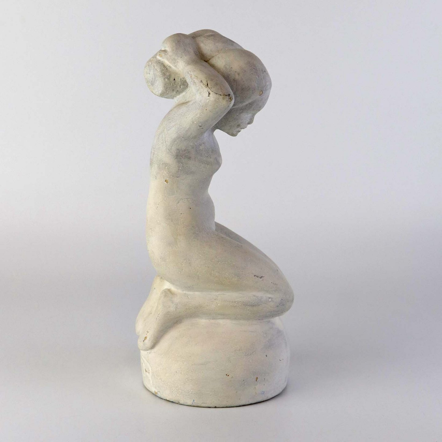 Figur i hvidmalet sandsten med motiv af siddende kvinde med vandekrukke.