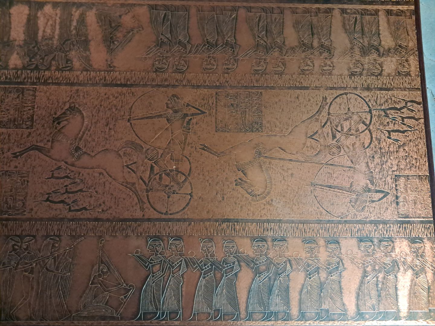 Sofabord med egyptiske motiver i palisander med metalplade, fra 1970erne.