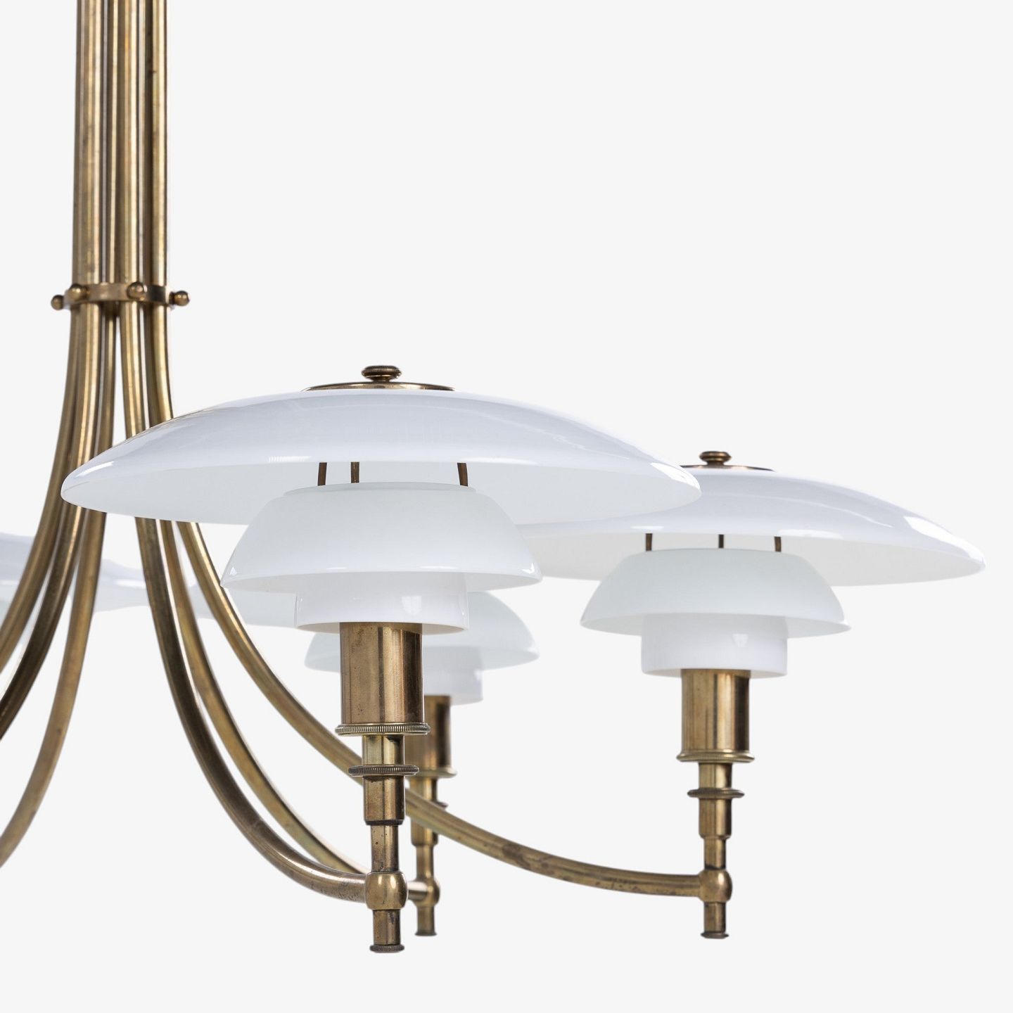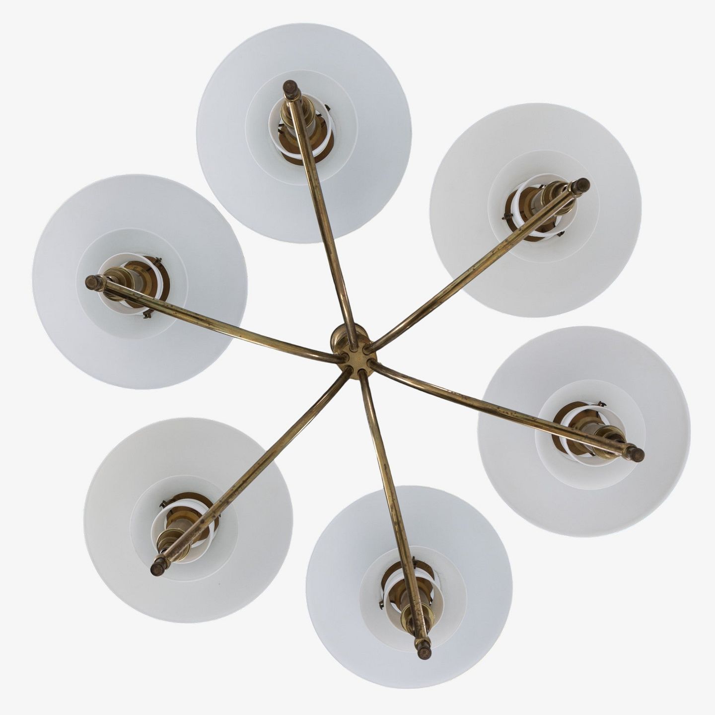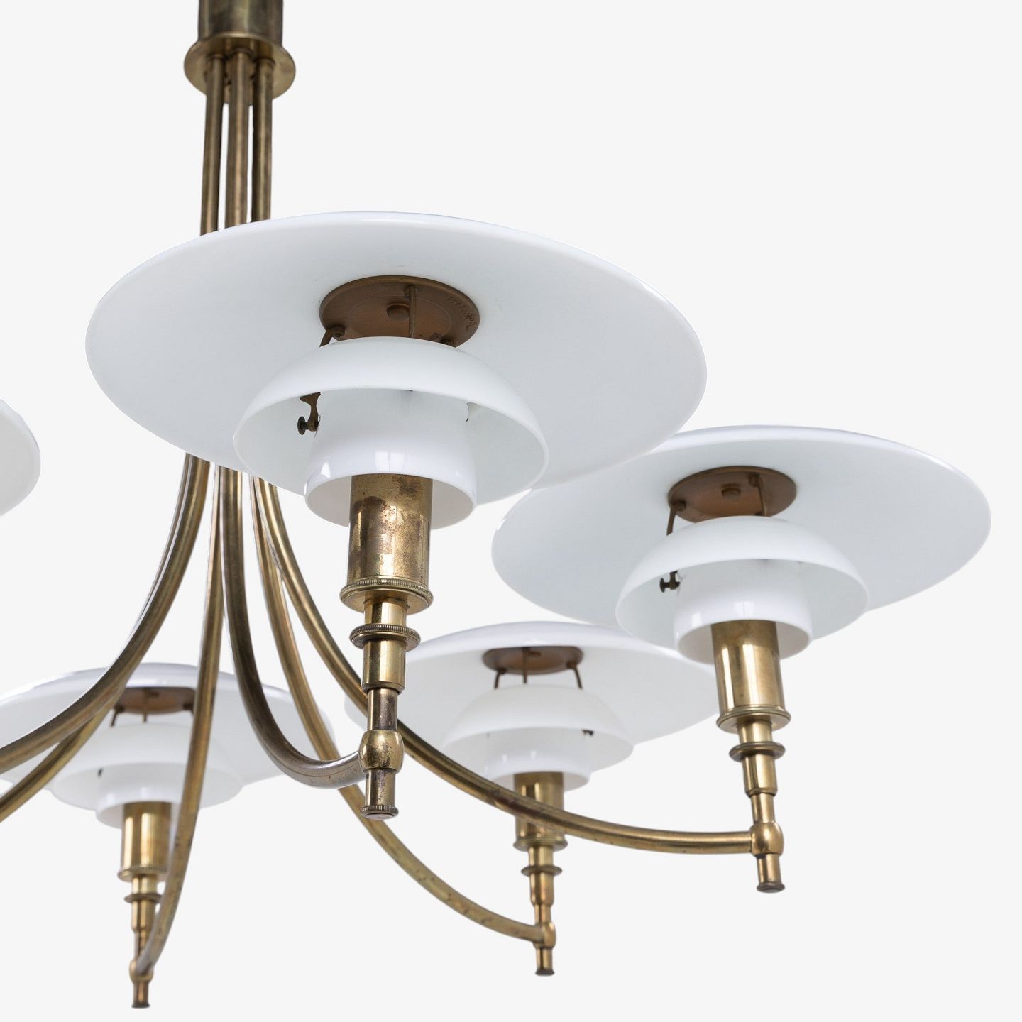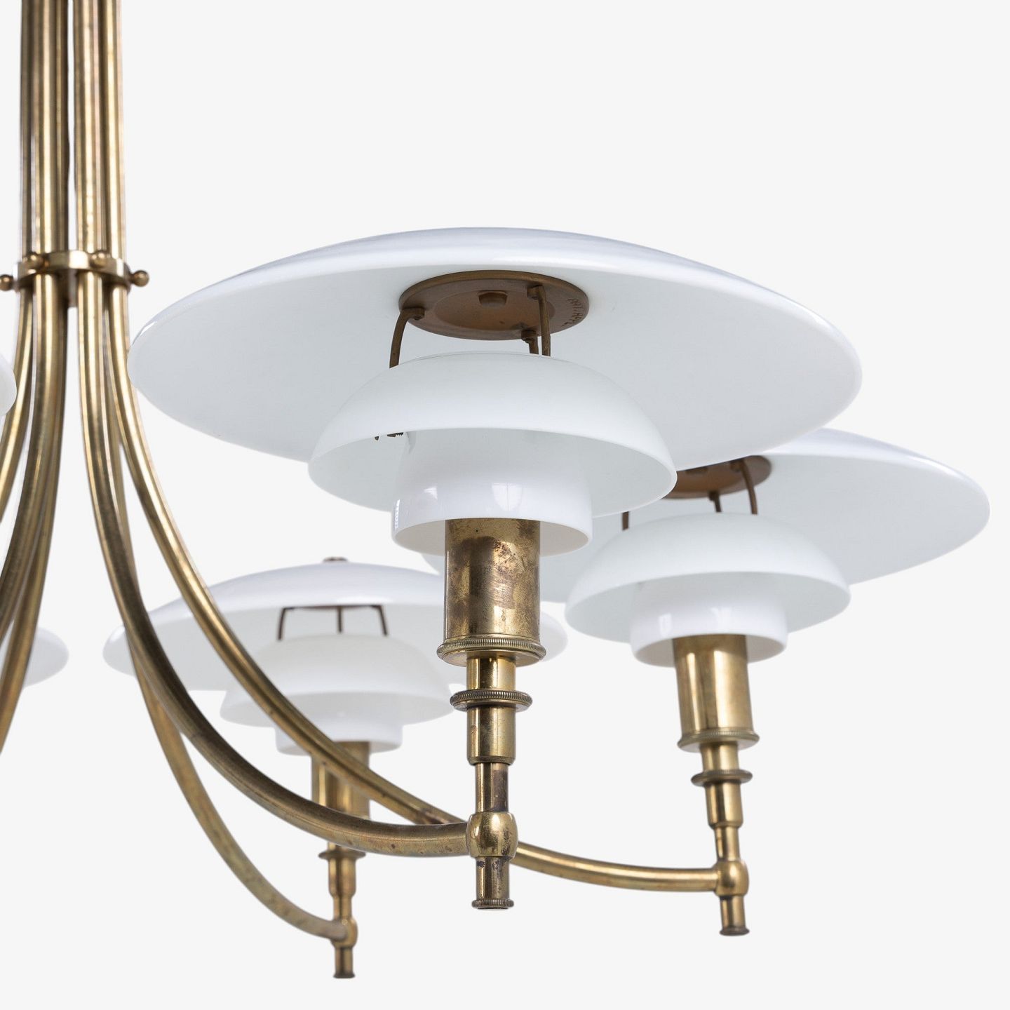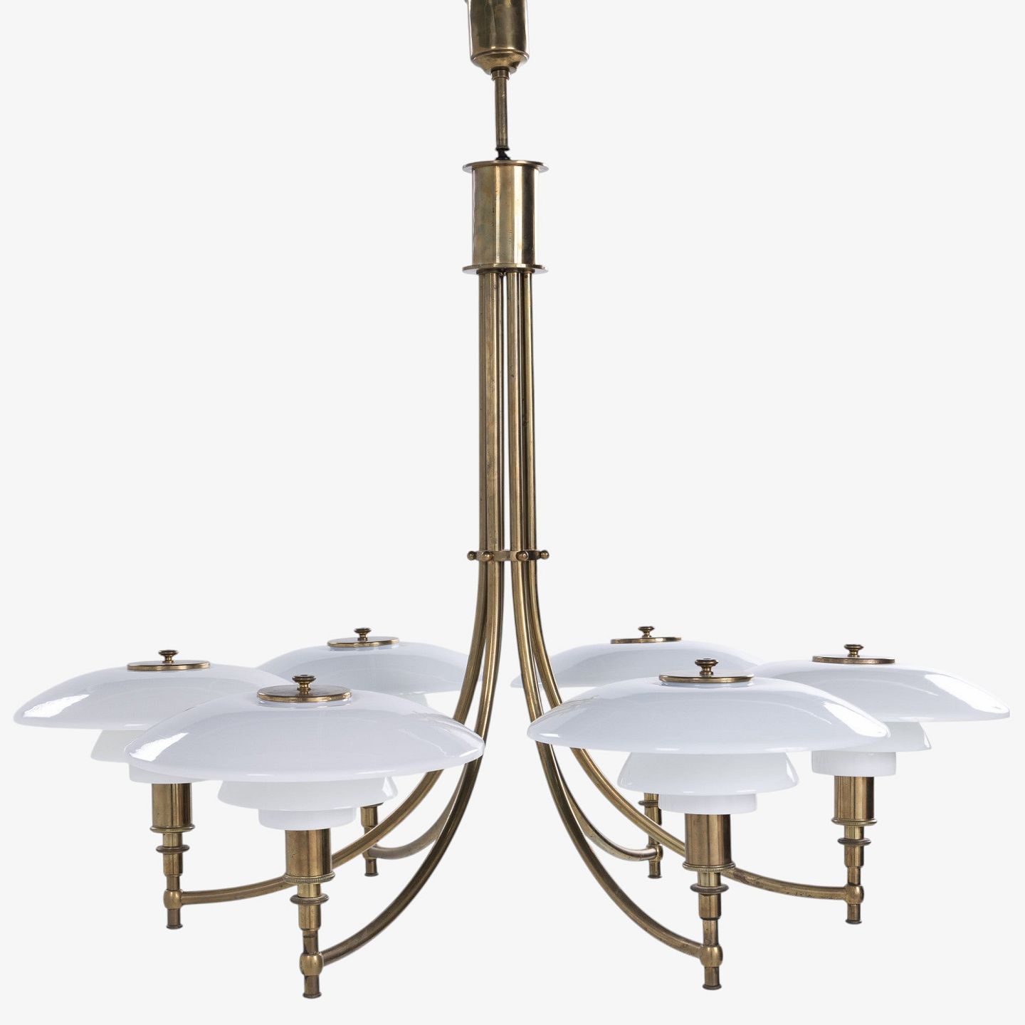 PH 3/2 - Seks-armet 'Ankerkrone' i messing med skærme i ét-lags hvidt opalglas. Formgivet mellem 1929-1936. Stemplet 'PAT. APPL.'