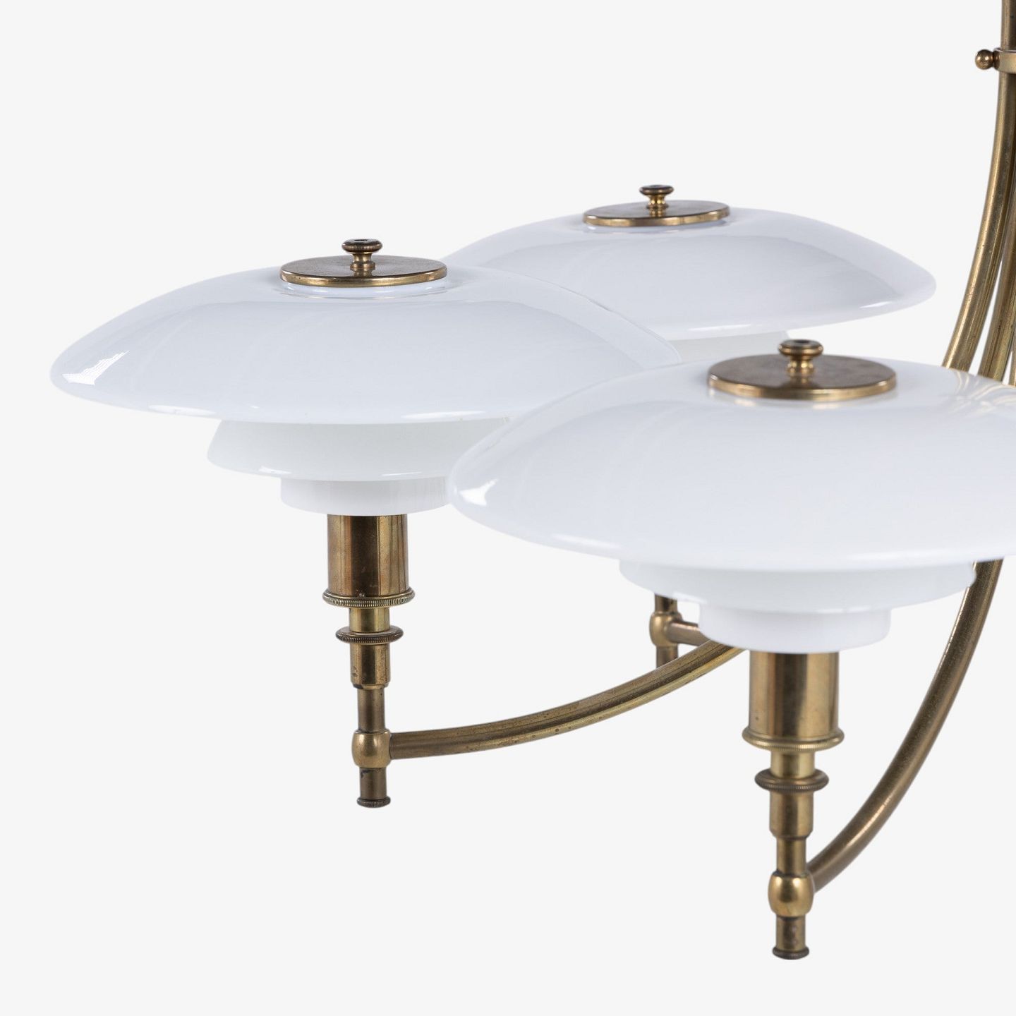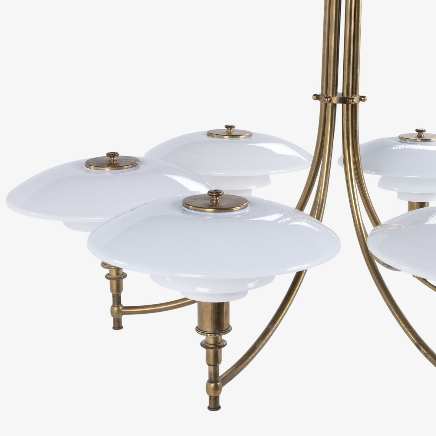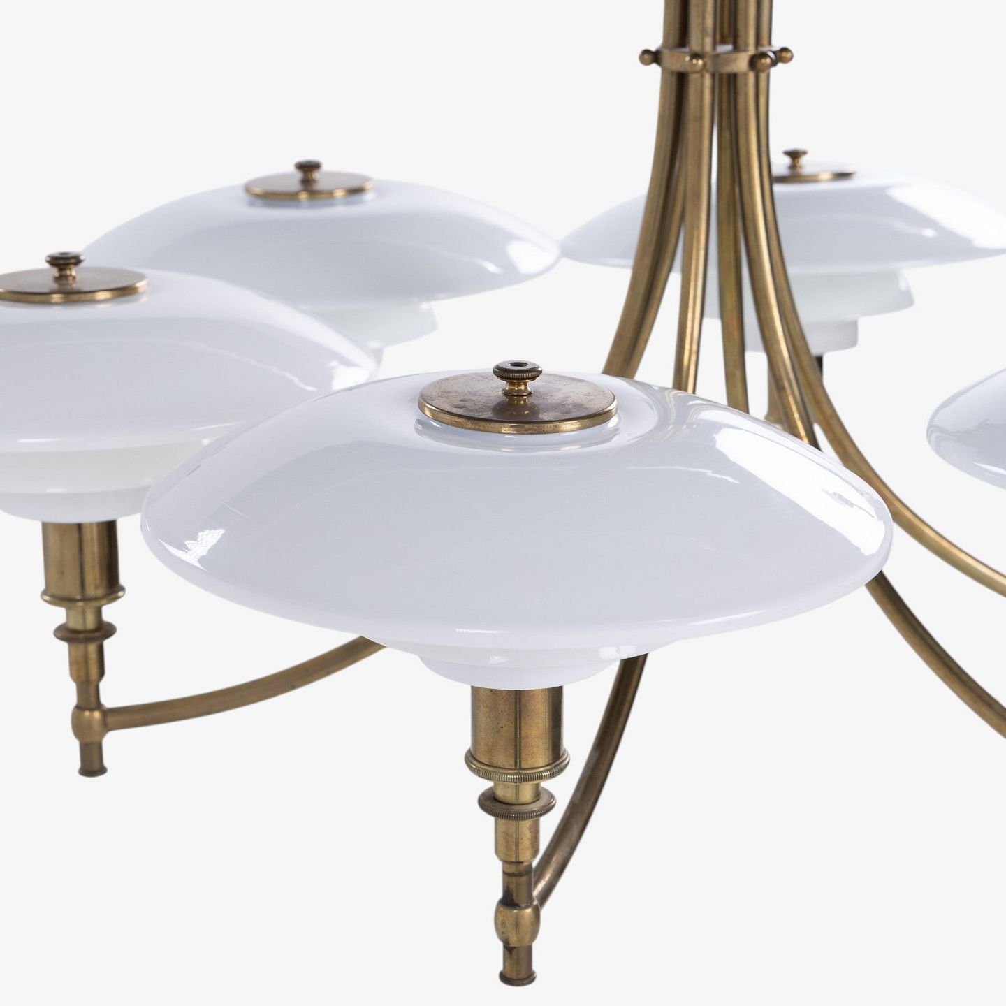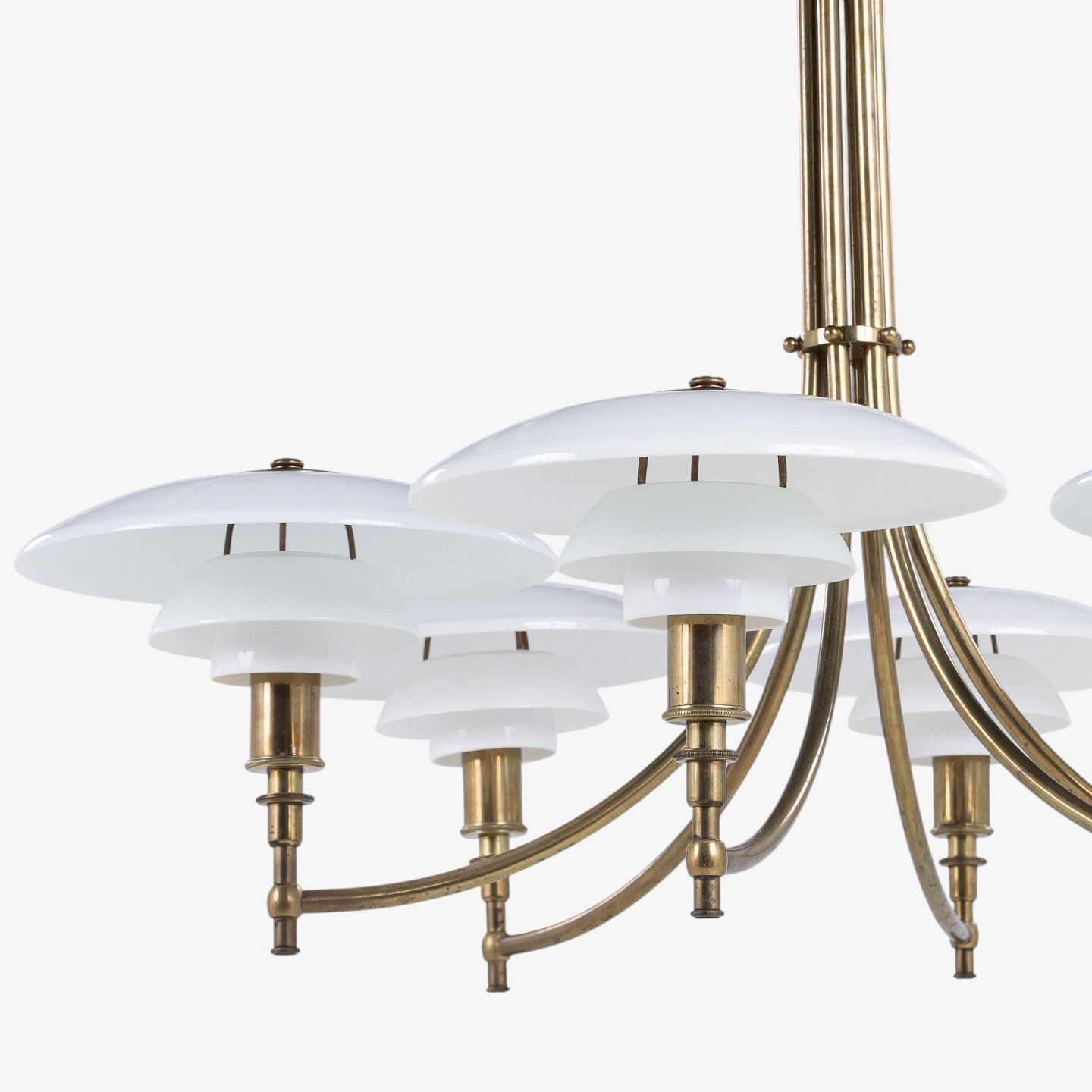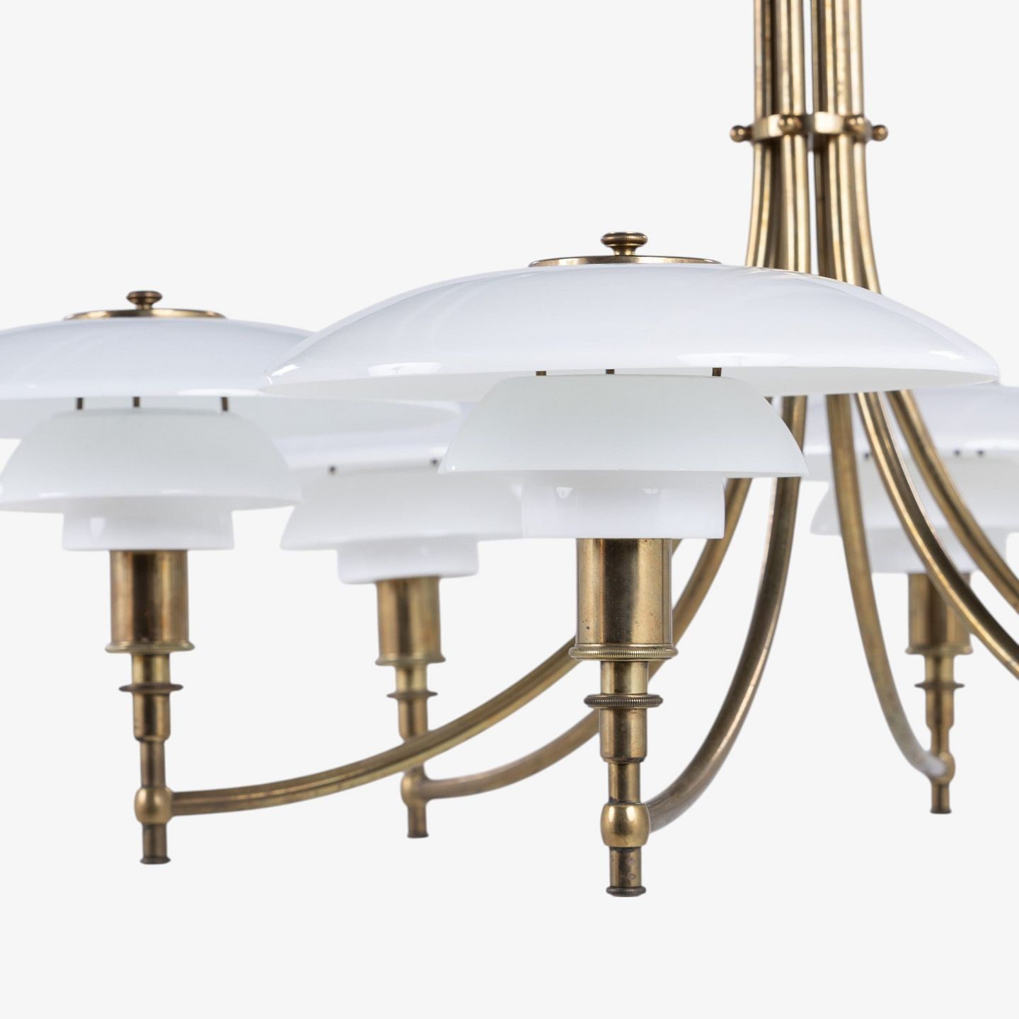PH 3/2 - Seks-armet 'Ankerkrone' i messing med skærme i ét-lags hvidt opalglas. Formgivet mellem 1929-1936. Stemplet 'PAT. APPL.'