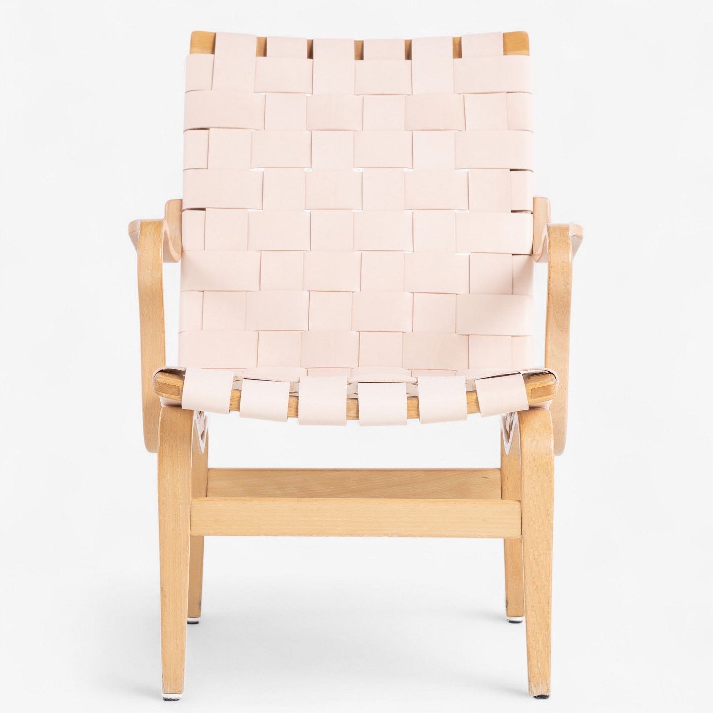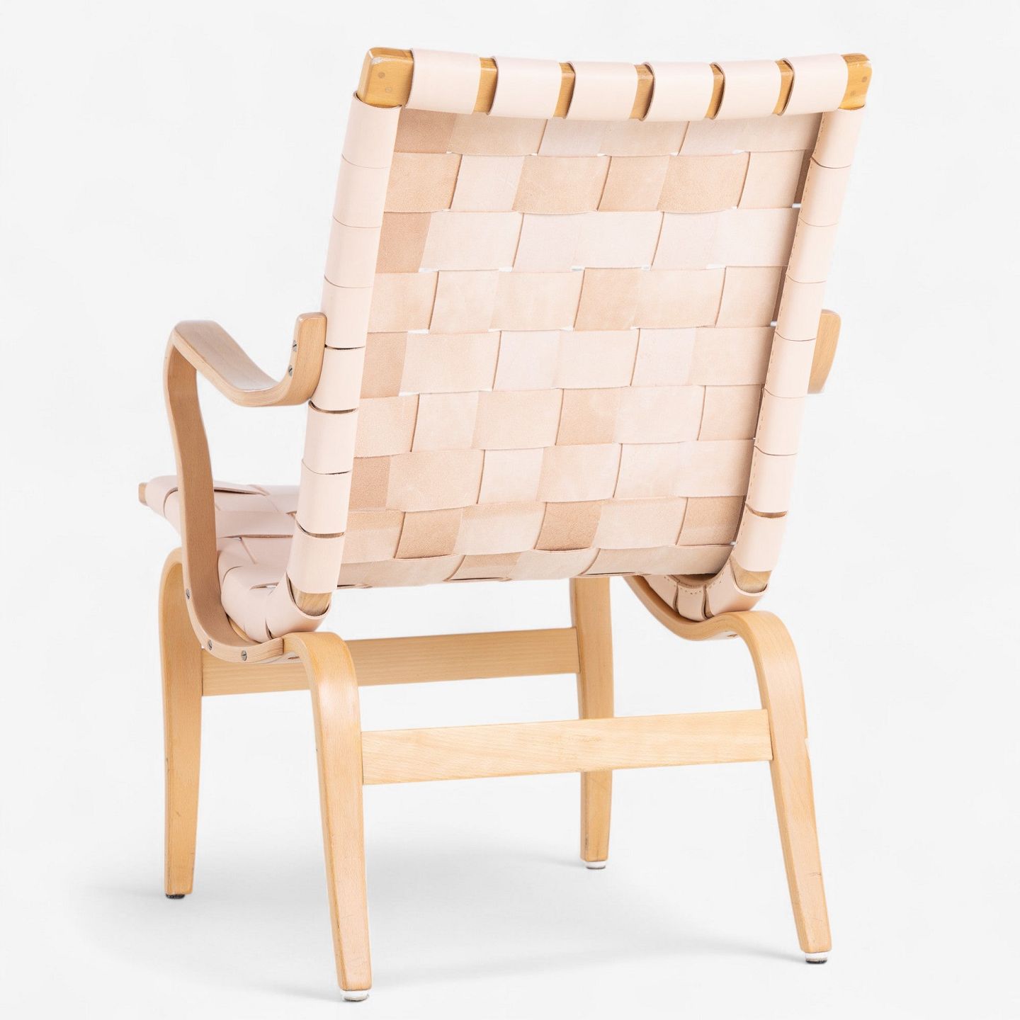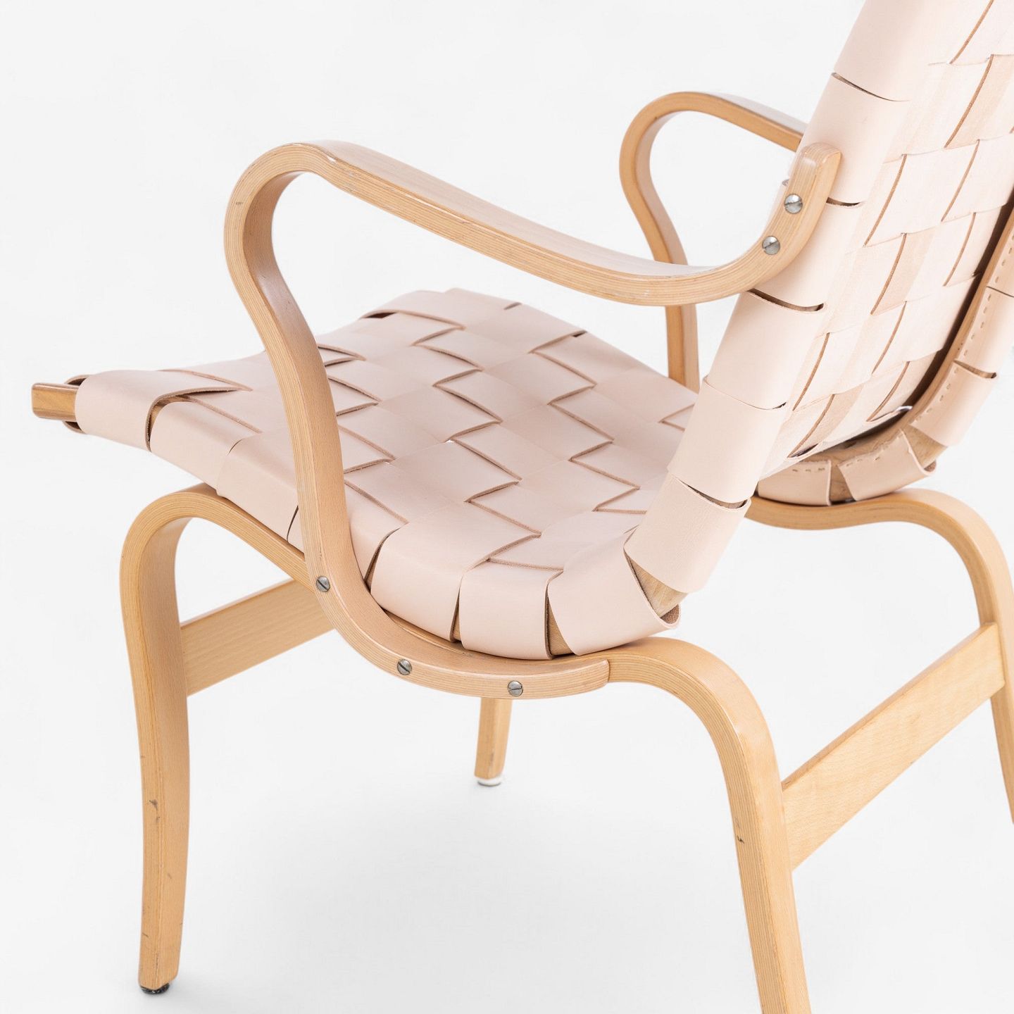 'Eva' armchair in patinated beech with braided natural grain leather. Manufacturer's mark.
