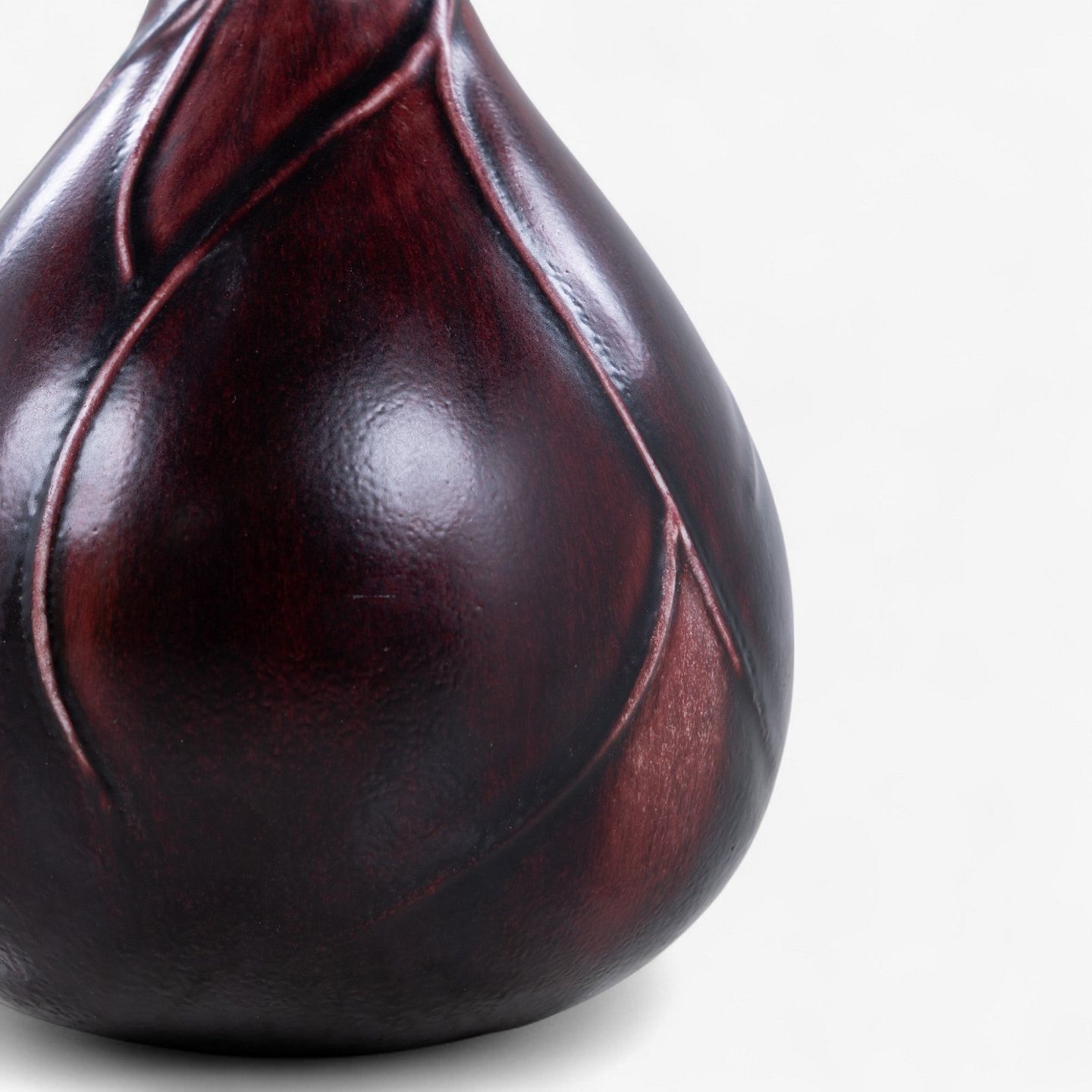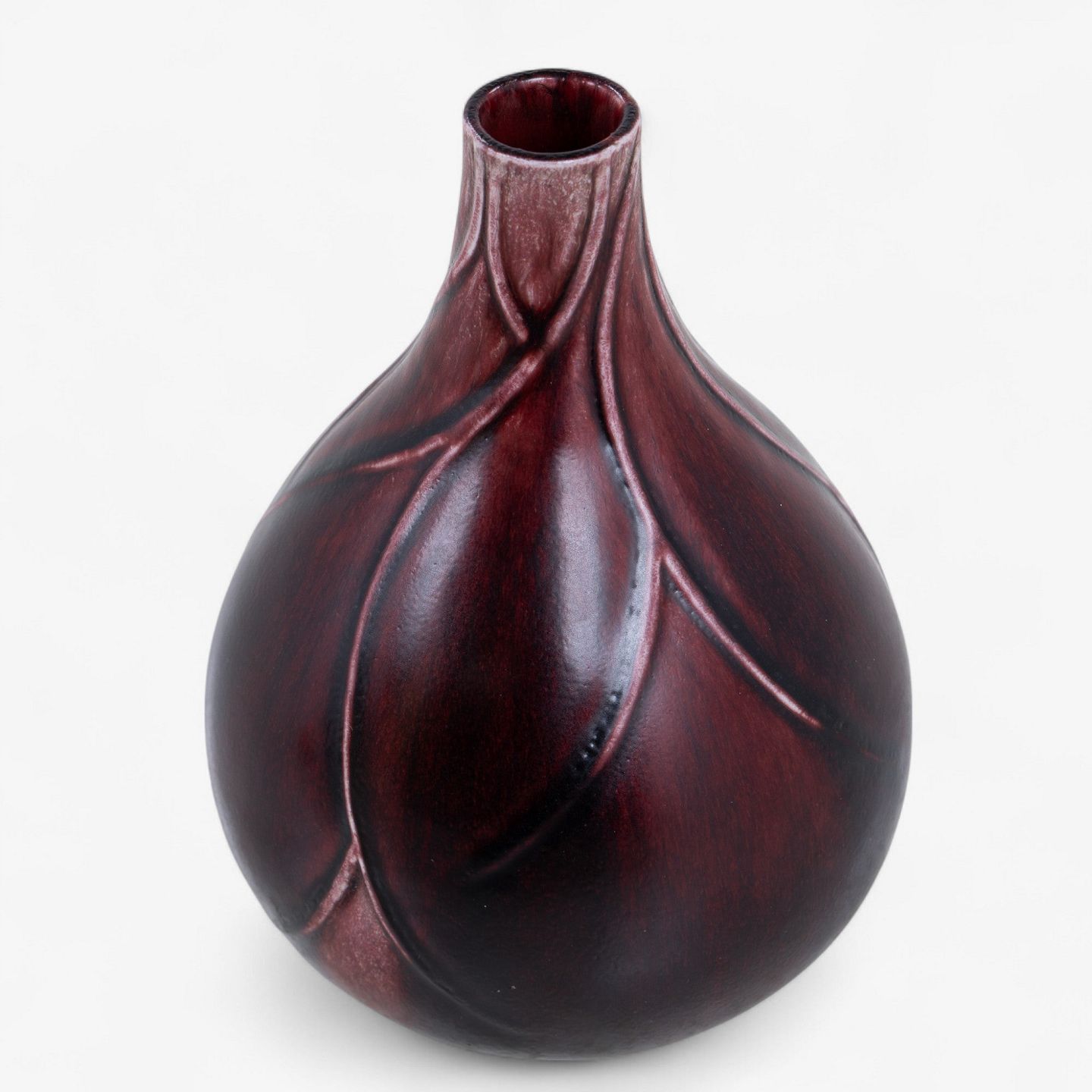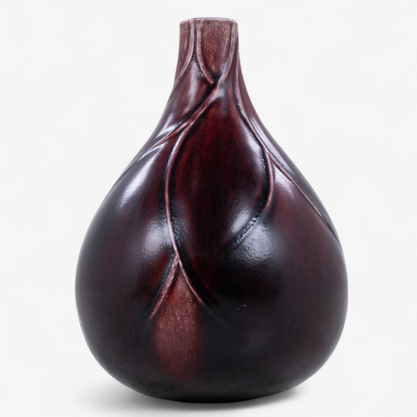 Løgformet stentøjsvase modelleret med relief og dekoreret med okseblodsglasur. Signeret.