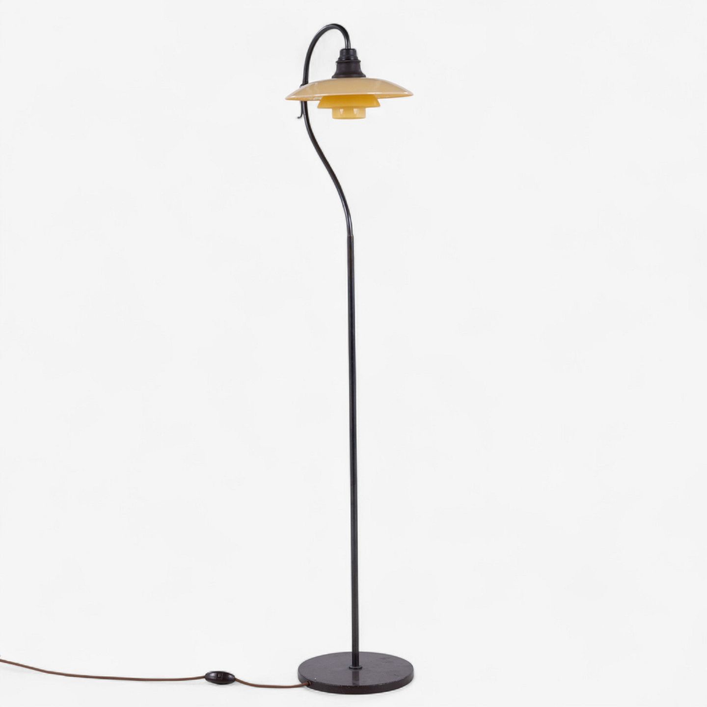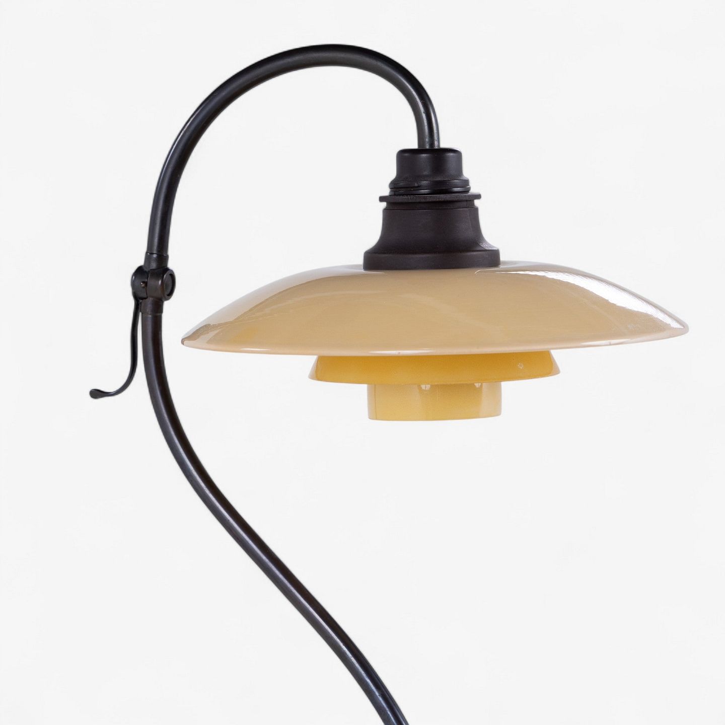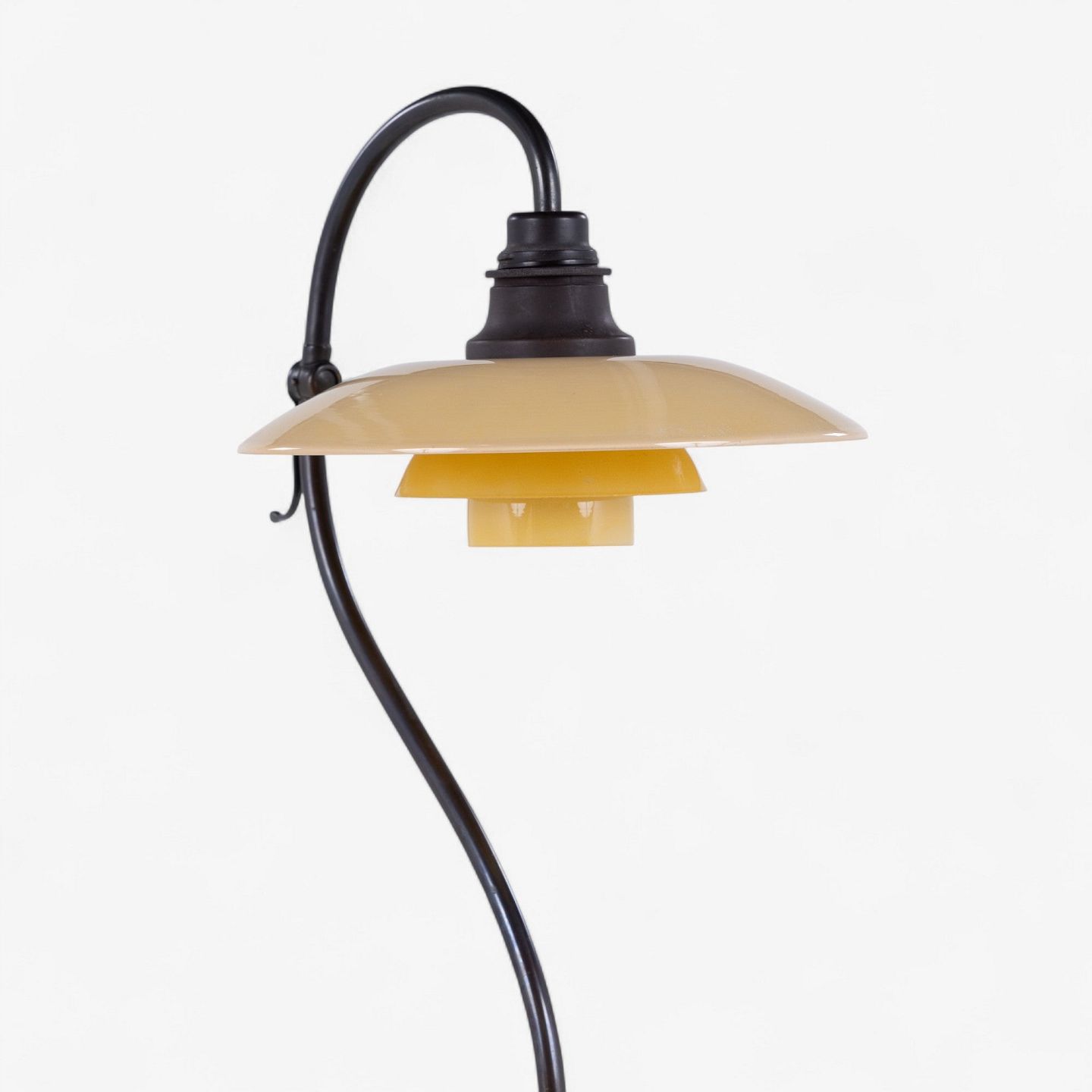 PH 3/2 - 'Spørgsmålstegnet' standerlampe i bruneret messing, bakelit og skærme i gult glas.