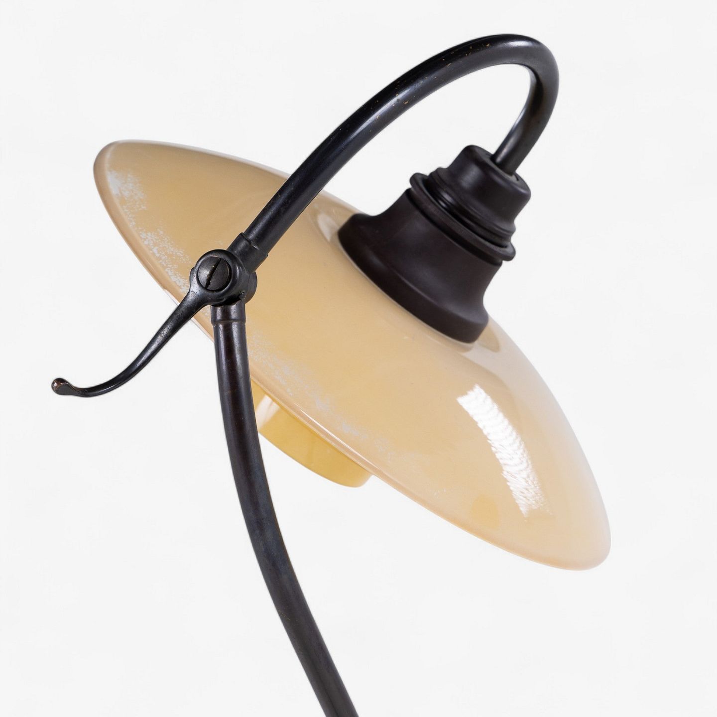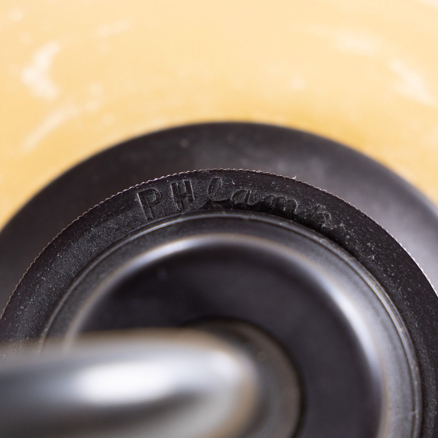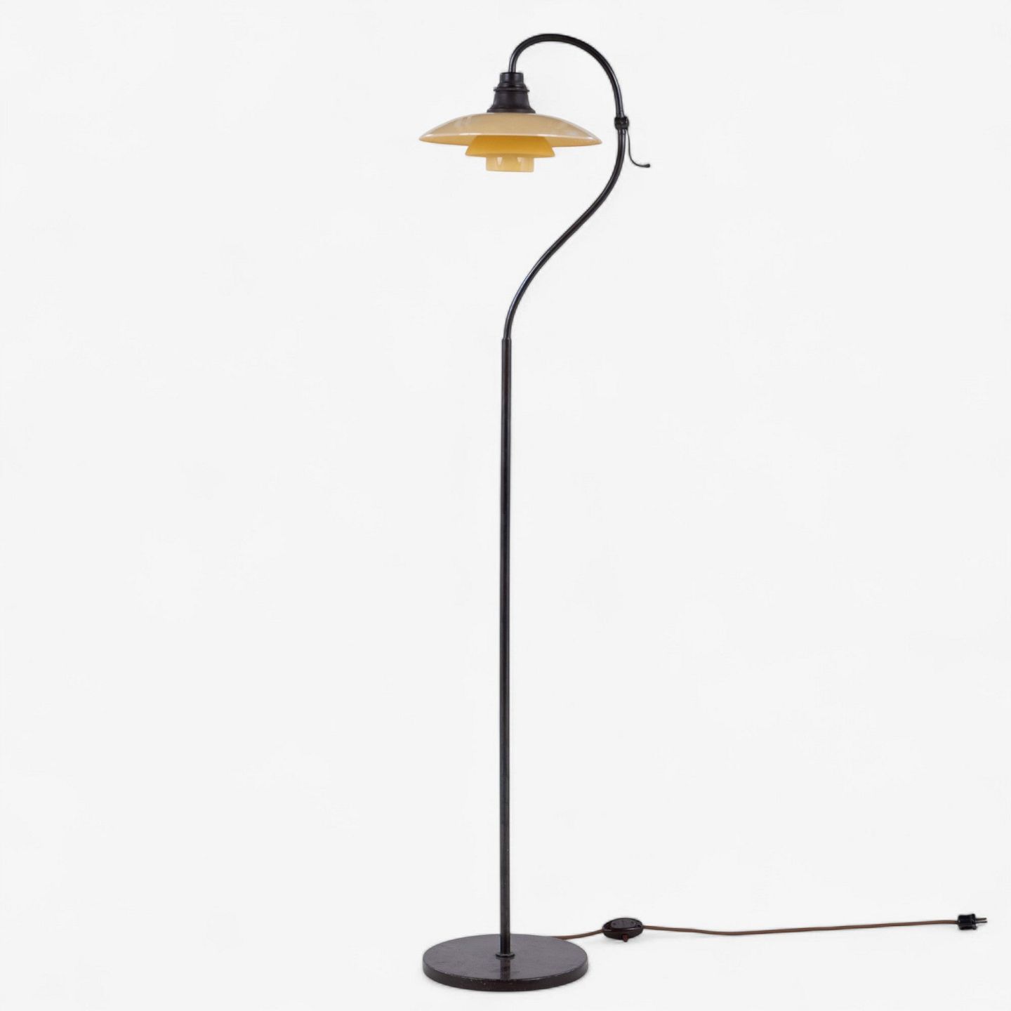 PH 3/2 - 'Spørgsmålstegnet' standerlampe i bruneret messing, bakelit og skærme i gult glas.