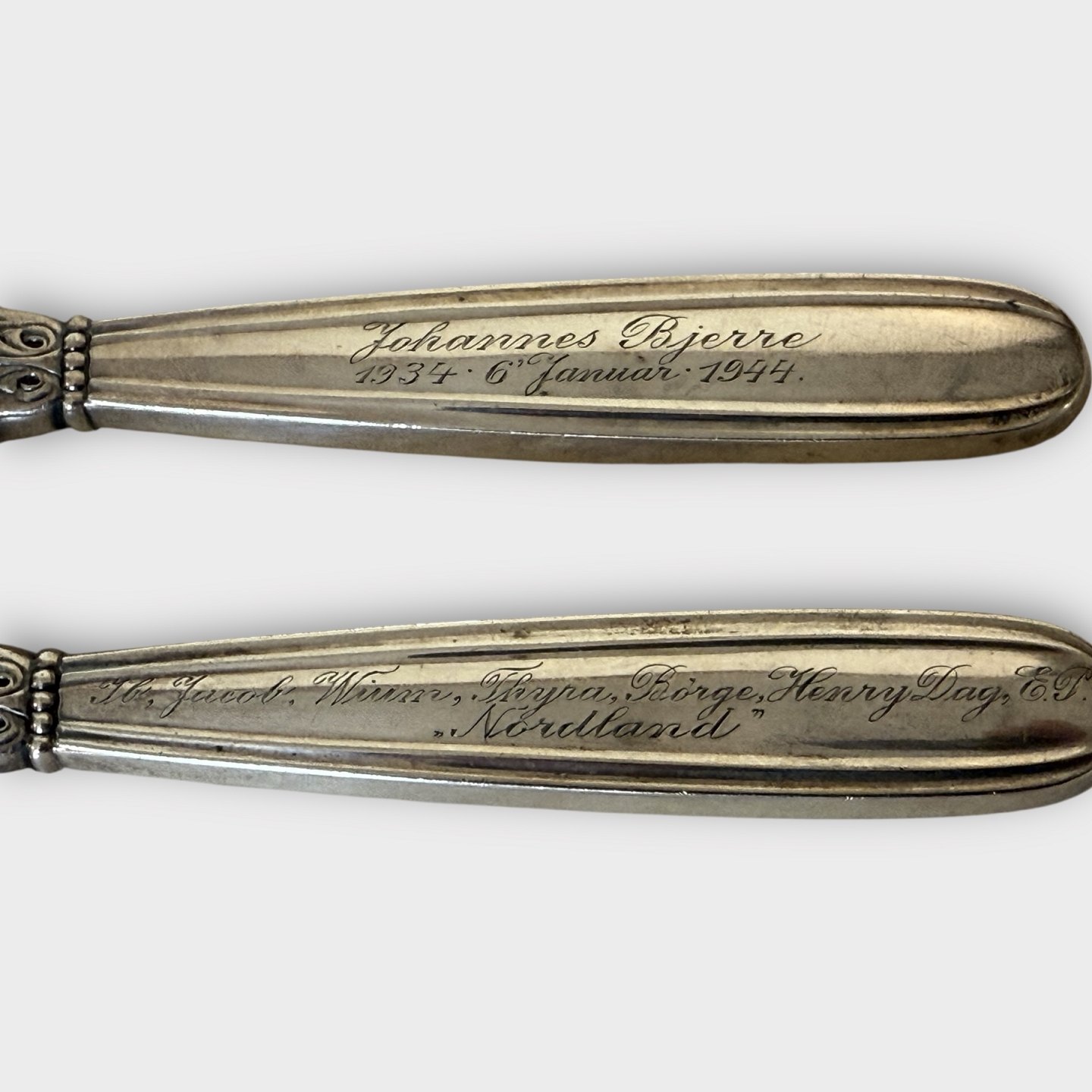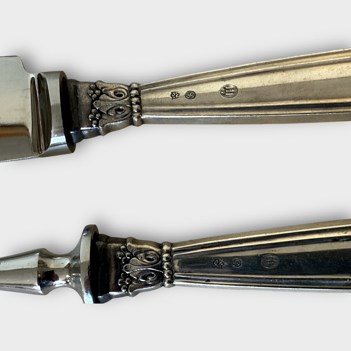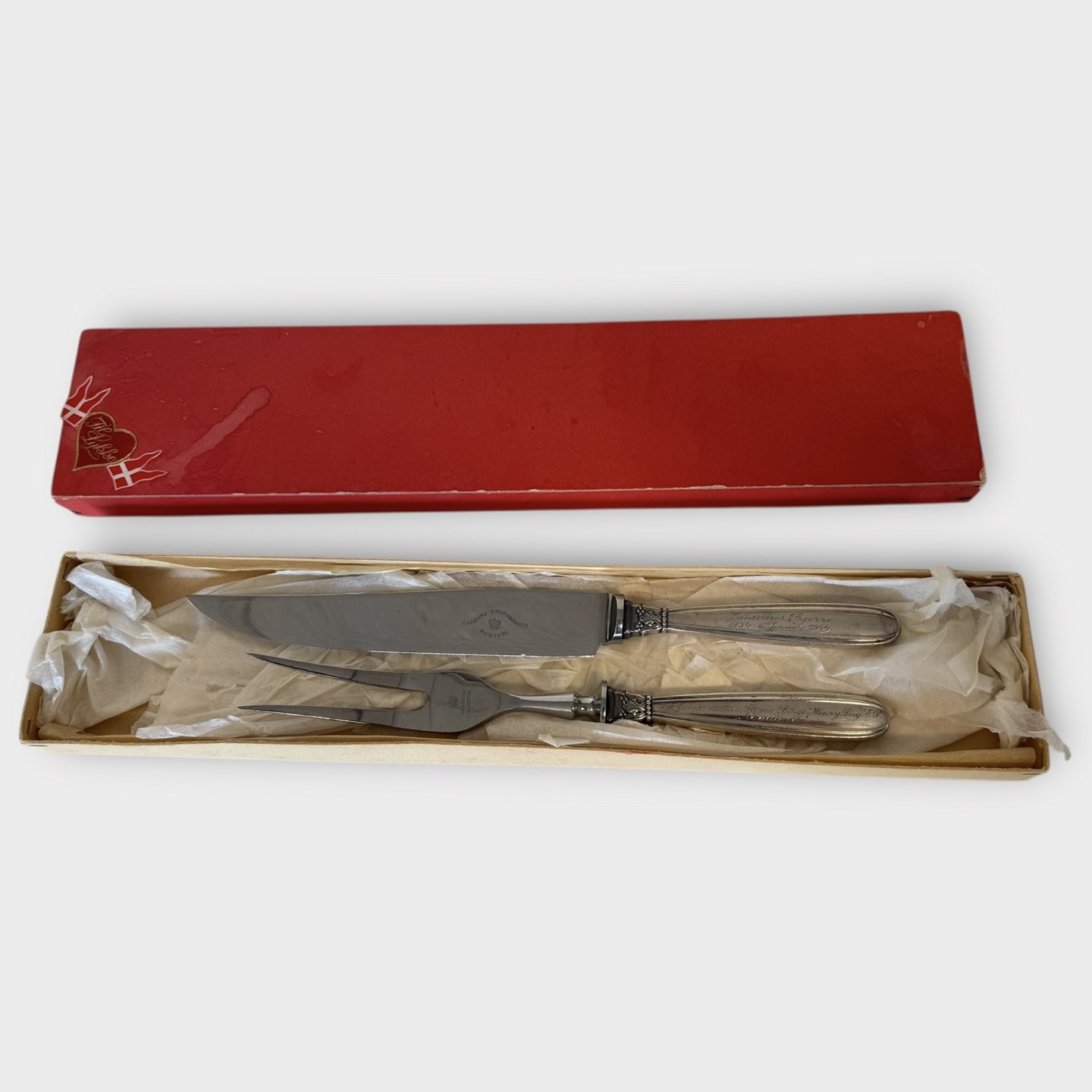 Tranchersæt, Karina, forskæresæt i tretårnet sølv, skafter med indgravering fra 1944 ( Fra Nordland), blade i rustfrit stål fra Raadvad knivfabrik, Længde 30,5 og 26cm, fin stand.