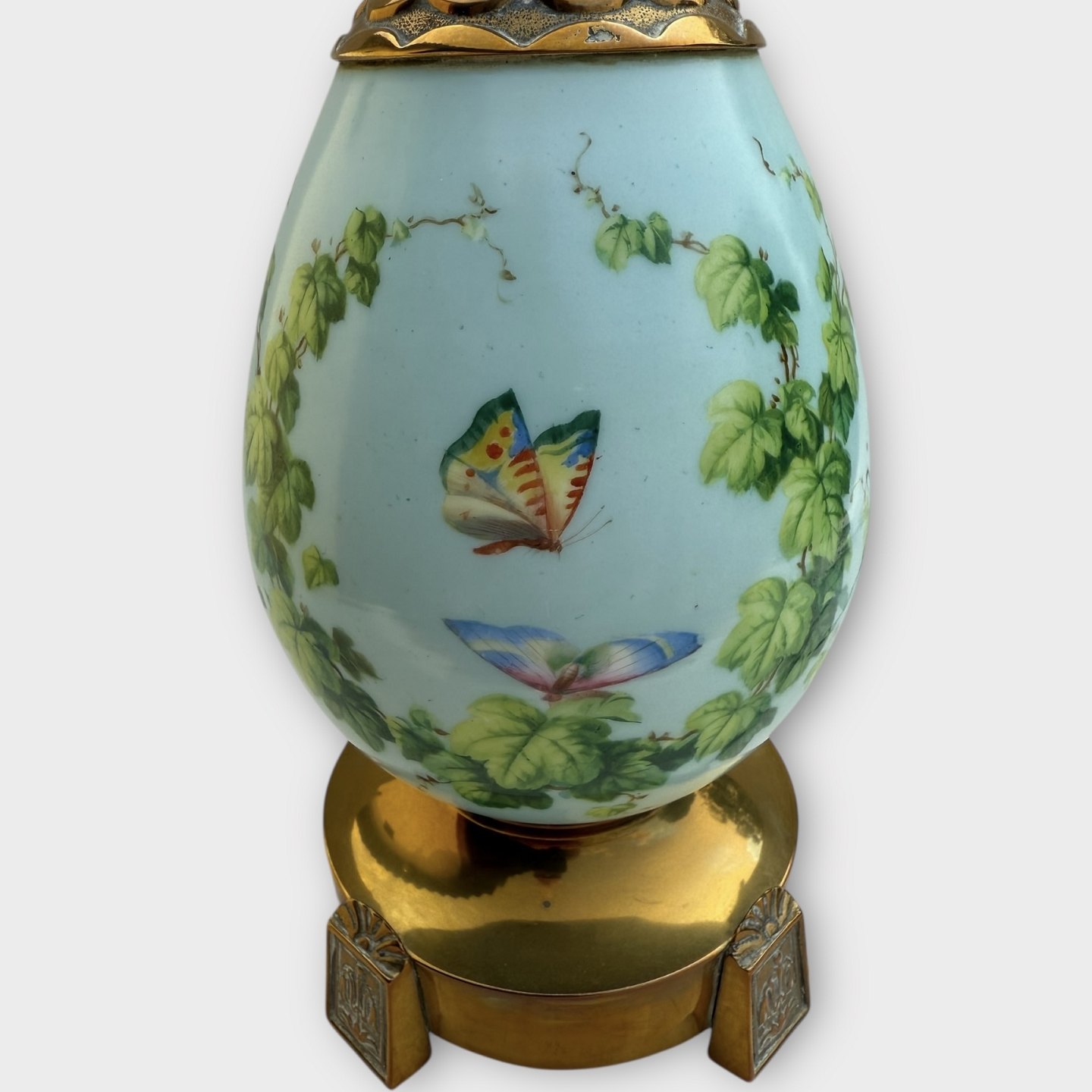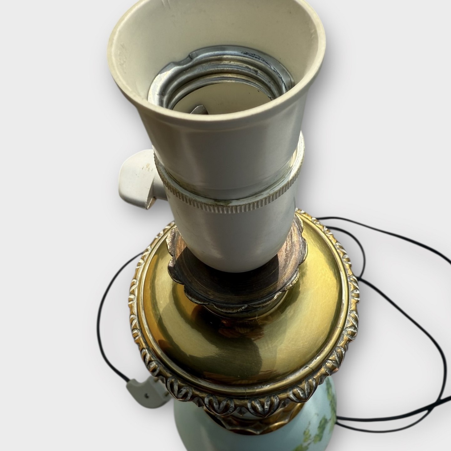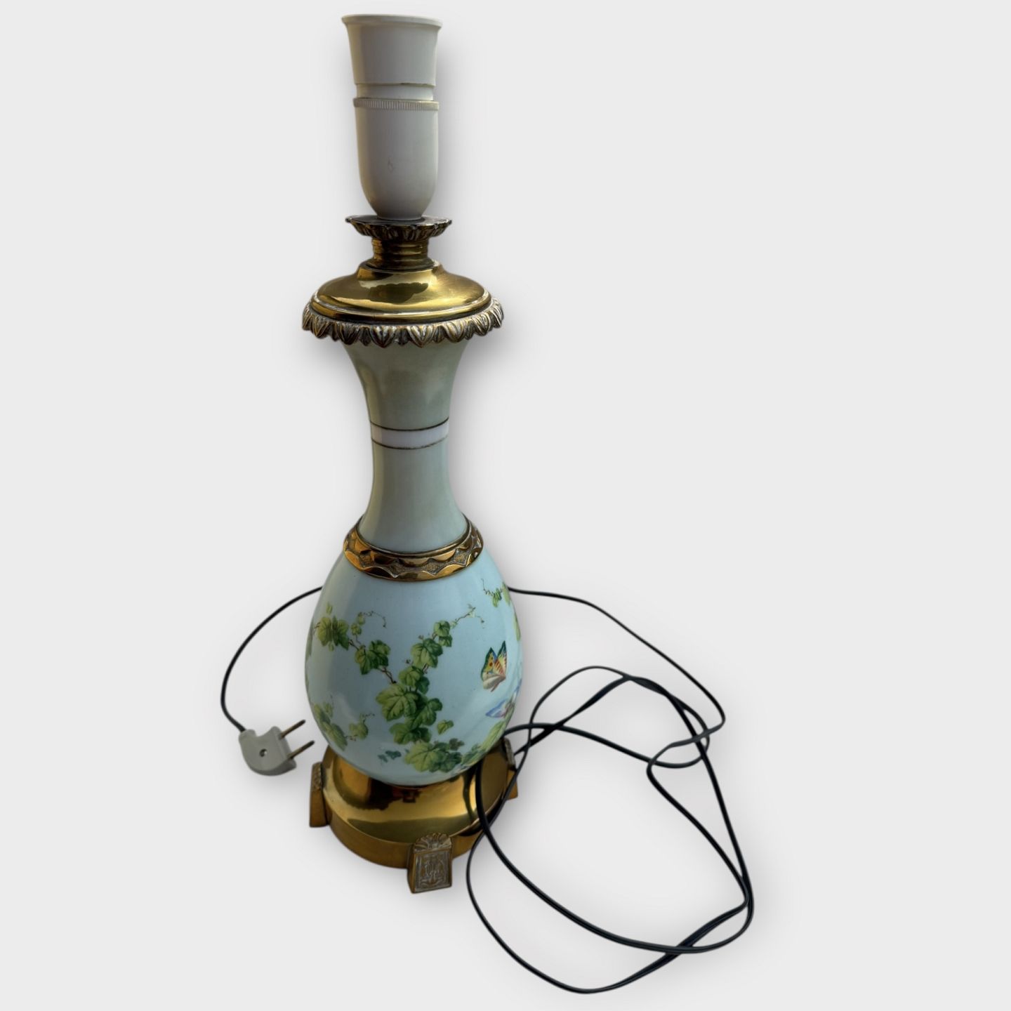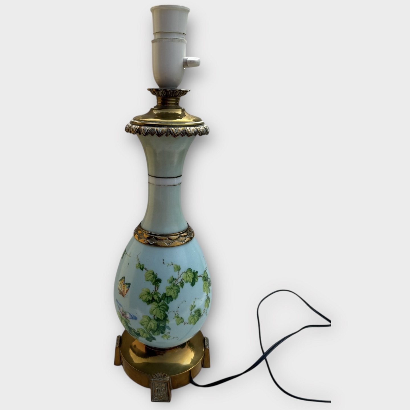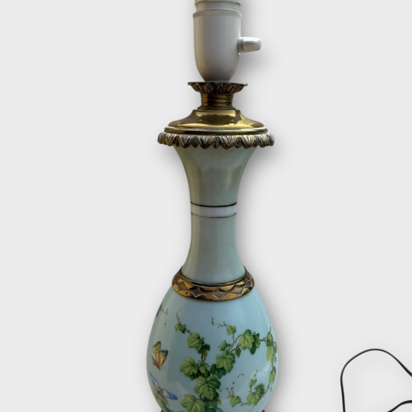 Stor ældre bordlampe bemalet på glas med efeu og sommerfugle, højde med fatning 48 cm, pæn brugt stand.