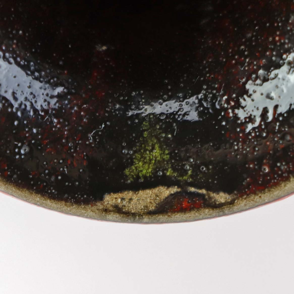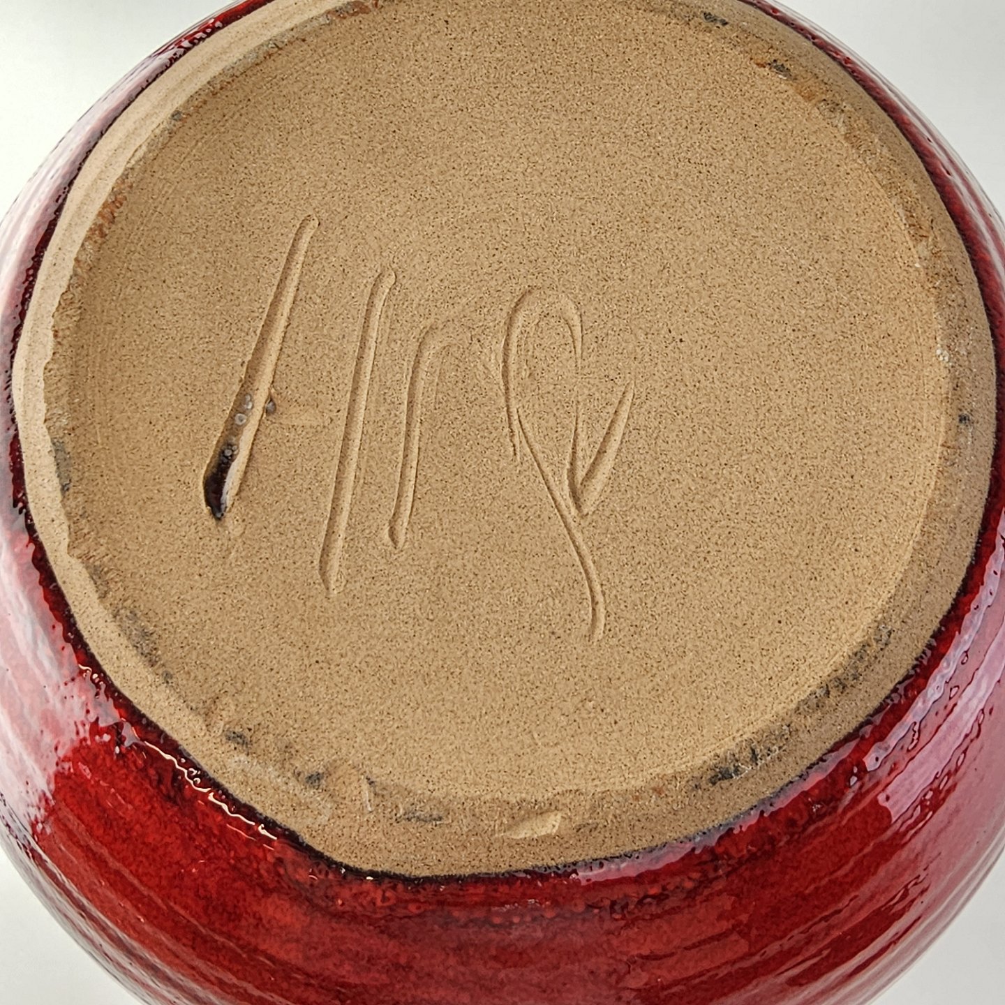 Rund vase i keramik med slank hals og let rillet mønster. Vasen er med rød og orange glasering.