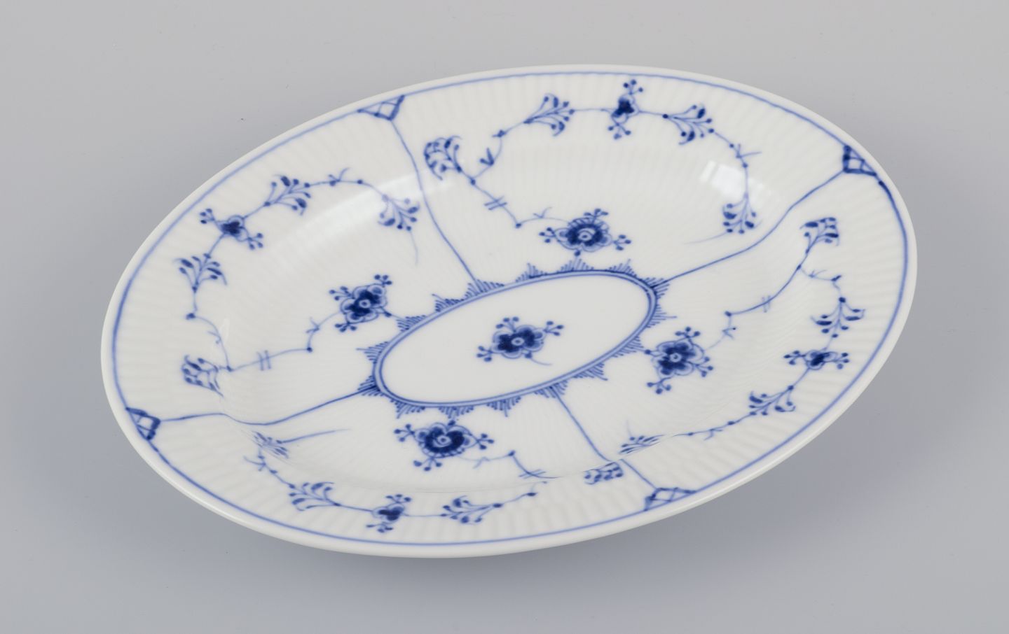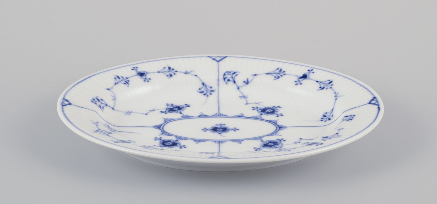 Musselmalet (also known as “Blue Fluted”) is a classic porcelain pattern from Royal Copenhagen, first introduced in 1775. Inspired by Asian porcelain, it is characterized by its blue hand-painted decorations on a white background. The pattern comes in several versions, including Full Lace, Half Lace, and Plain (Blue Fluted Plain). Musselmalet is an iconic symbol of Danish design and craftsmanship and remains popular and in production to this day.