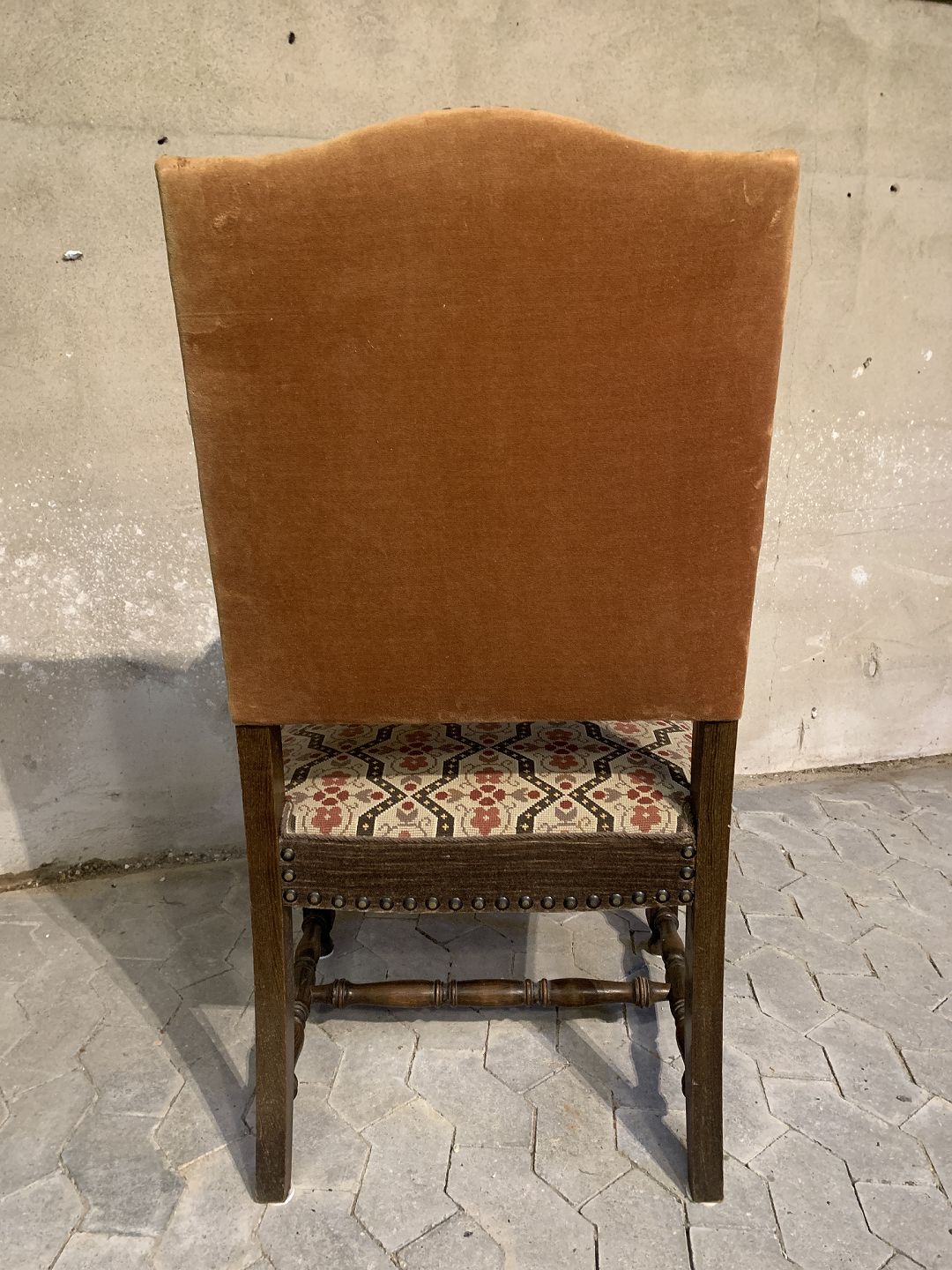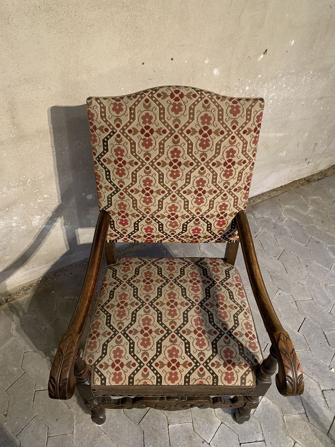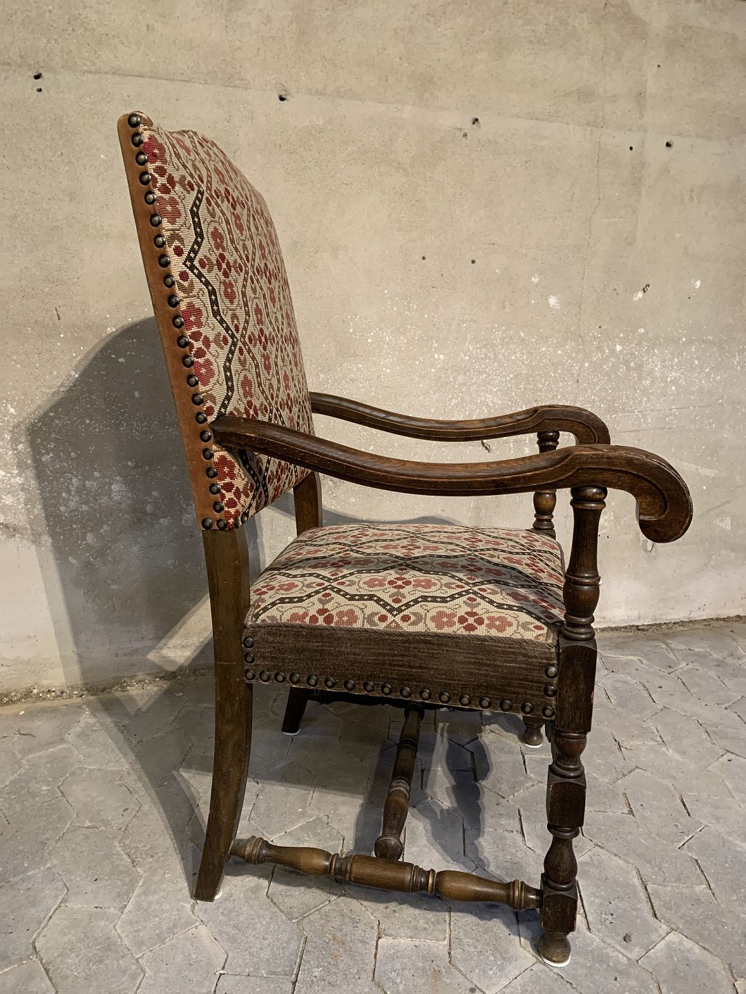 Armstol i massivt egetræ med broderet betræk, fra 1930erne.