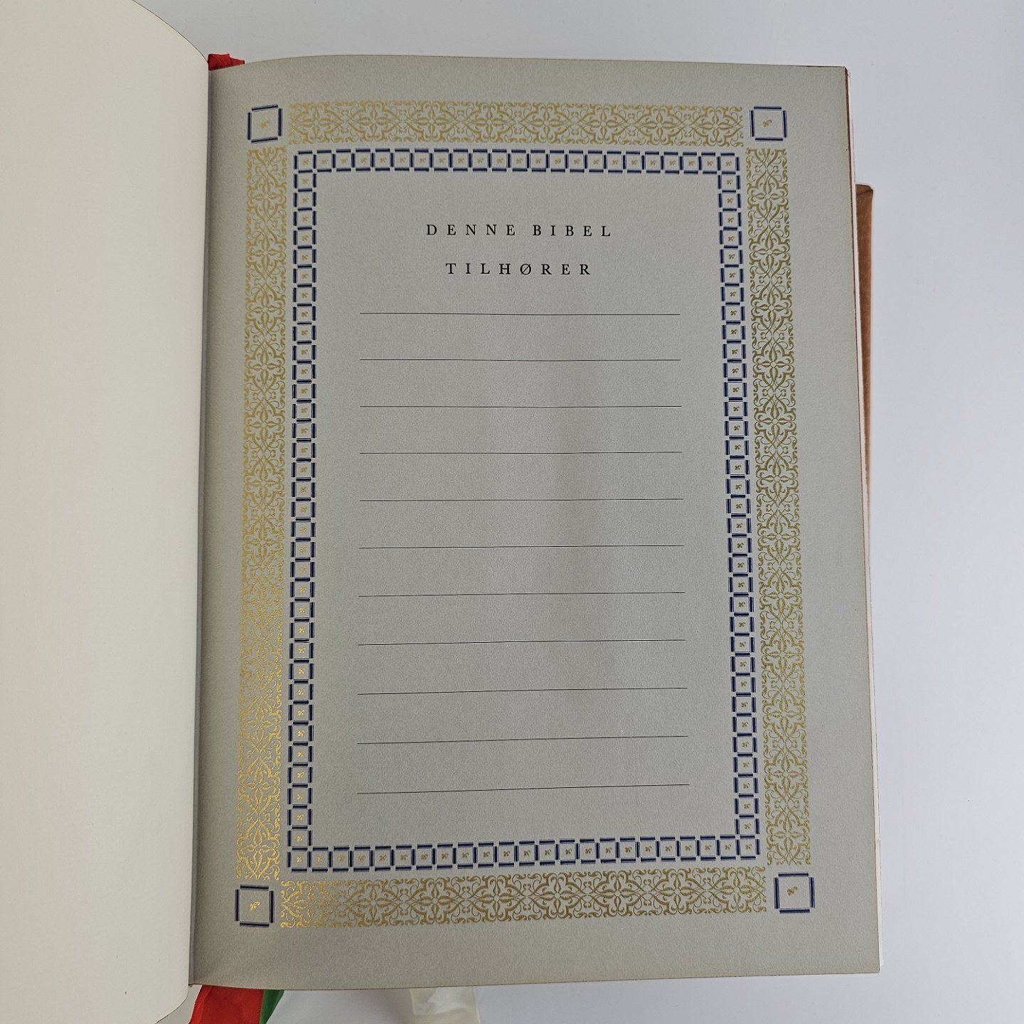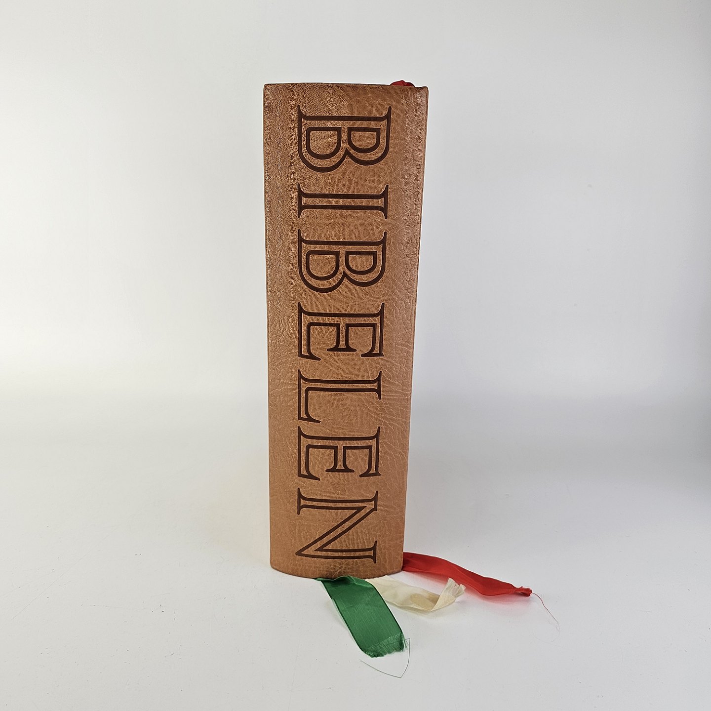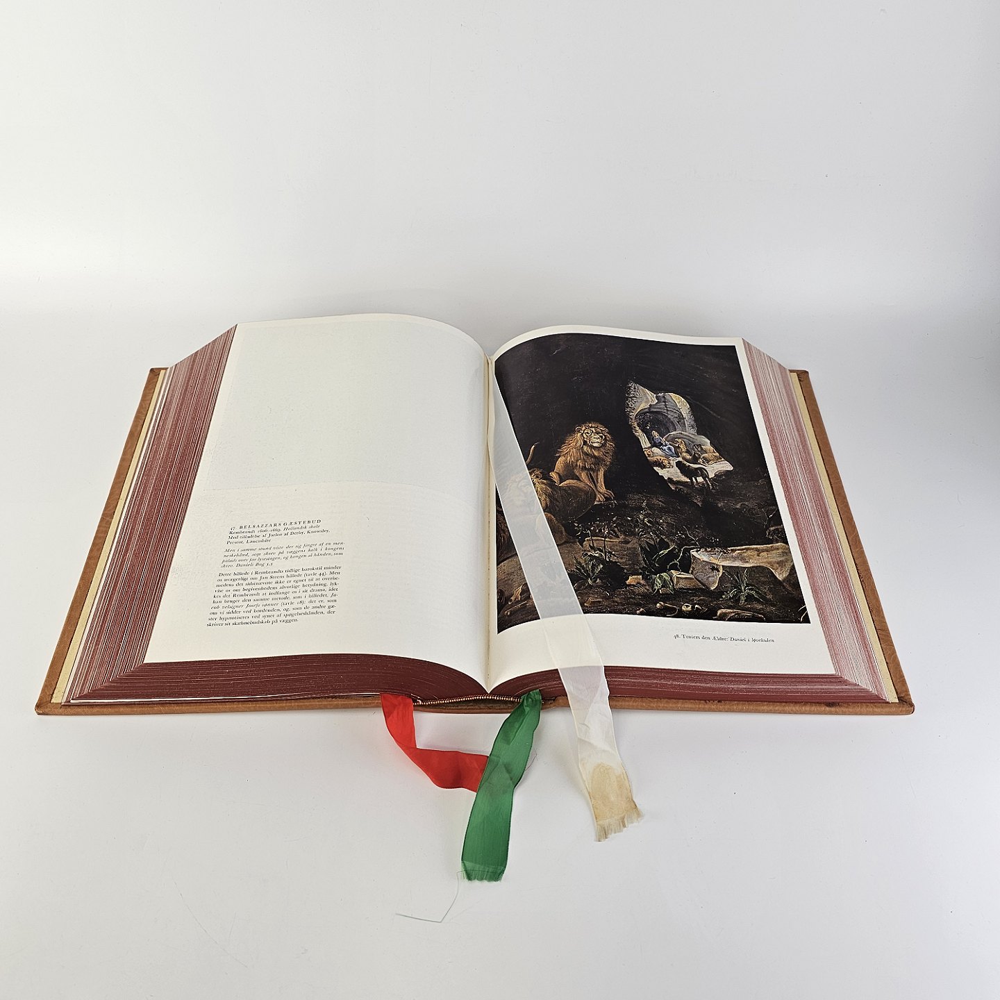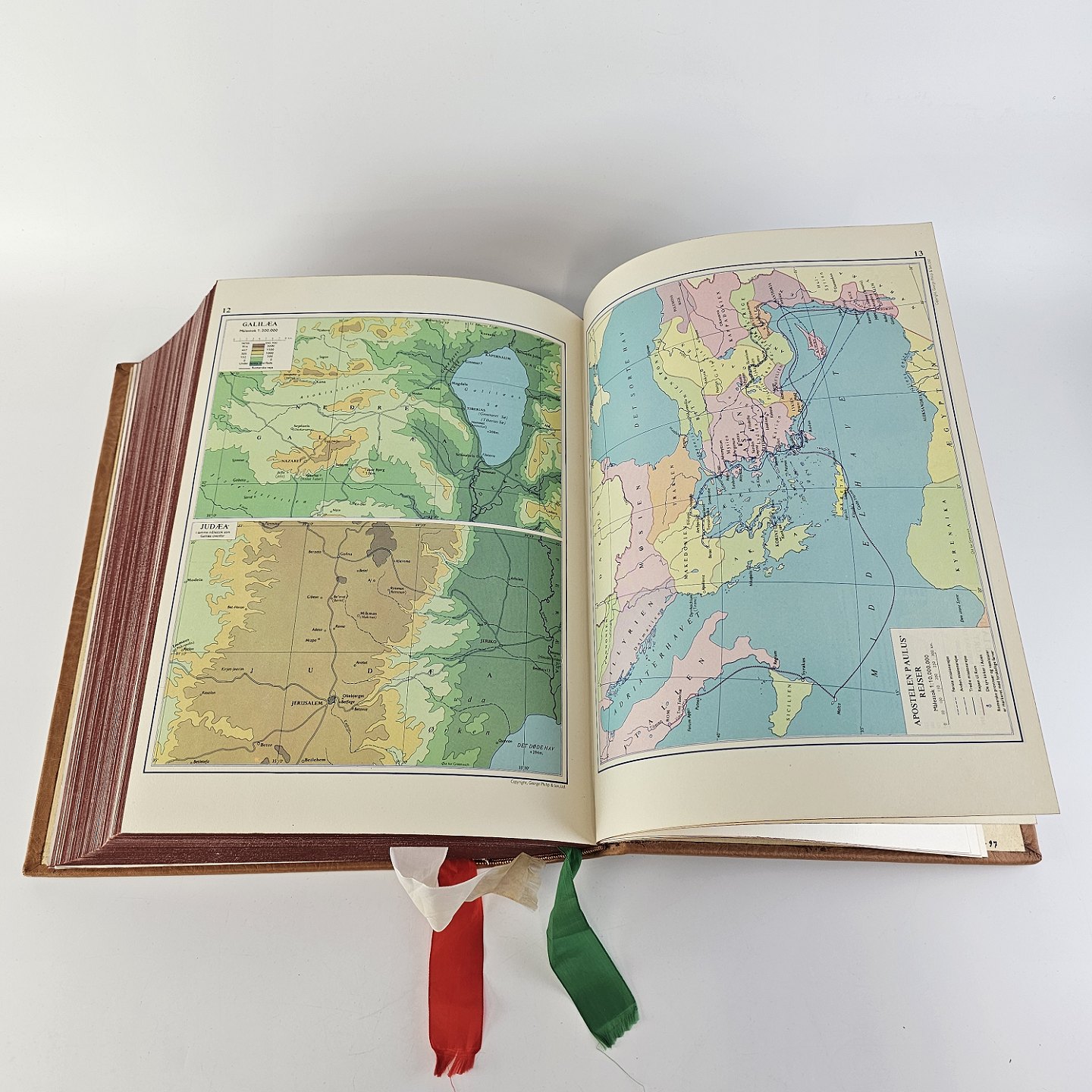 Læderindbundet bibel med farveplancher gengivet efter verdensberømte kunstværker og bibelatlas. Udgivet i 1961.