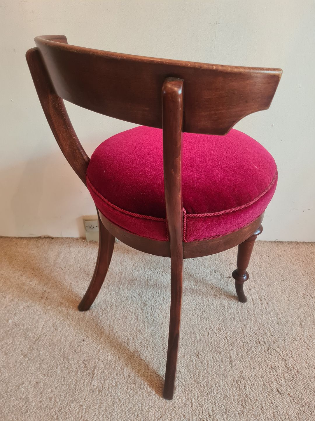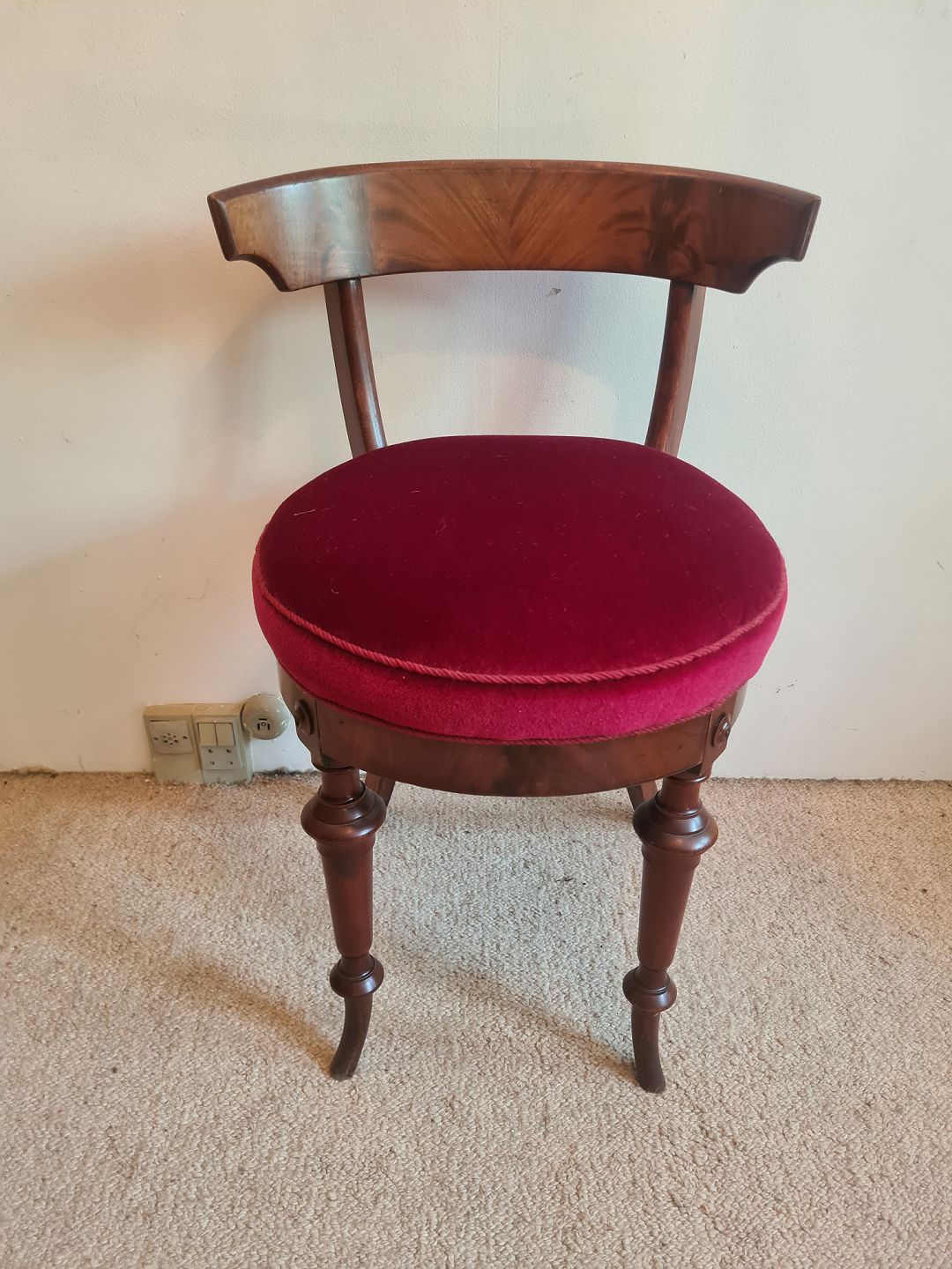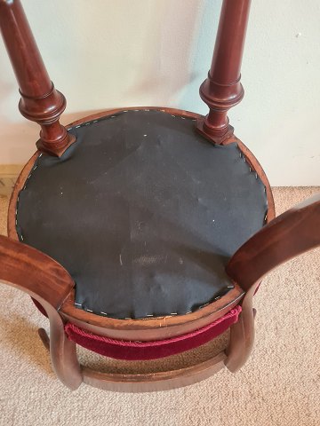 Pianostol fra 1930'erne i mahogni med sæde betrukket i rød velour. Fremstår pæn og velholdt uden nævneværdige brugsspor.