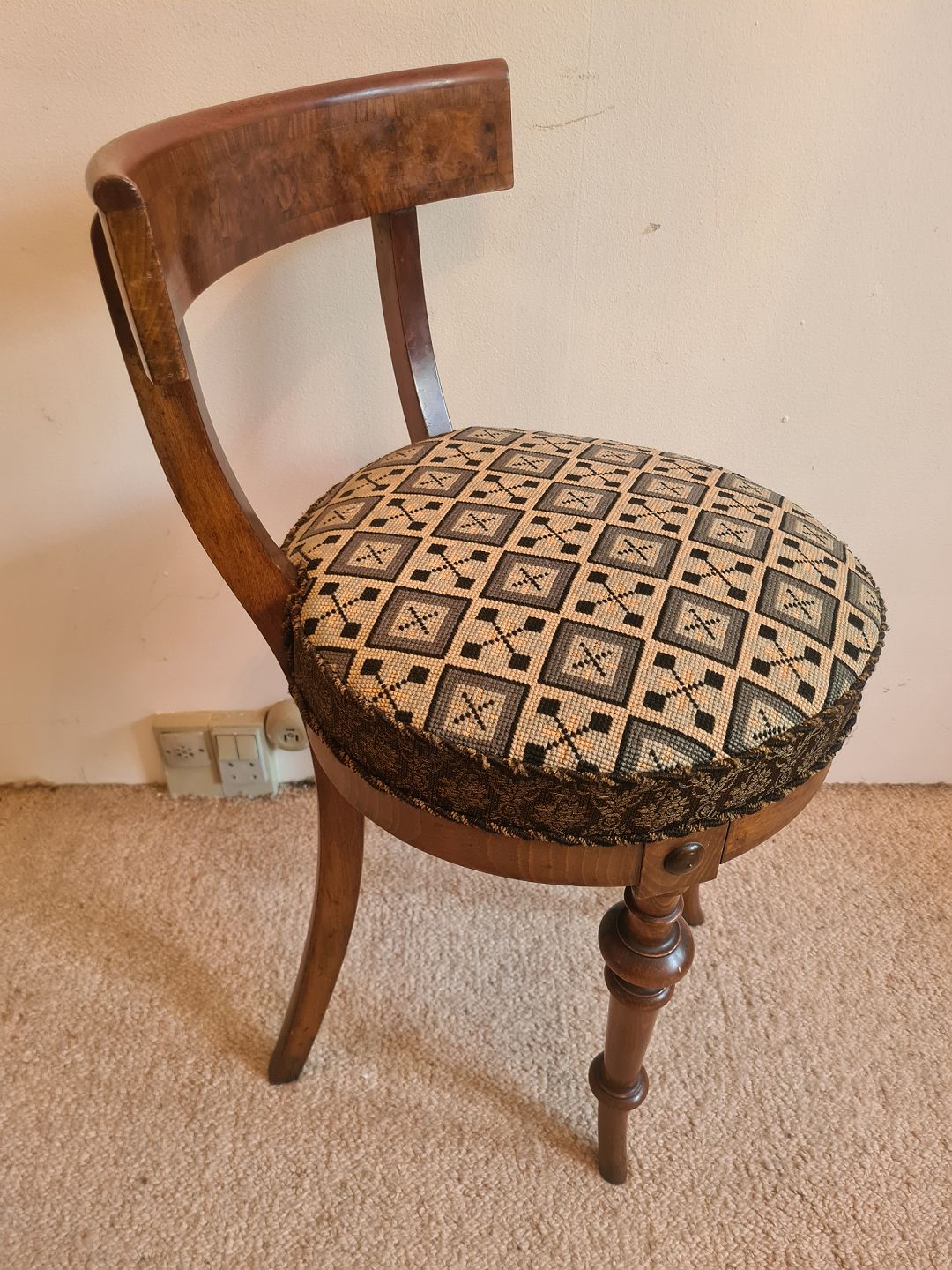 Pianostol fra 1930'erne I mahogni og fyr med broderet sæde. Fremstår pæn og velholdt uden nævneværdige brugsspor.