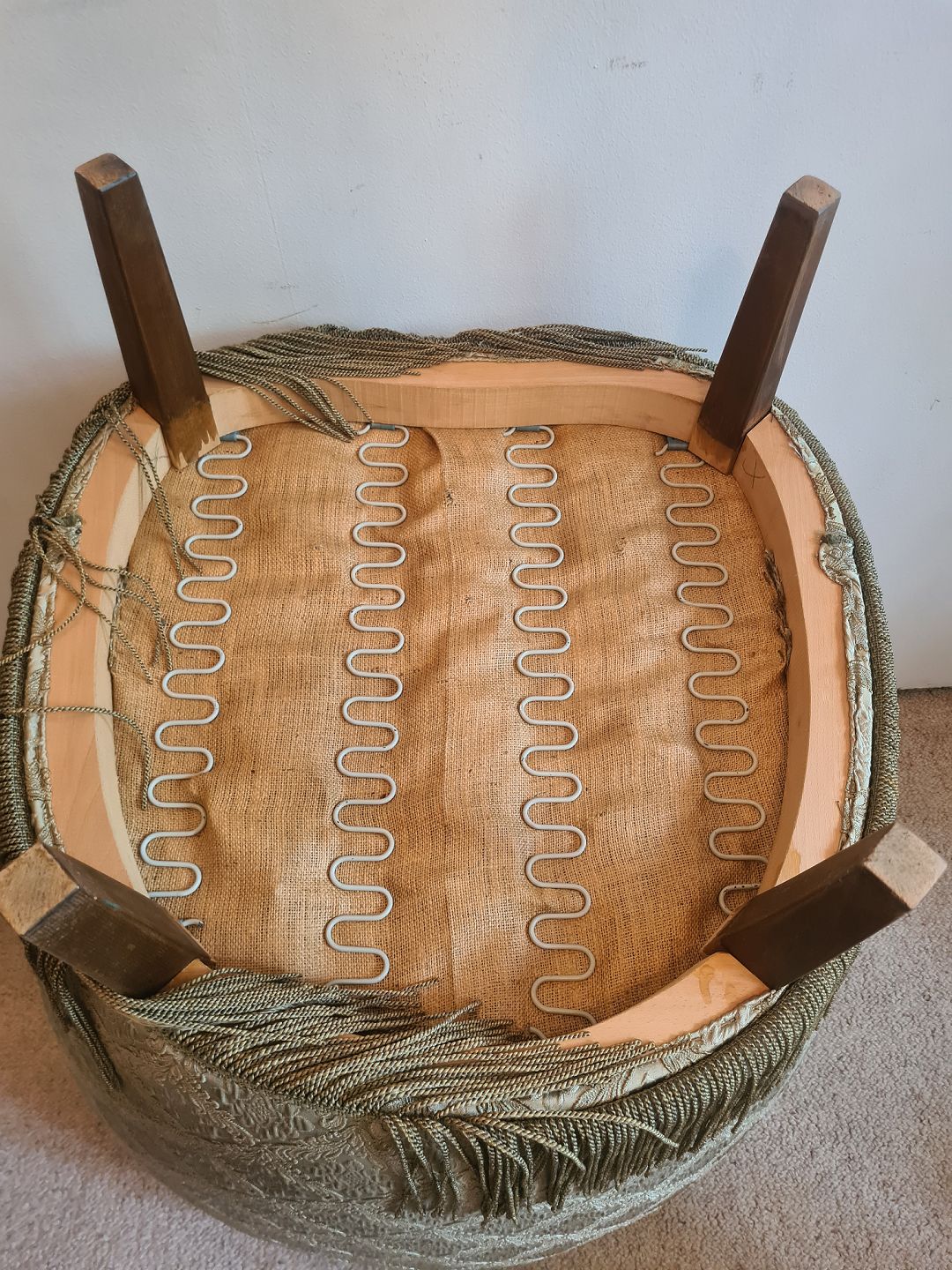 Overpolstret lænestol fra 1940'erne med flæser. Fremstår pæn, god og udmærket stabil, dog med tyndslidt polstring på det yderste af begge armlæn. (Billede)