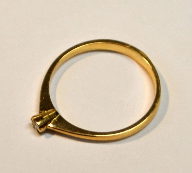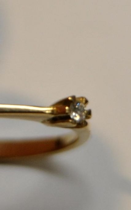 14 karat rødguldsring med brillant, 20. årh. Danmark. Stemplet. Brillant 1/16 Carat. Størrelse: 59. Vægt: 2,0 gram.