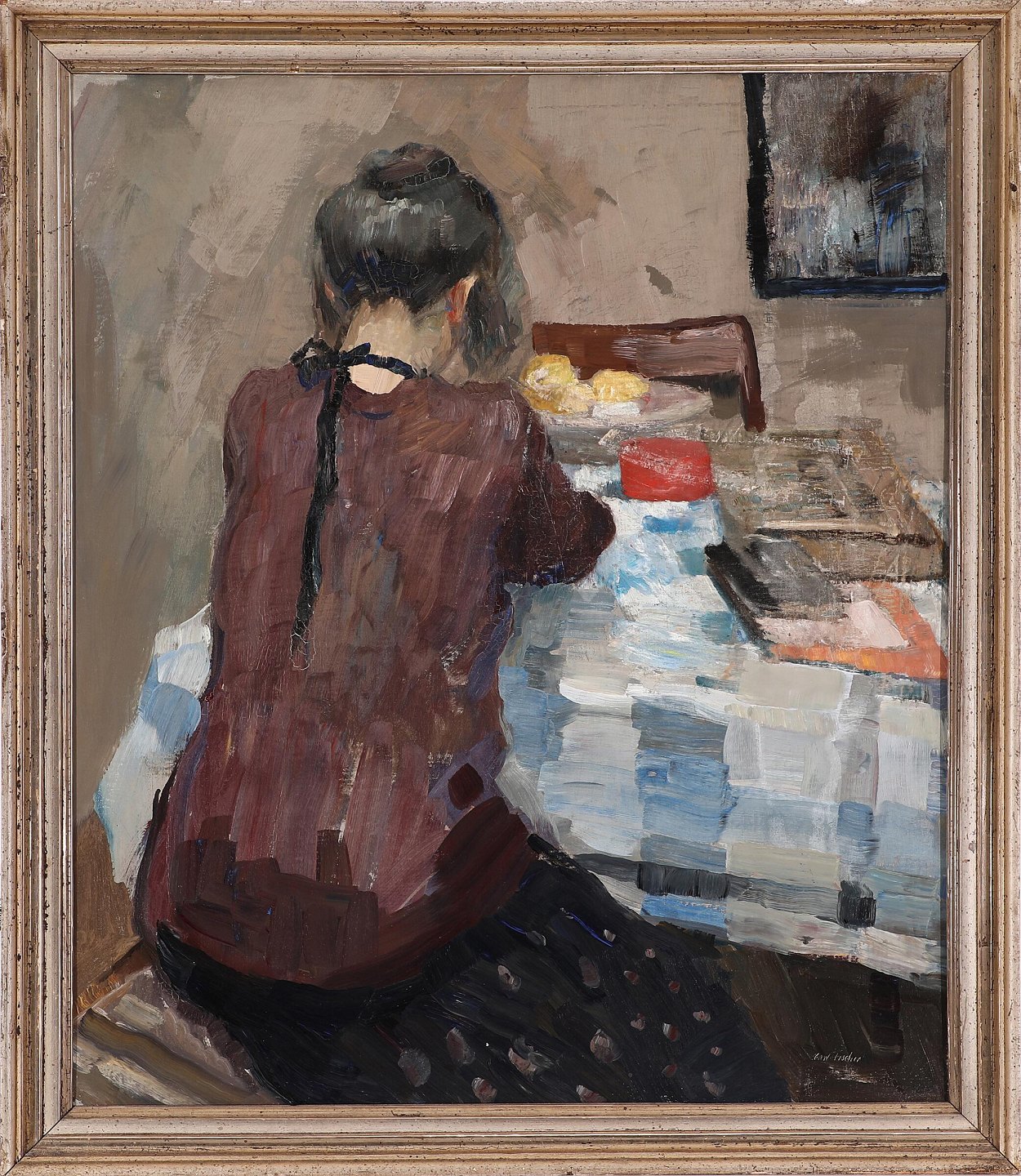"Interiør med rygvendt kvinde" Oliemaleri på lærred i sølv ramme. Smukt maleri lige til at hænge op.