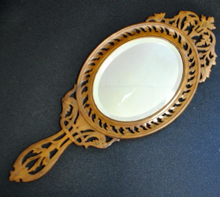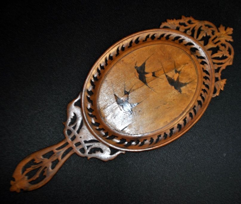 Sorrento håndspejl, 19. årh. Italien. Poleret oliventræ med indlægninger i form af flyvende svaler og tekst: Ricordo. Facetslebet spejl. L.: 40,5 cm. B.: 17 cm.