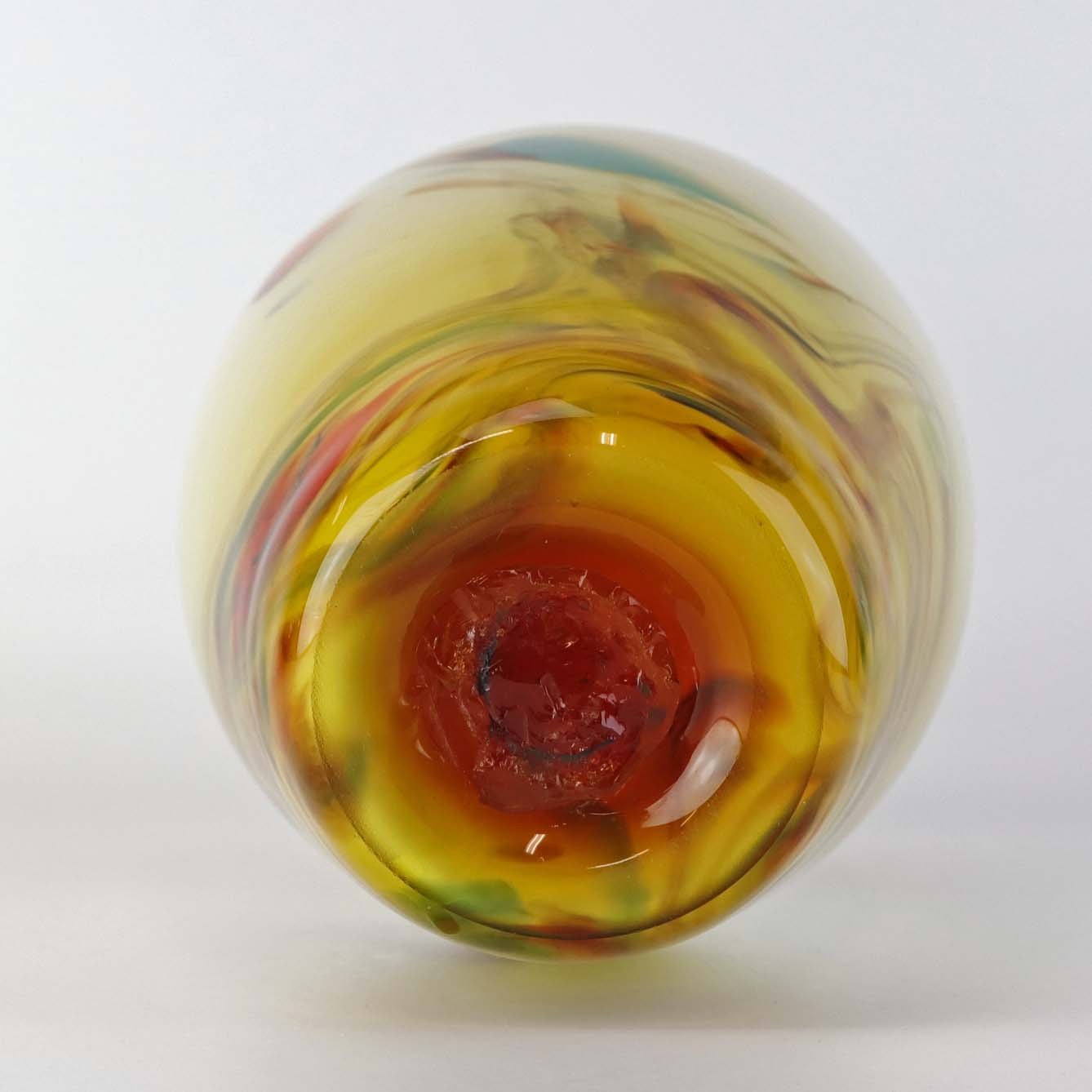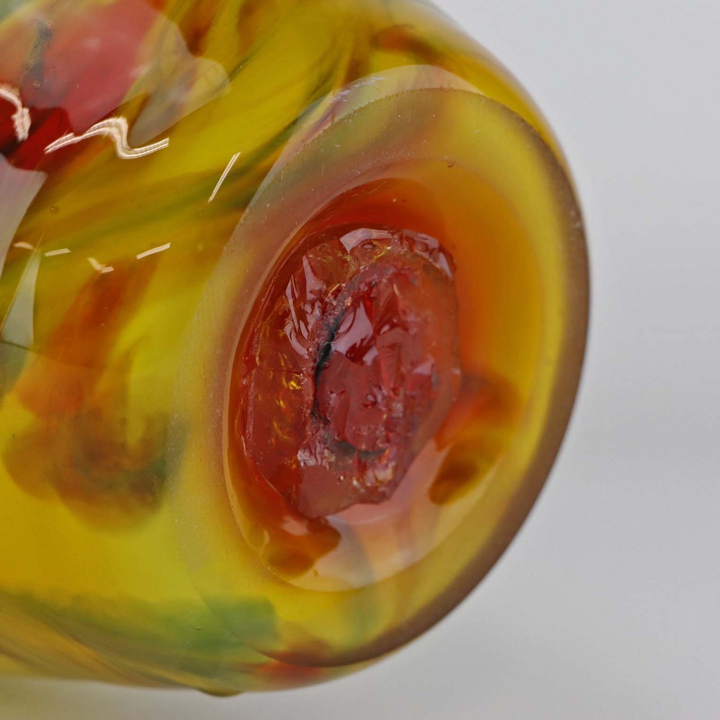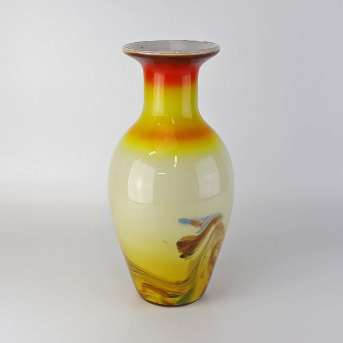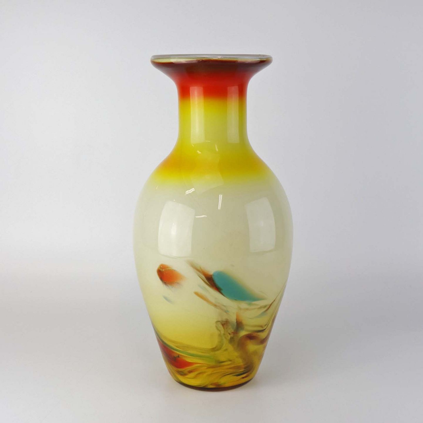 Glasvase med abstrakt motiv i klare røde, orange, gule og blå nuancer. Vasen går også under navnet Snowflake.