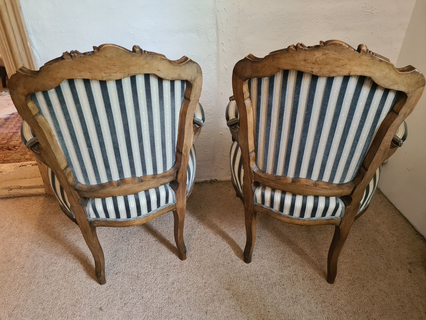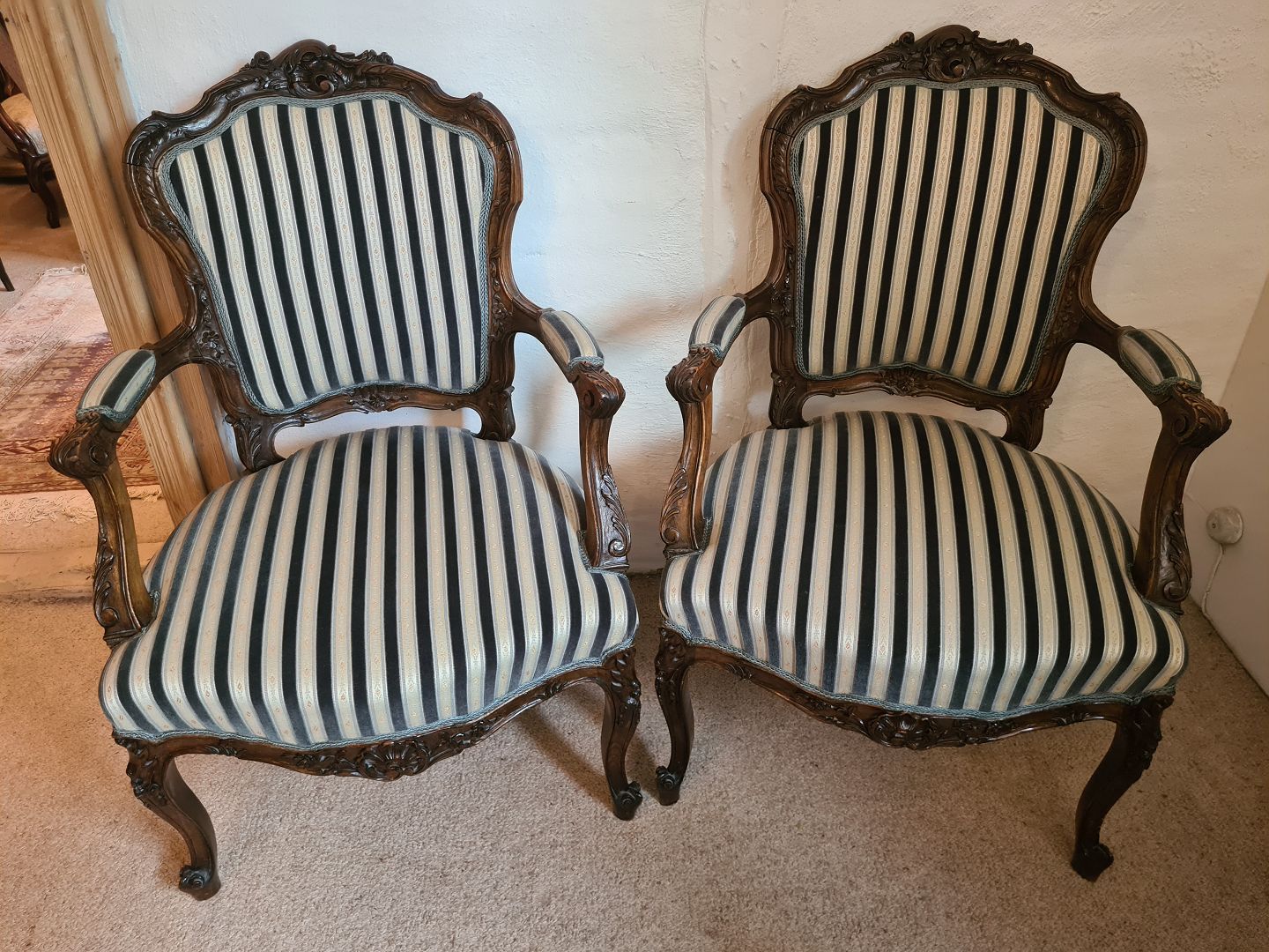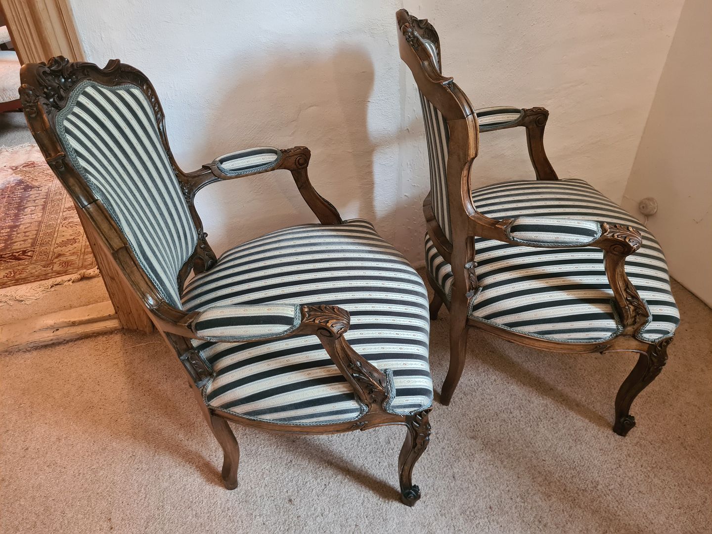 Par rokokostole fra 1950'erne i mahogni og med delvis velour polstring. Fremstår gode og stabile uden nævneværdige brugsspor.