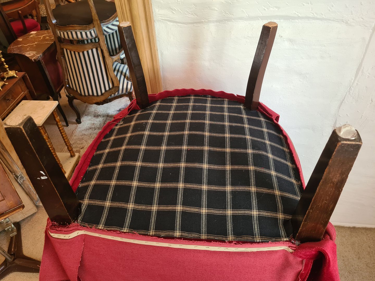Par lænestole fra 1950'erne overbetrukket med rødt velour. Fremstår pæne og velholdte uden nævneværdige brugsspor.