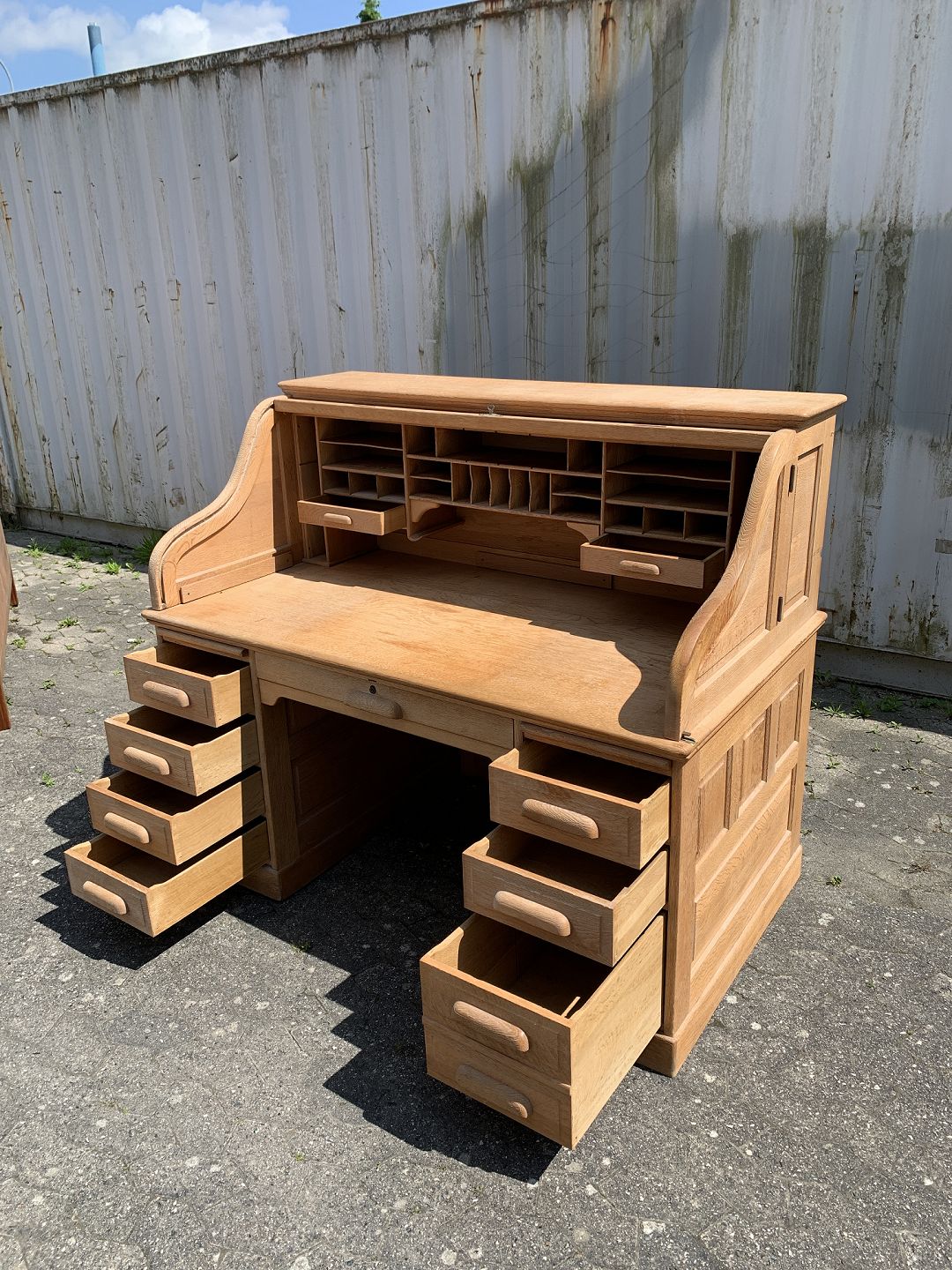 Text available in Danish: Amrikansk skrivebord i massivt egetræ, fra 1920erne.