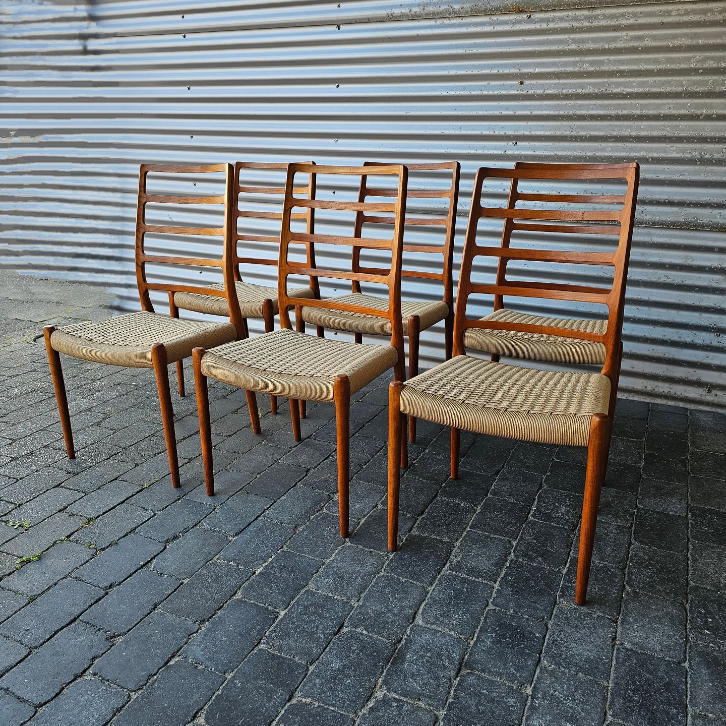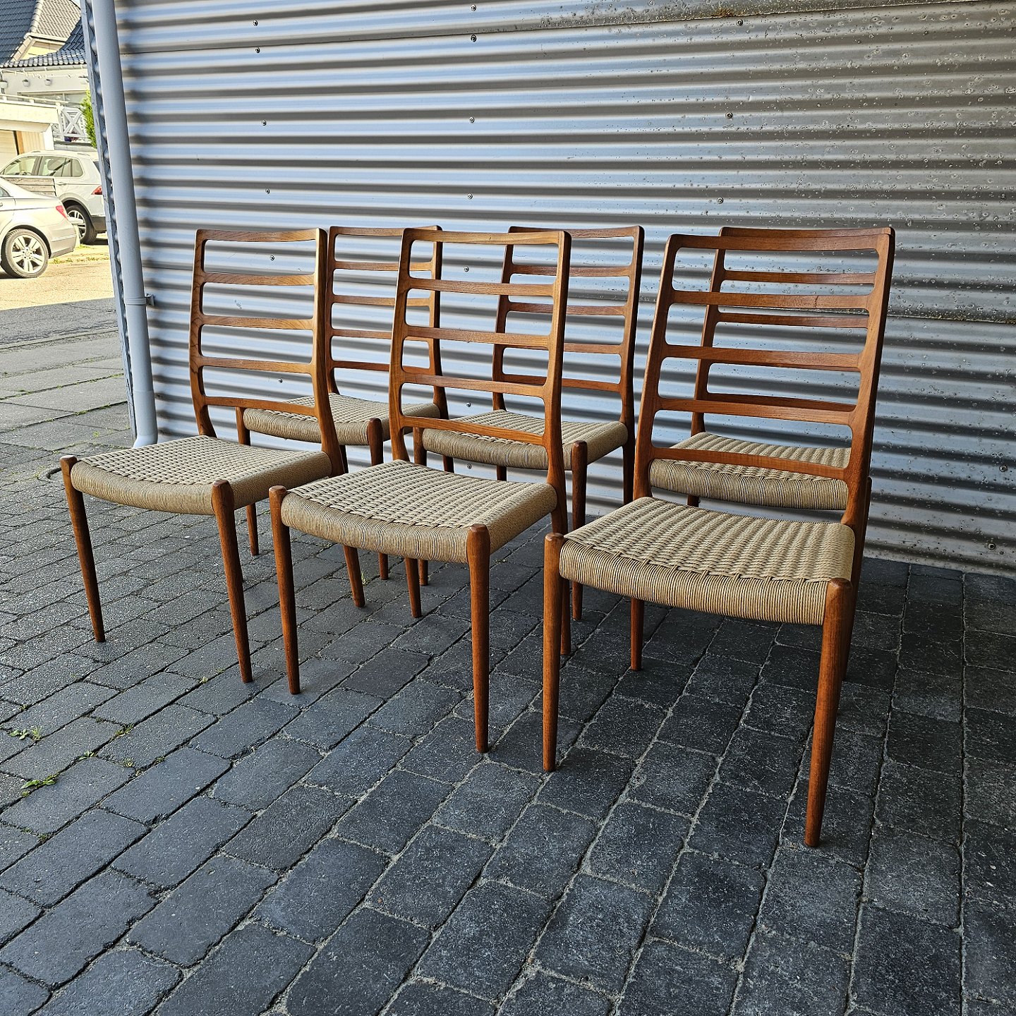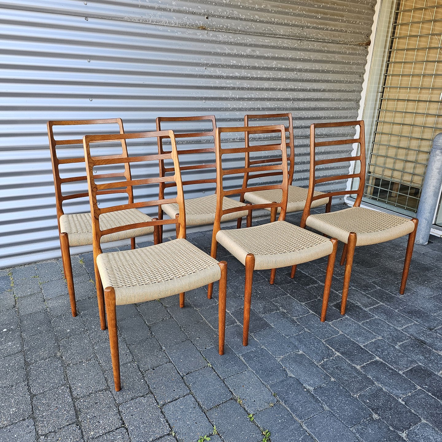 Sæt med seks styk spisebordsstole model 82 i teaktræ med ny flettede sæder, og nyrenoverede