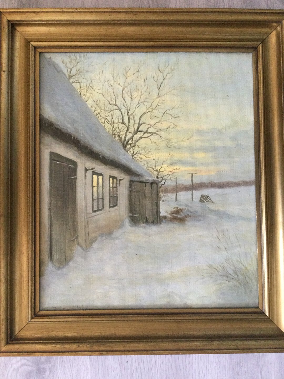 Maleri af William Henriksen - Vinterparti ved stråtækt gård